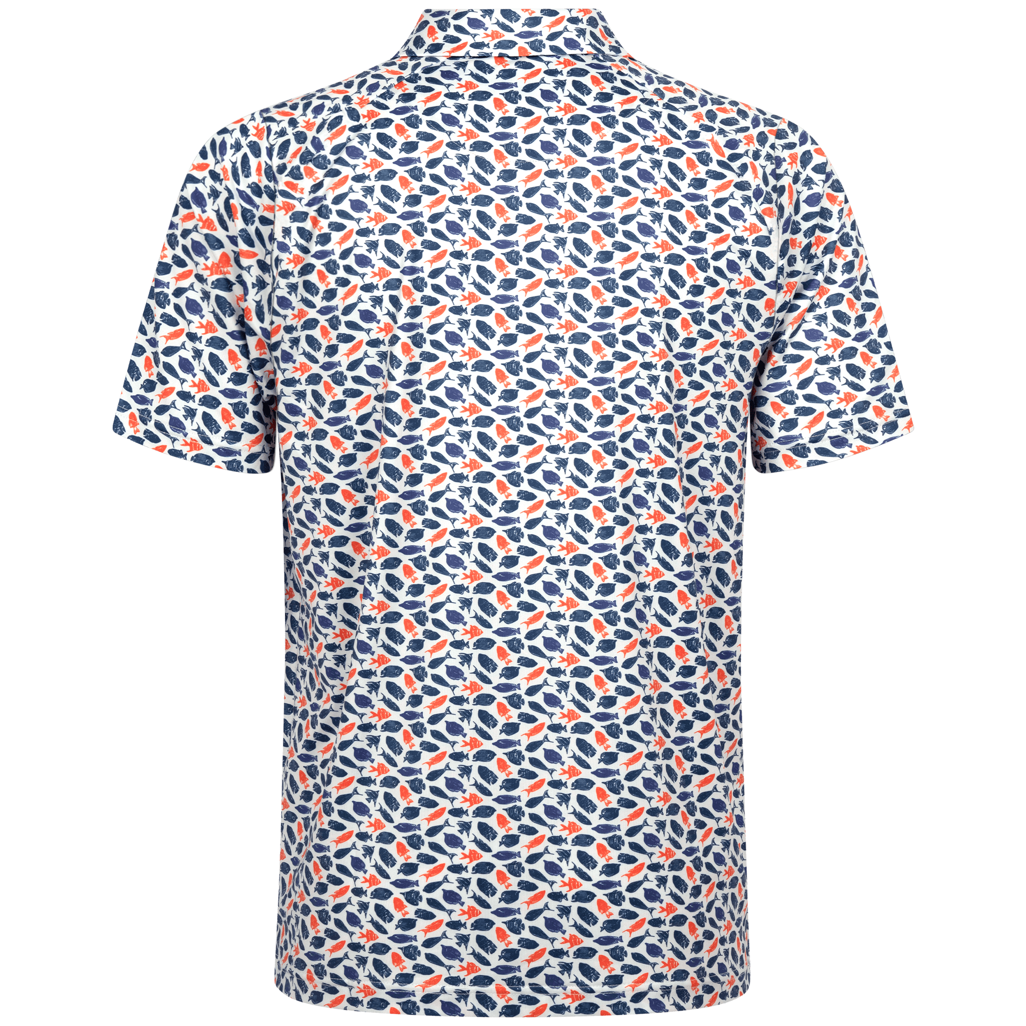 Made with moisture-wicking fabric, the Aquarium polo will keep you cool and dry during every round, while an anti-bacterial finish ensures lasting freshness. Featuring UPF 50+ protection, this polo guards against harmful sun rays, making it ideal for long days outdoors. Designed with a self-fabric collar and built-in collar stay, it maintains a crisp, polished look, and forward shoulder seams provide enhanced mobility. The high-low hem with side slits adds modern flair and extra flexibility, while the all-over print brings a vibrant touch to your golf wardrobe.