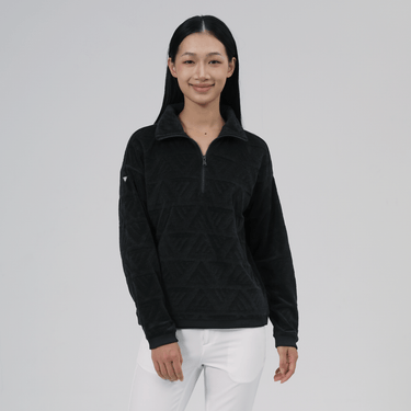 The women's Camden quarter-zip features a jacquard knit with a subtle logo for a modern, textured look. Designed with a quarter-zip and fold-down collar, this versatile piece offers adjustable coverage and a refined silhouette. Ribbed cuffs and a body band provide a secure and comfortable fit, while the 97% polyester and 3% spandex blend delivers flexibility and durability. Whether worn as a layer or on its own, the women's Camden is an elegant and practical addition to your wardrobe.
