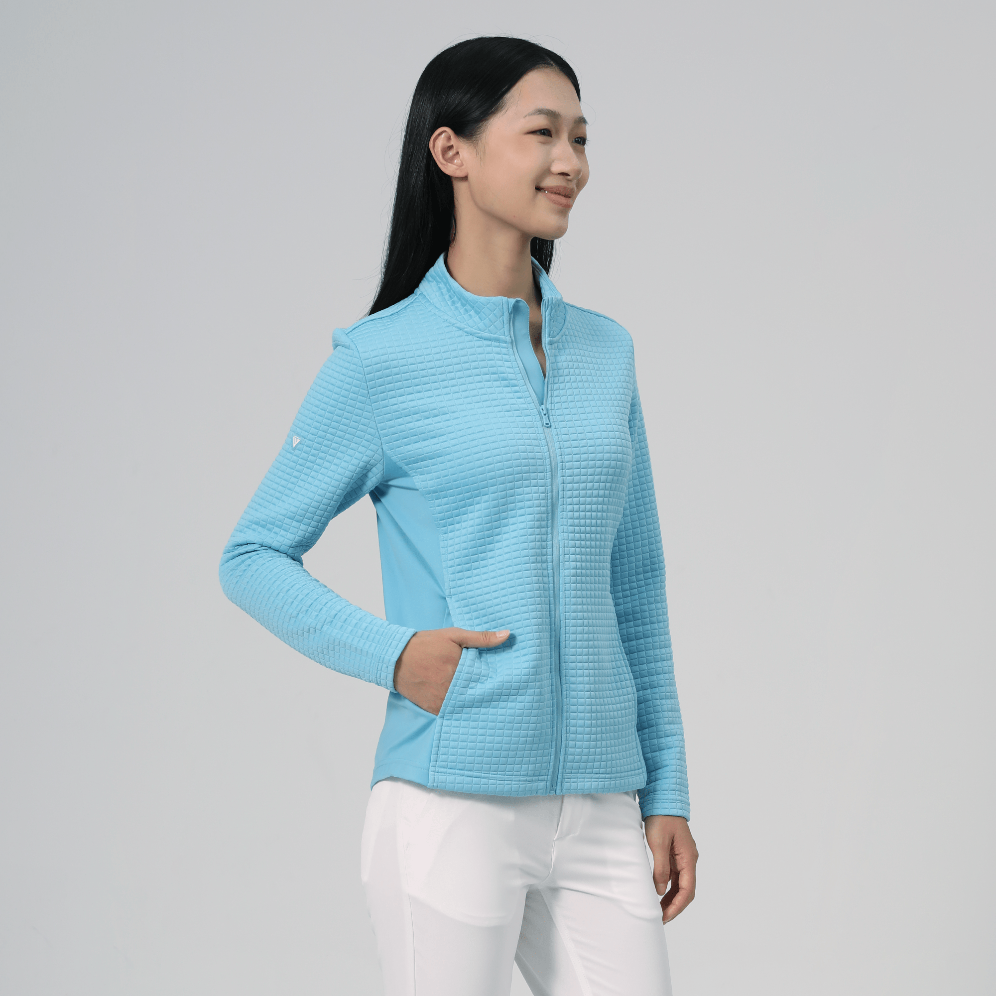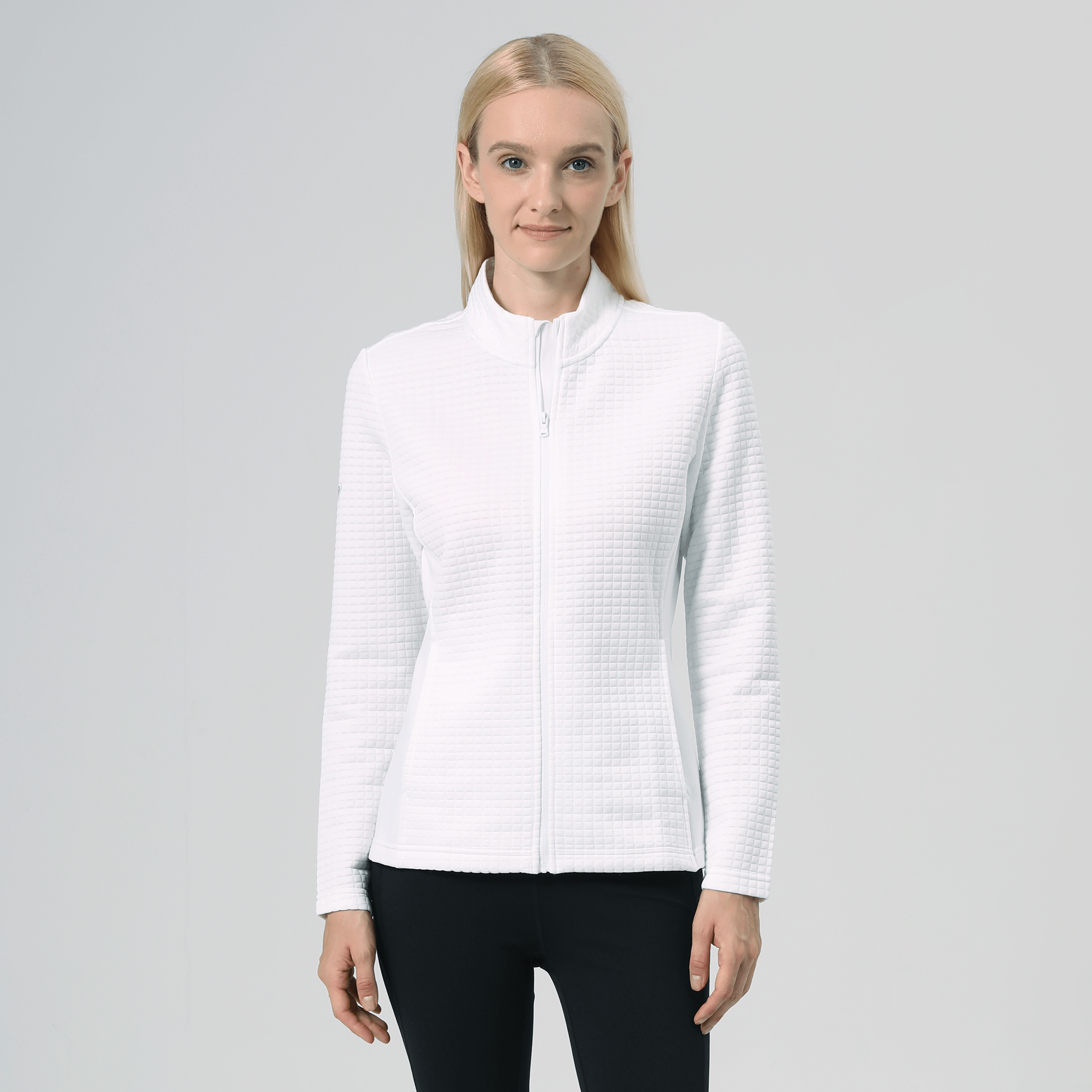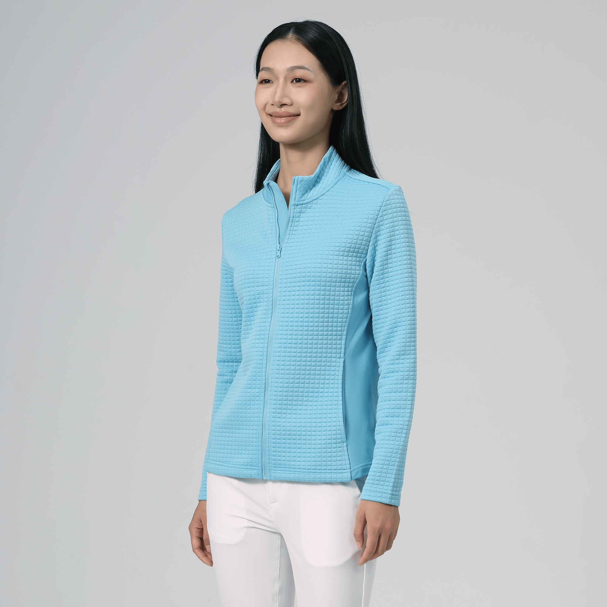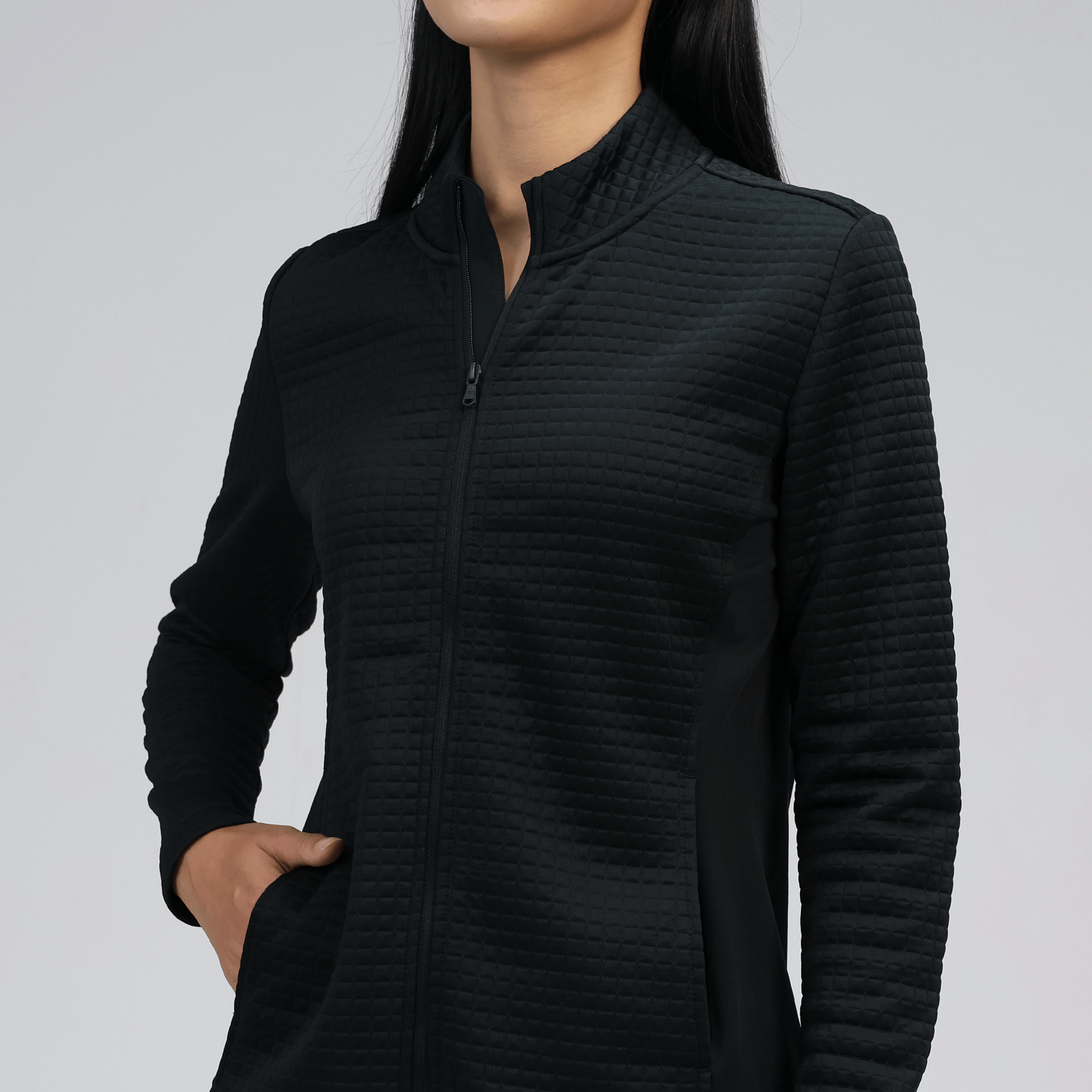 The women's Tailgate layering piece is made from a blend of 96% polyester and 4% spandex, it features textured self-fabric for a refined look and feel. The full front zip with a stand-up collar offers adjustable coverage, while forward shoulder seams enhance mobility. Contrast solid side panels add a modern touch, complementing the high-low hem detail for added comfort and coverage. Crafted from recycled materials, this jacket is both sustainable and practical, making it perfect for active or casual wear.