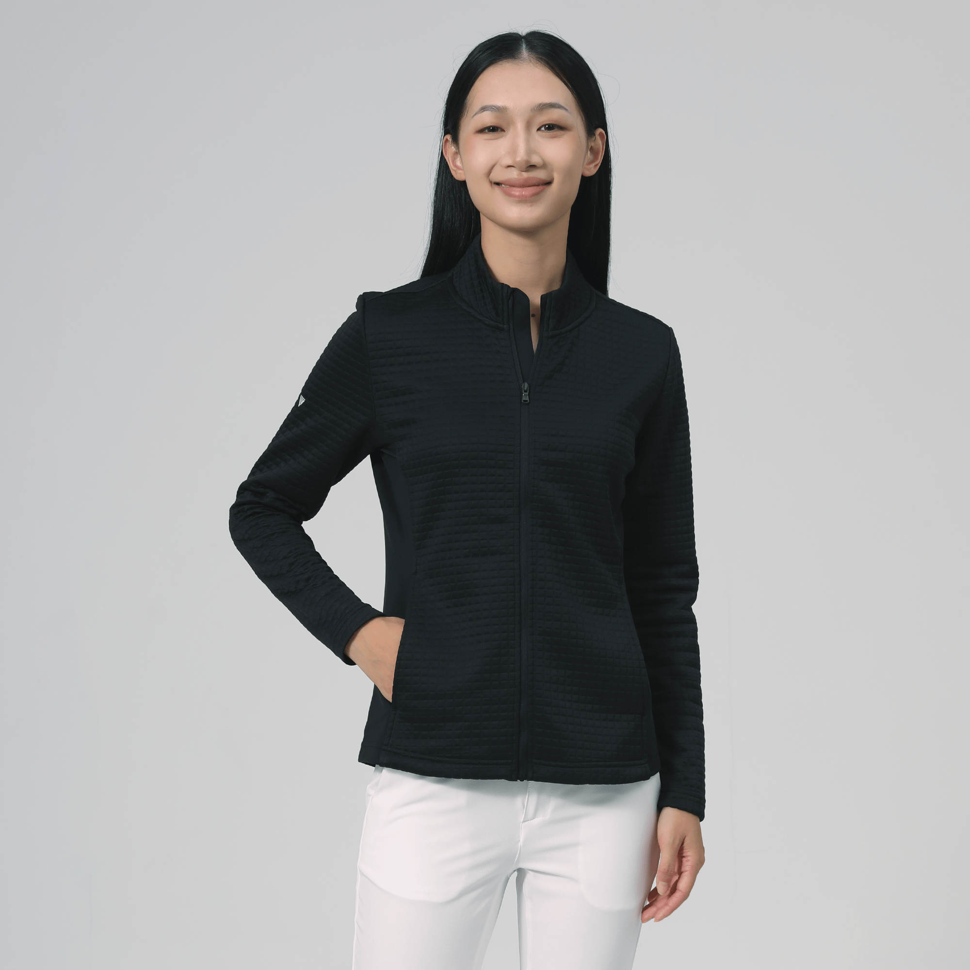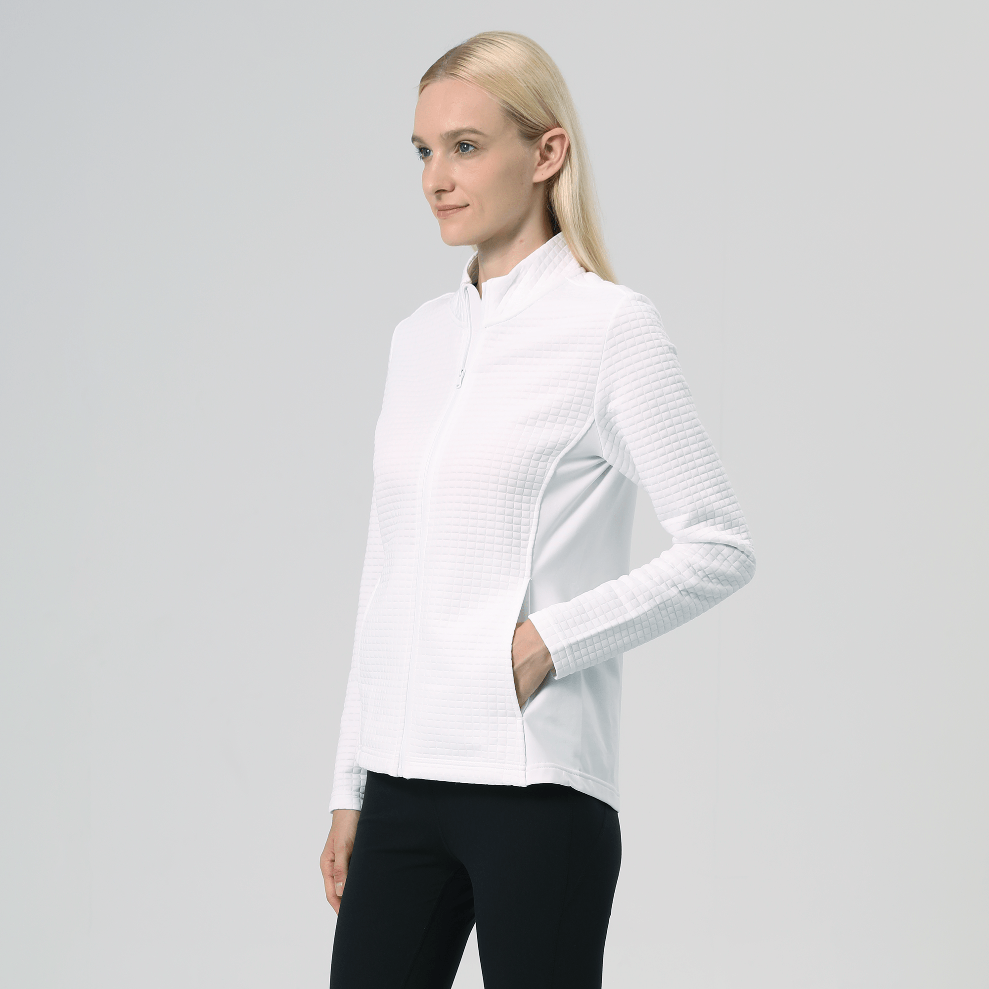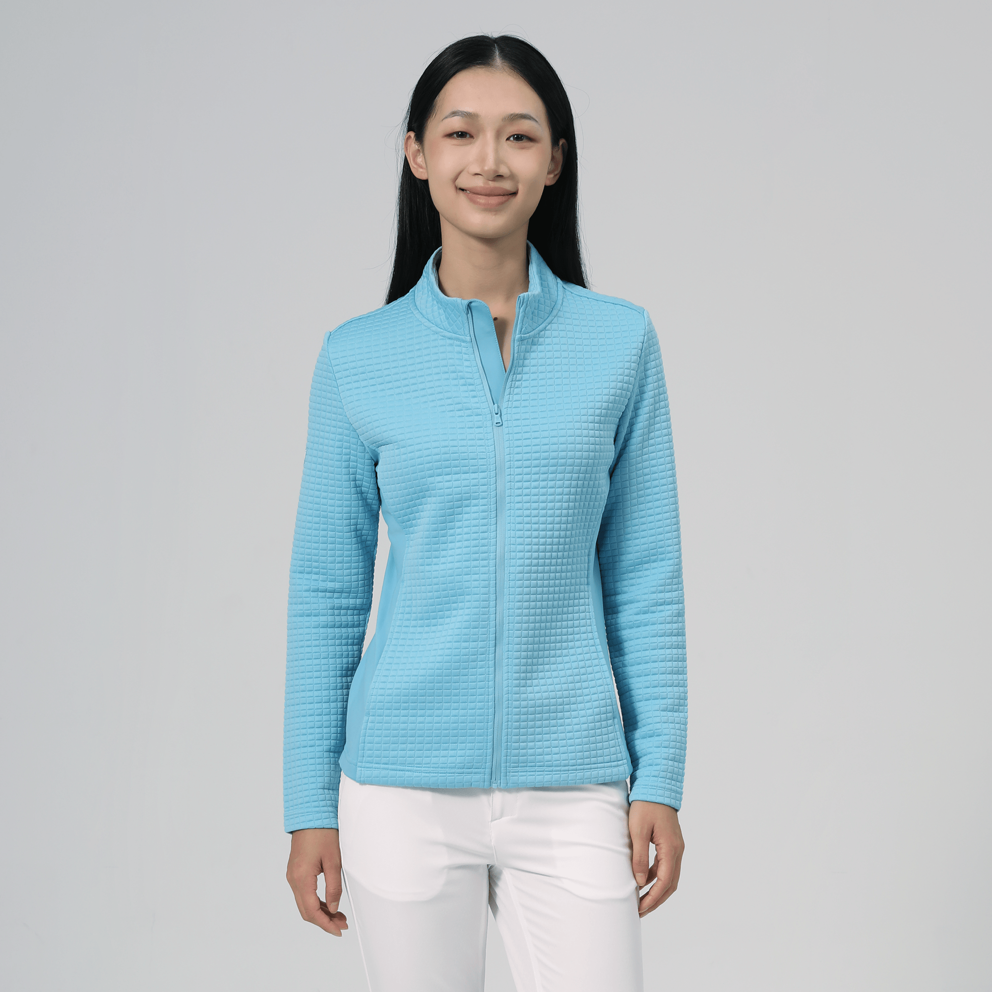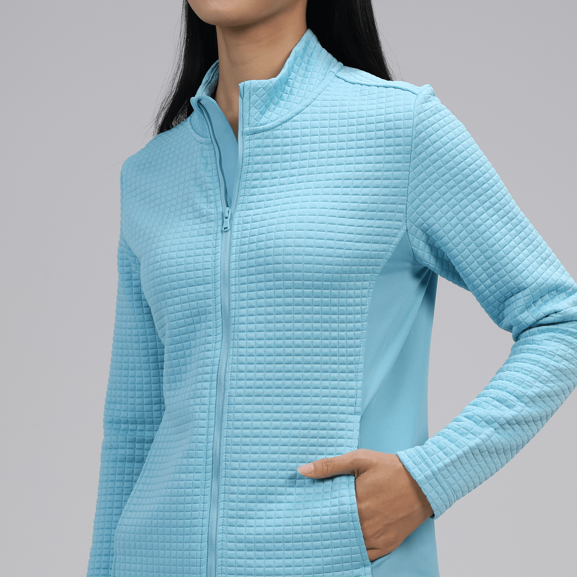 The women's Tailgate layering piece is made from a blend of 96% polyester and 4% spandex, it features textured self-fabric for a refined look and feel. The full front zip with a stand-up collar offers adjustable coverage, while forward shoulder seams enhance mobility. Contrast solid side panels add a modern touch, complementing the high-low hem detail for added comfort and coverage. Crafted from recycled materials, this jacket is both sustainable and practical, making it perfect for active or casual wear.