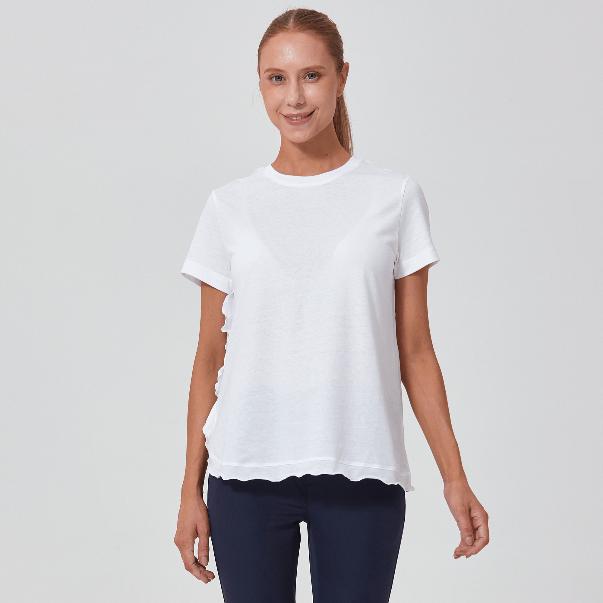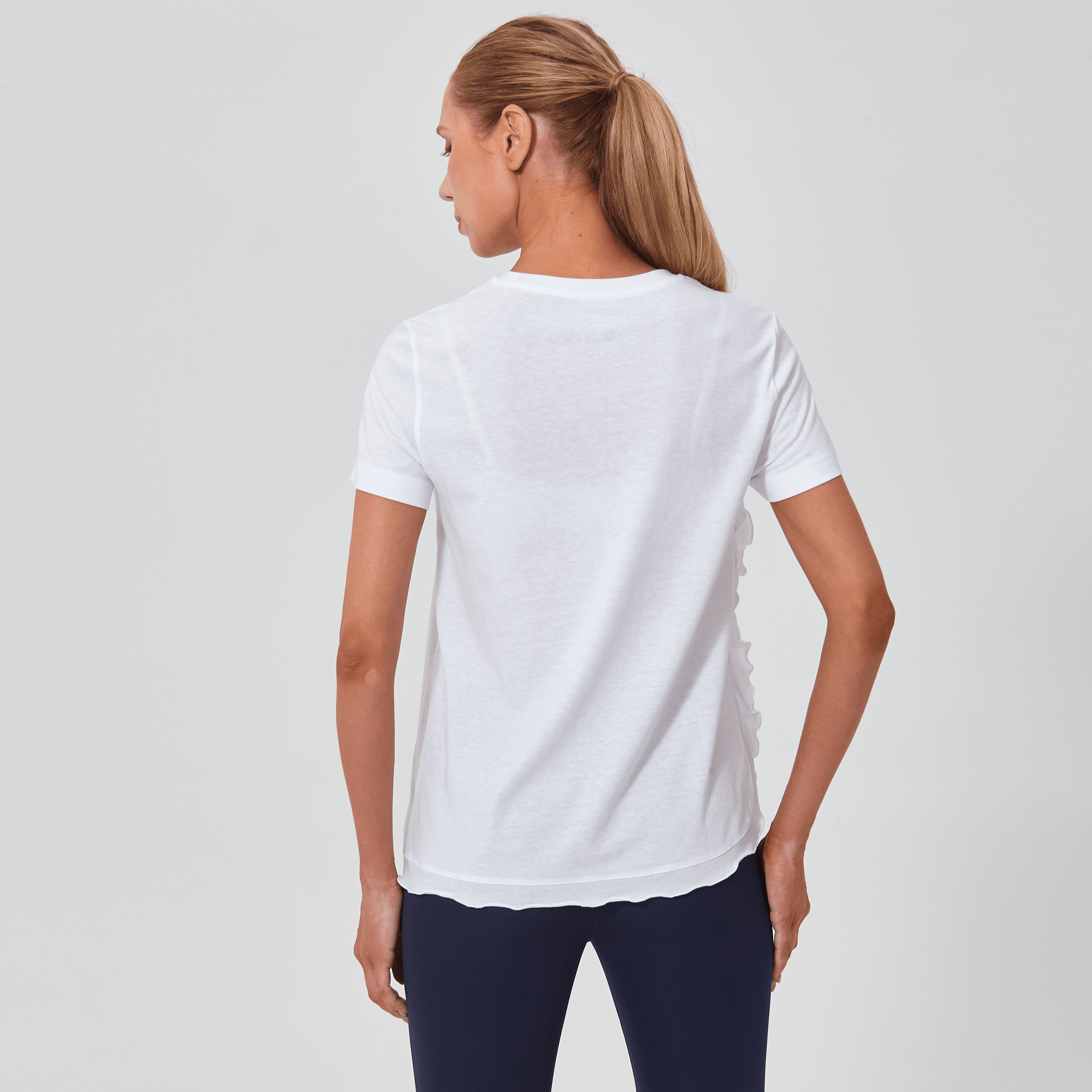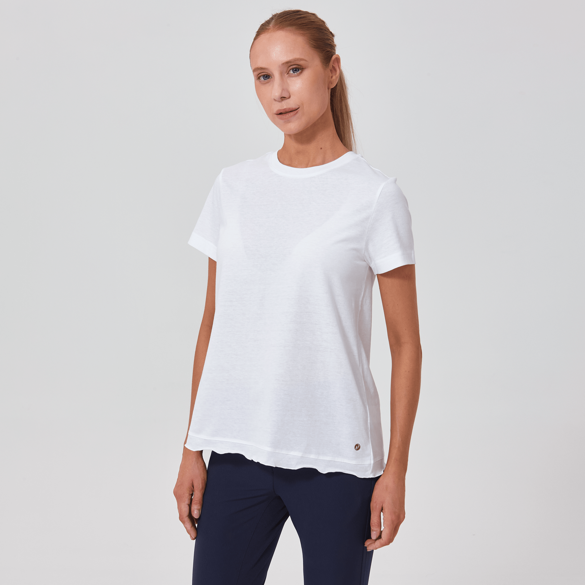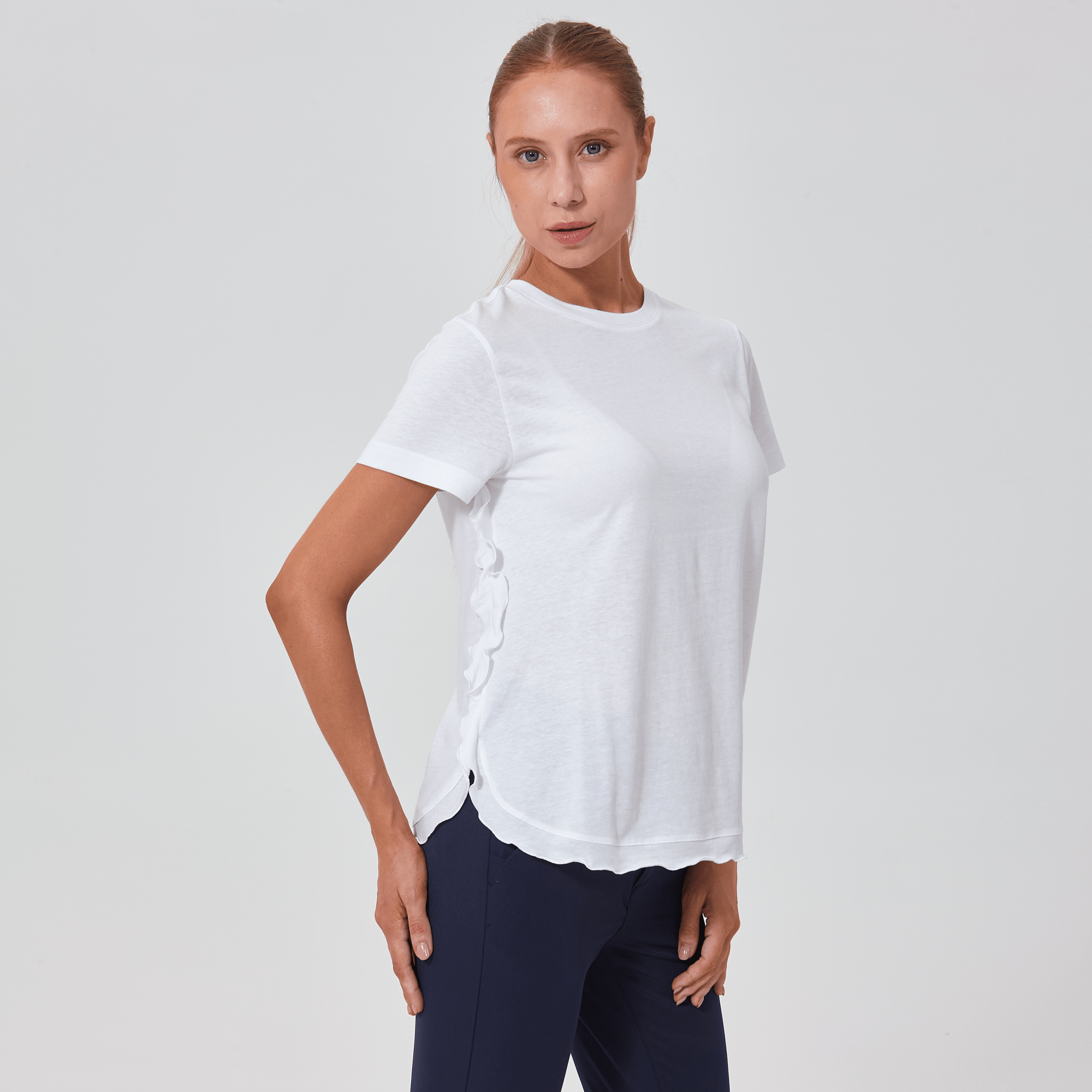 The Verve Airflow t-shirt is a delightful addition to any casual wardrobe. Designed with a flowing A-line silhouette, this top is crafted from a soft mix of 60% cotton and 40% polyester, ensuring breathability and ease of wear. A charming flounced detail runs along the side seam to the body hem, adding a playful and graceful touch to the garment. Whether you're running errands or enjoying a weekend brunch, the Airflow t-shirt is perfect for those who love a relaxed yet stylish look.