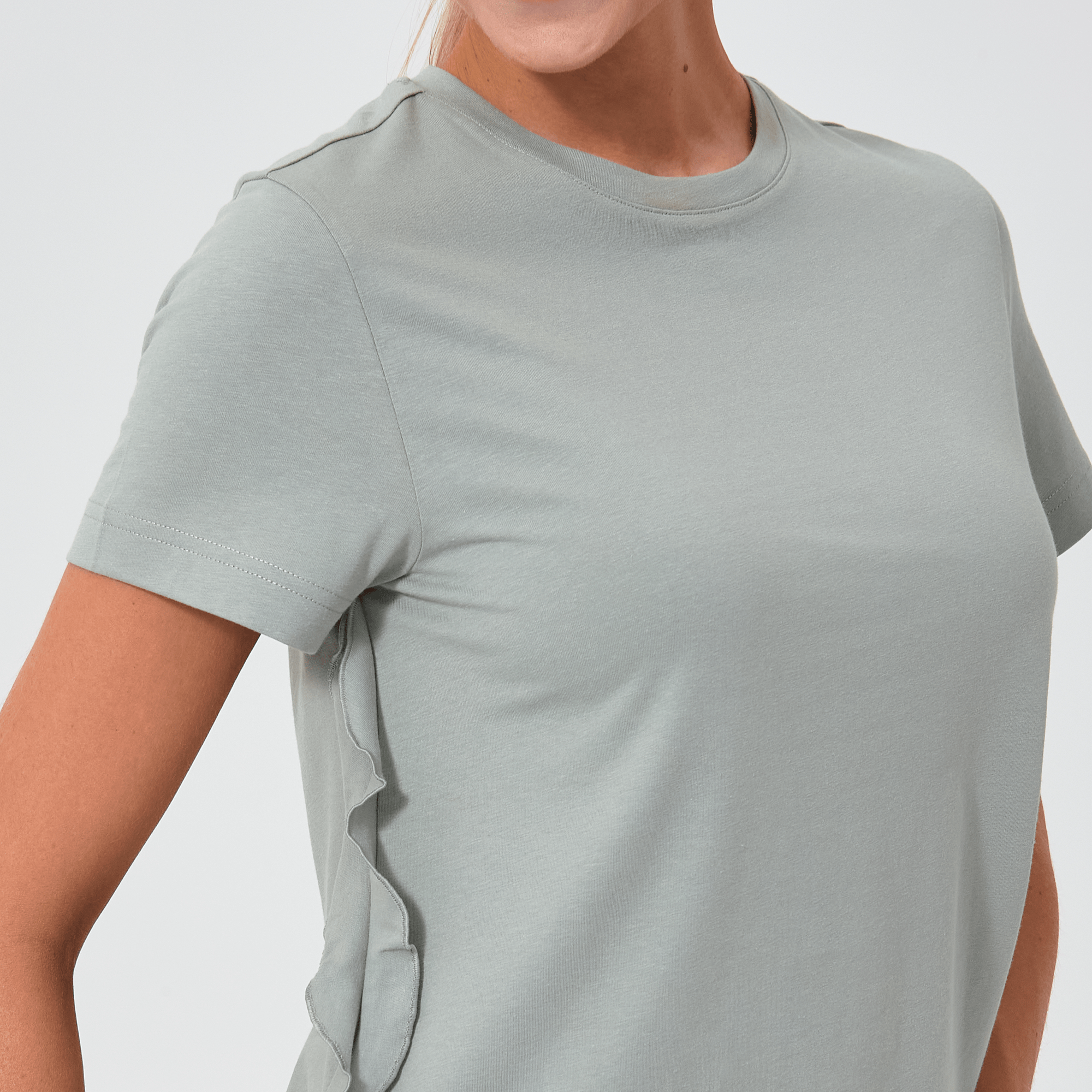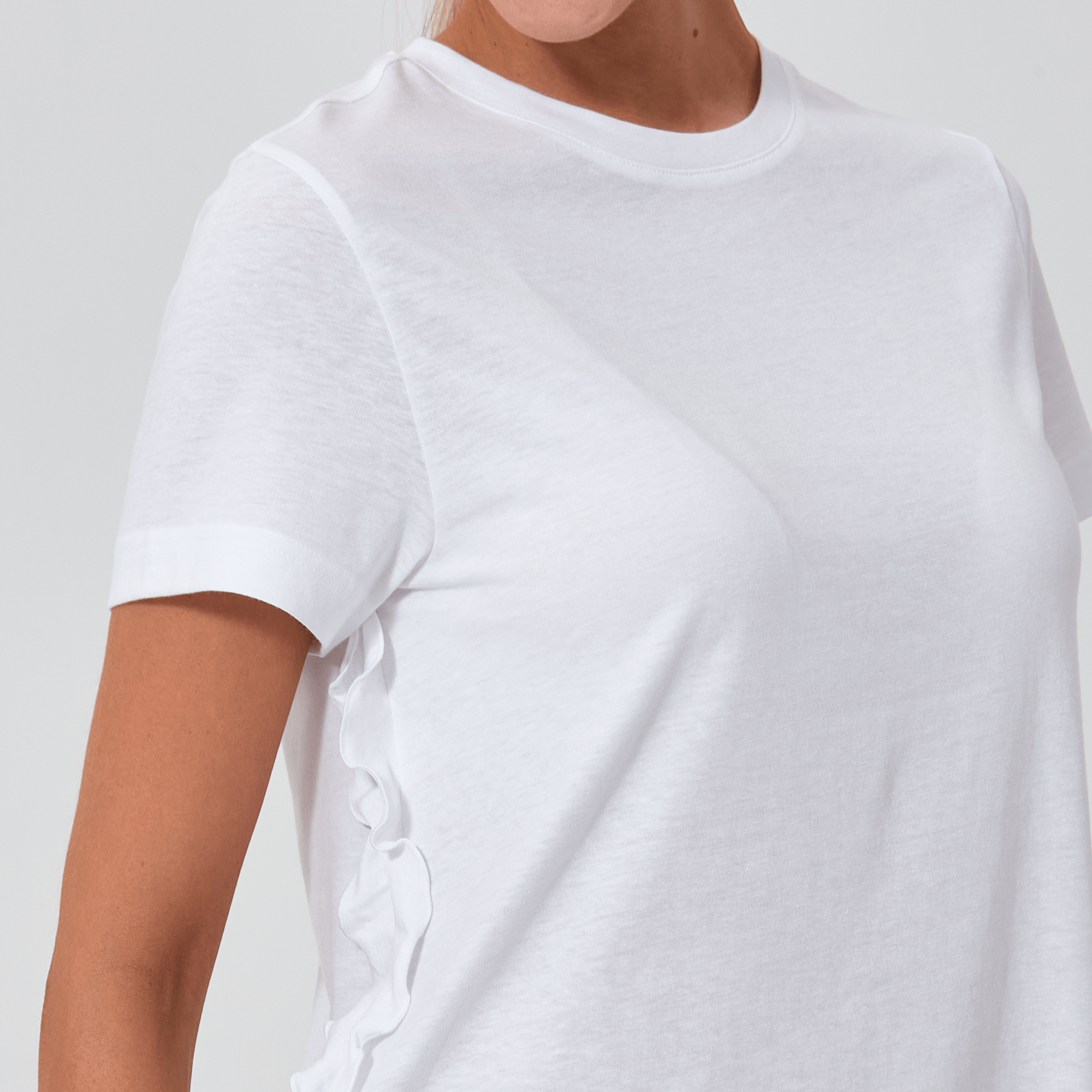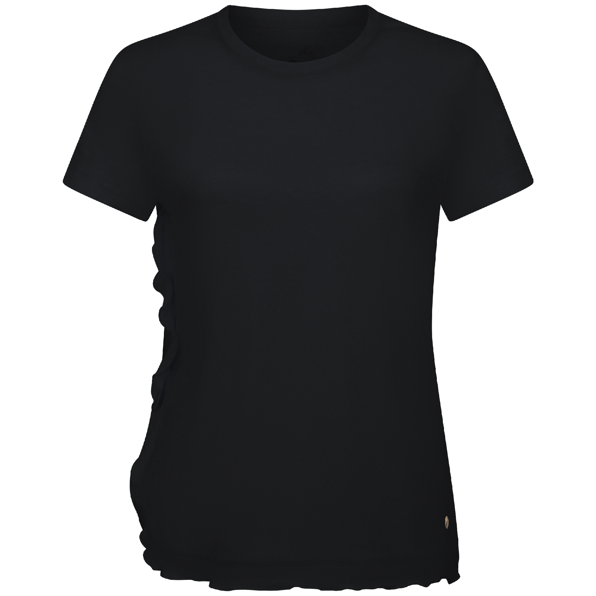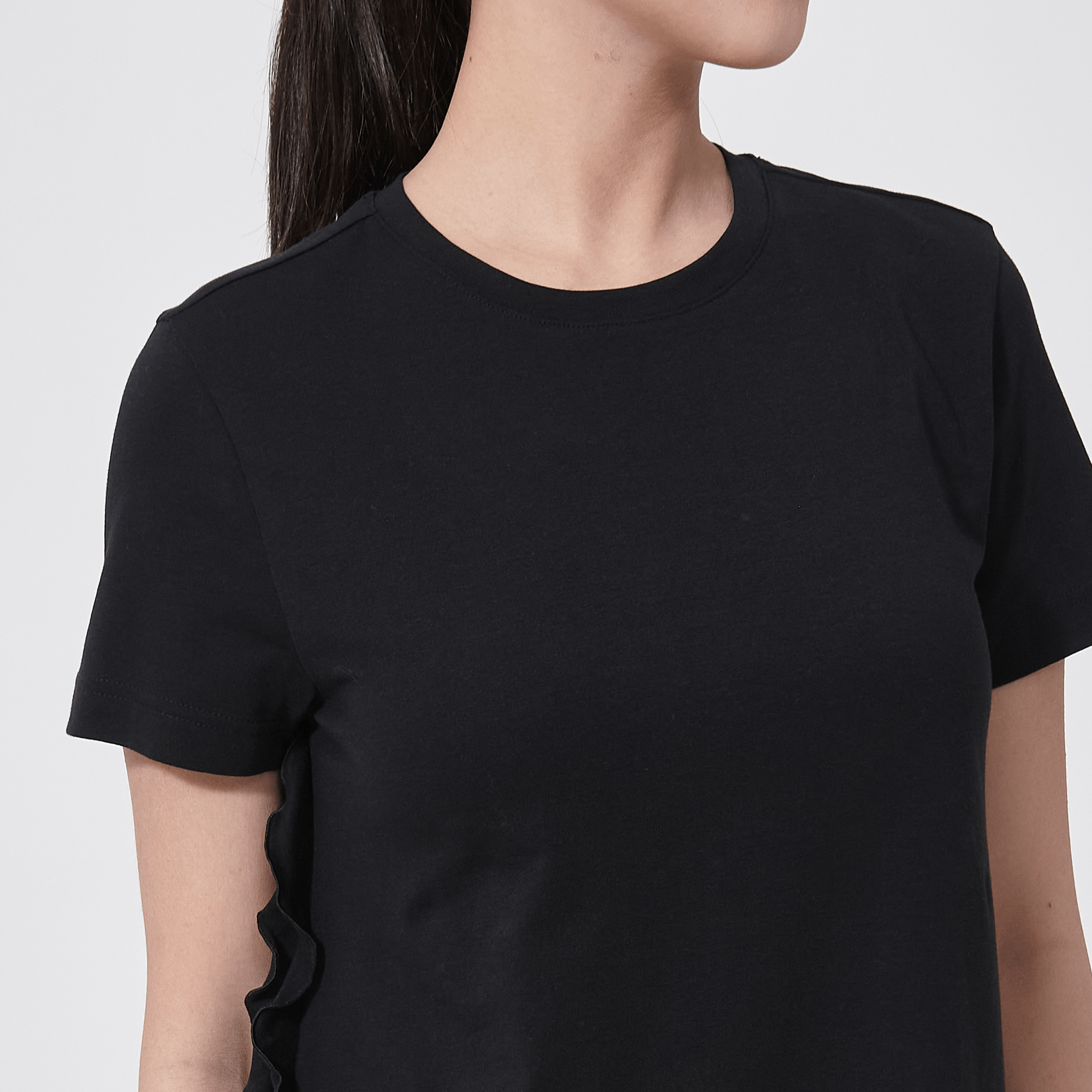 - Flounced detail along side seam to body hem