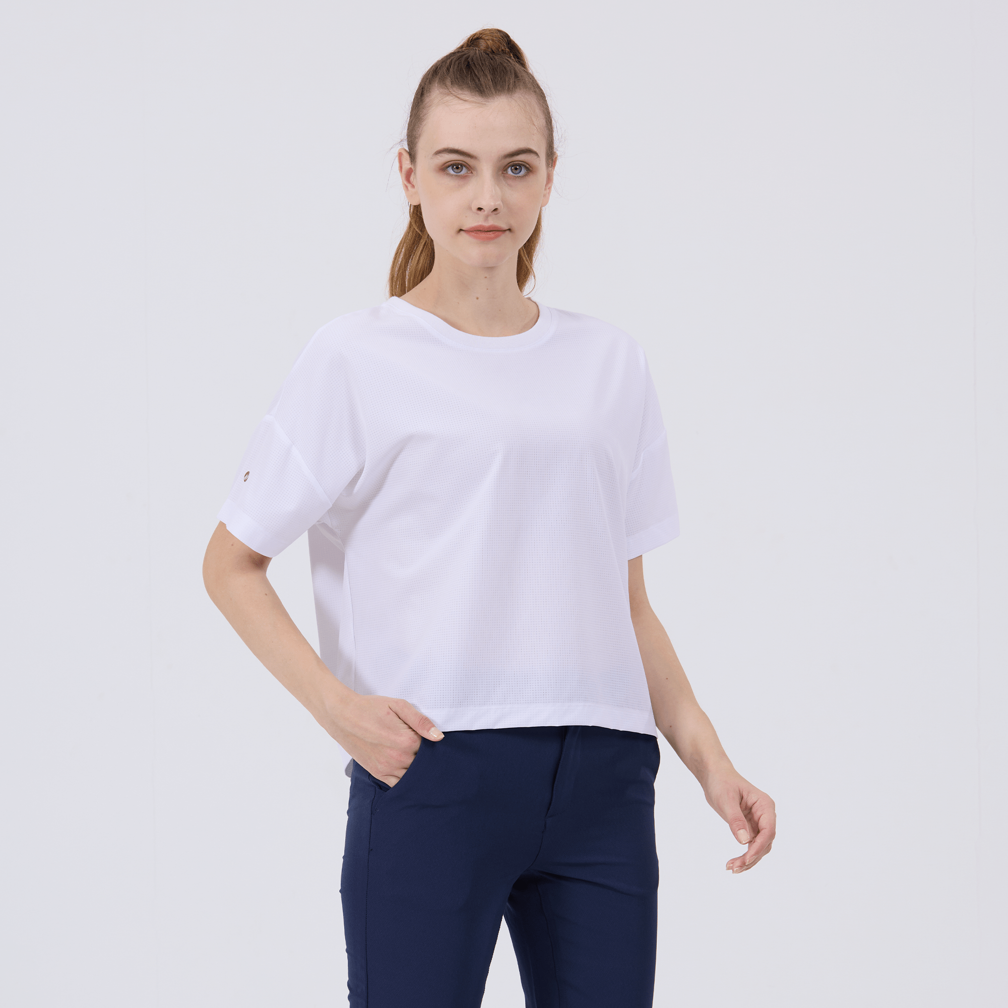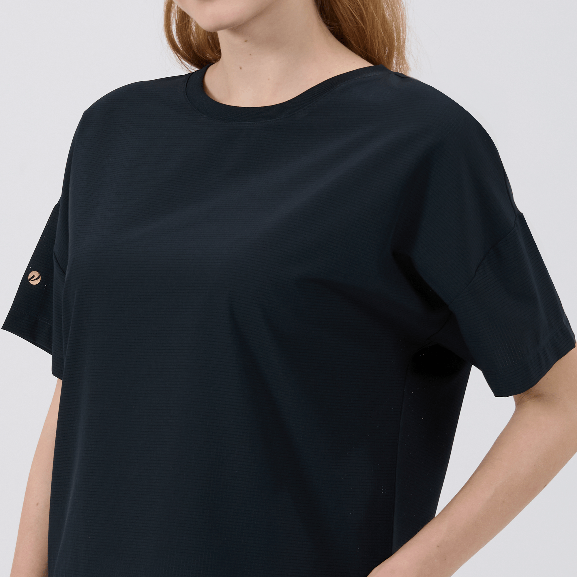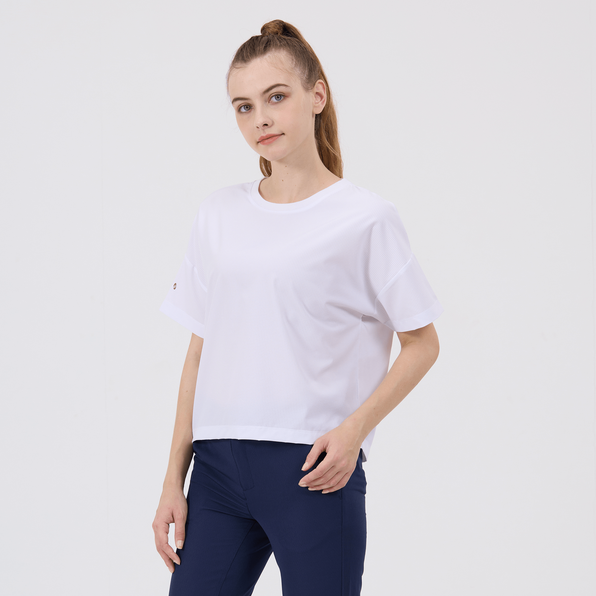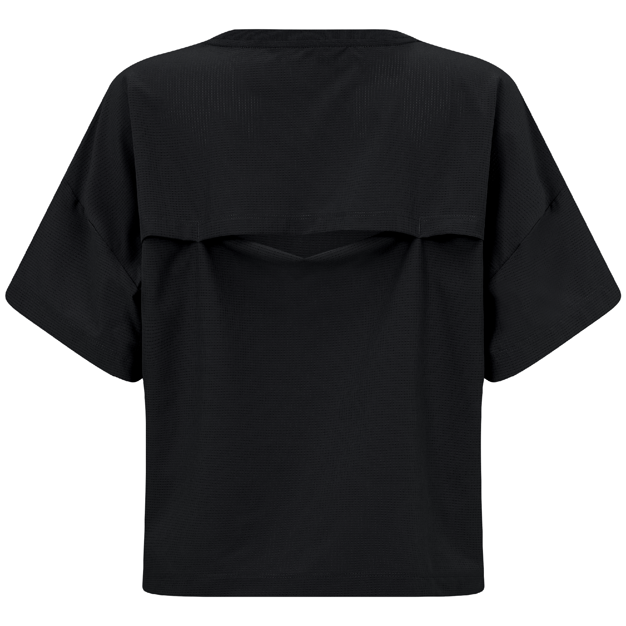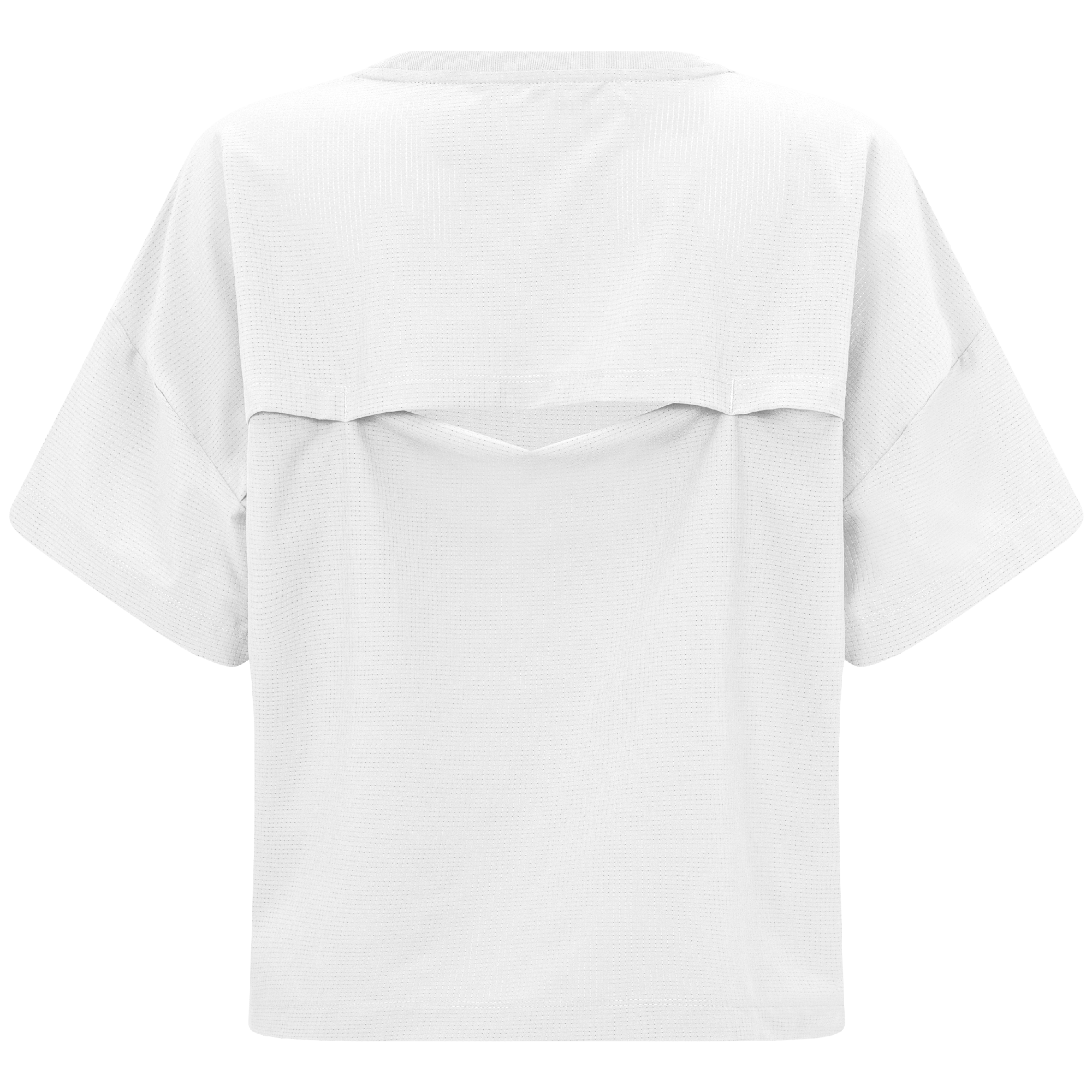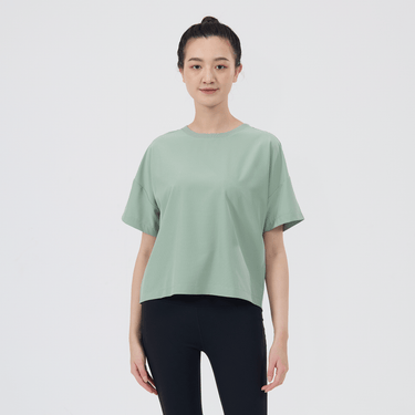 The women's Verve Box Car t-shirt offers a fresh take on casual wear with its unique design and comfortable fit. This T-shirt features a stretched woven fabric with a dobby texture pattern, adding a distinct touch to the simple silhouette. The boxy cut and cropped design make it a trendy choice for those looking for a modern, relaxed style. A self fabric collar provides a clean, finished look, while the back body overlap design with a vent opening adds an element of surprise and extra breathability. Made from a blend of 90% polyester and 10% spandex, this T-shirt combines durability with a slight stretch, ensuring it moves with you comfortably throughout the day.