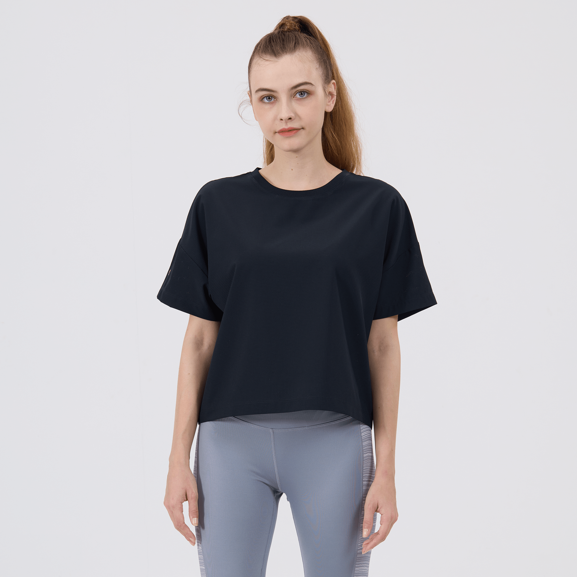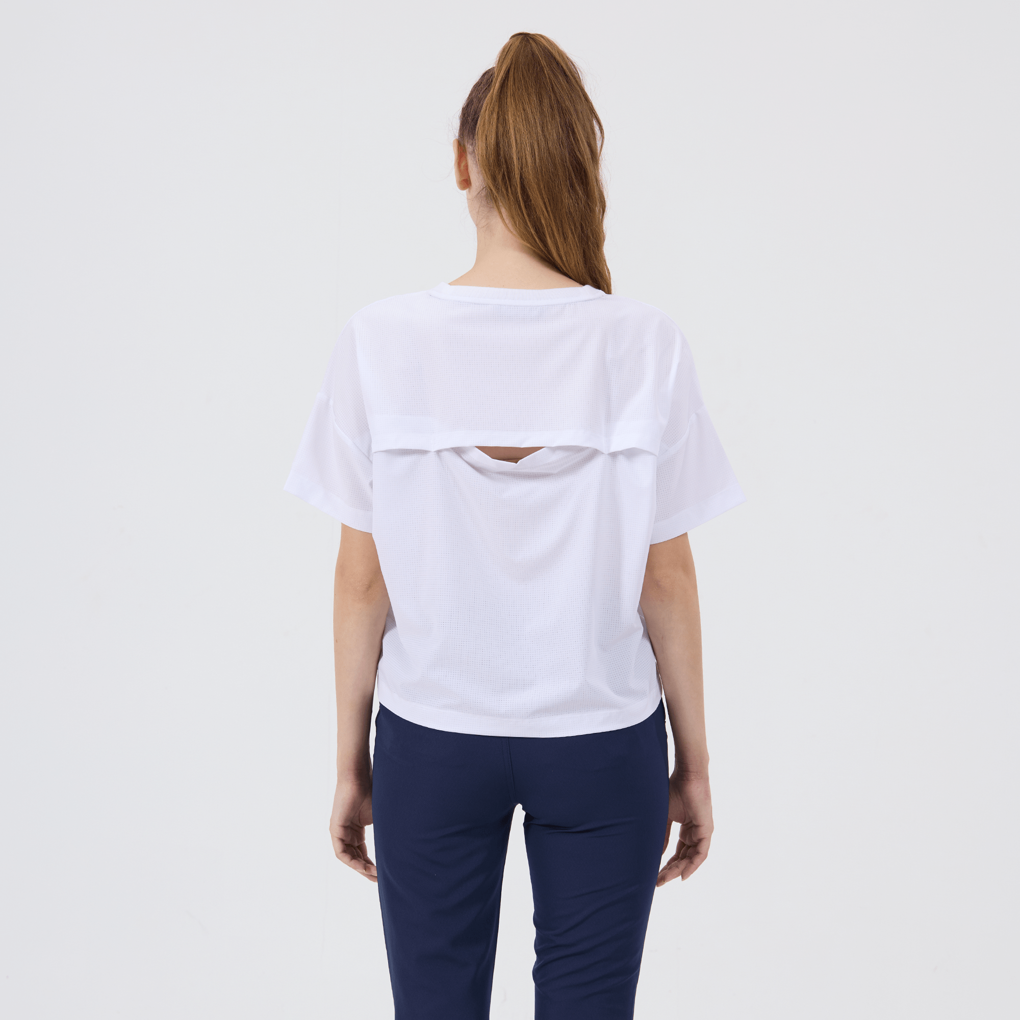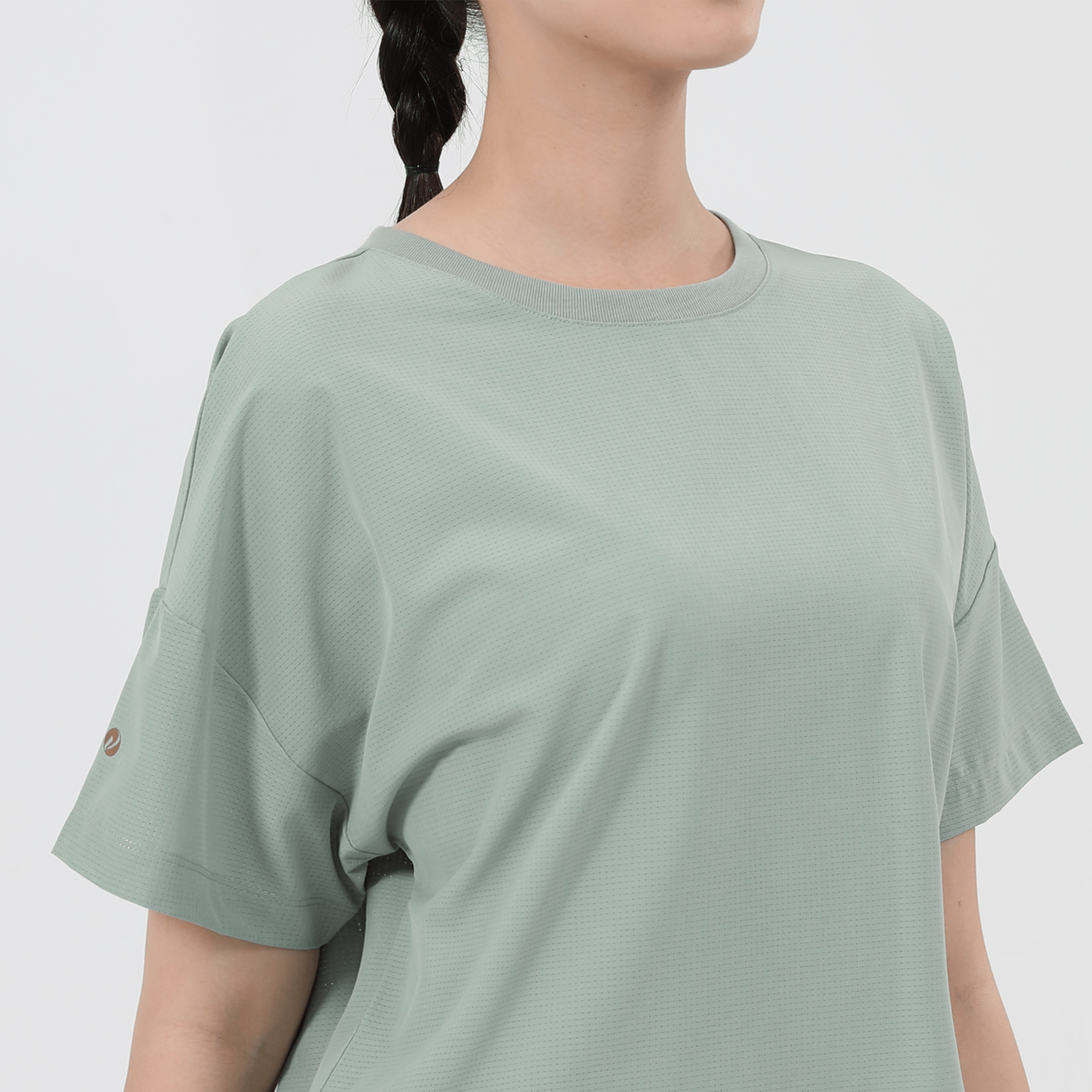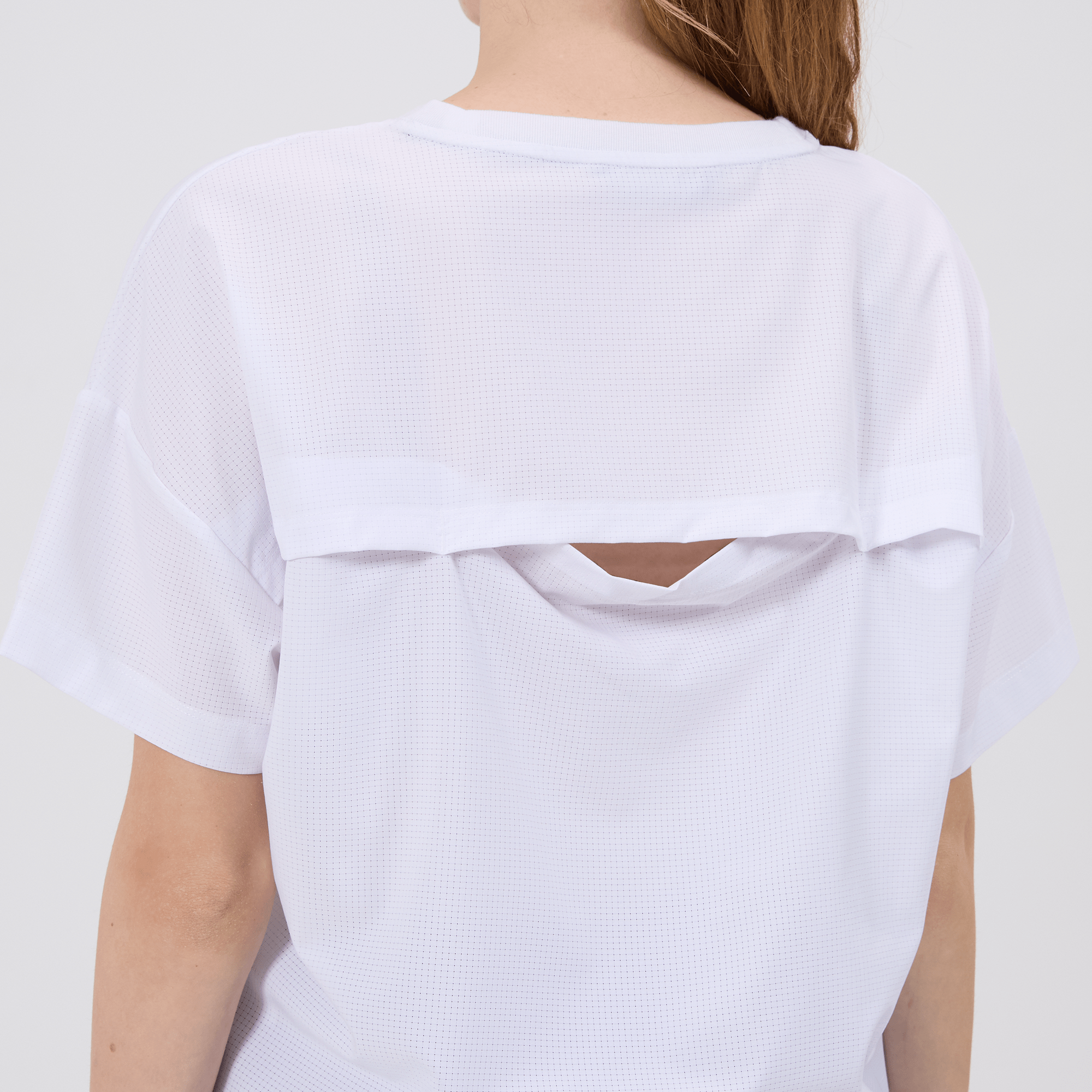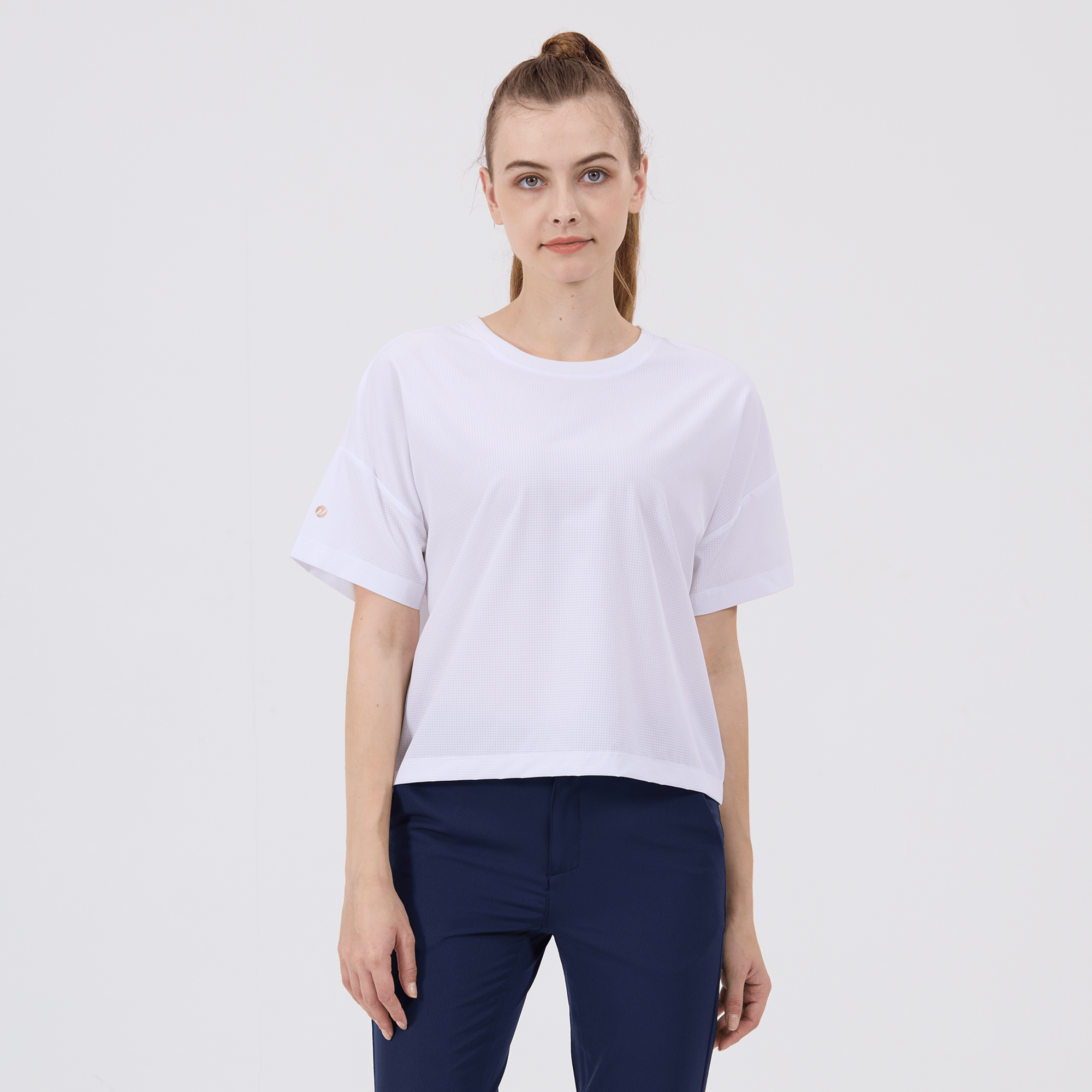 The women's Verve Box Car t-shirt offers a fresh take on casual wear with its unique design and comfortable fit. This T-shirt features a stretched woven fabric with a dobby texture pattern, adding a distinct touch to the simple silhouette. The boxy cut and cropped design make it a trendy choice for those looking for a modern, relaxed style. A self fabric collar provides a clean, finished look, while the back body overlap design with a vent opening adds an element of surprise and extra breathability. Made from a blend of 90% polyester and 10% spandex, this T-shirt combines durability with a slight stretch, ensuring it moves with you comfortably throughout the day.