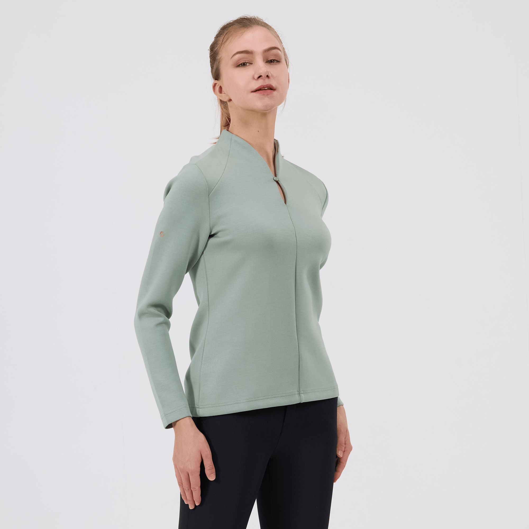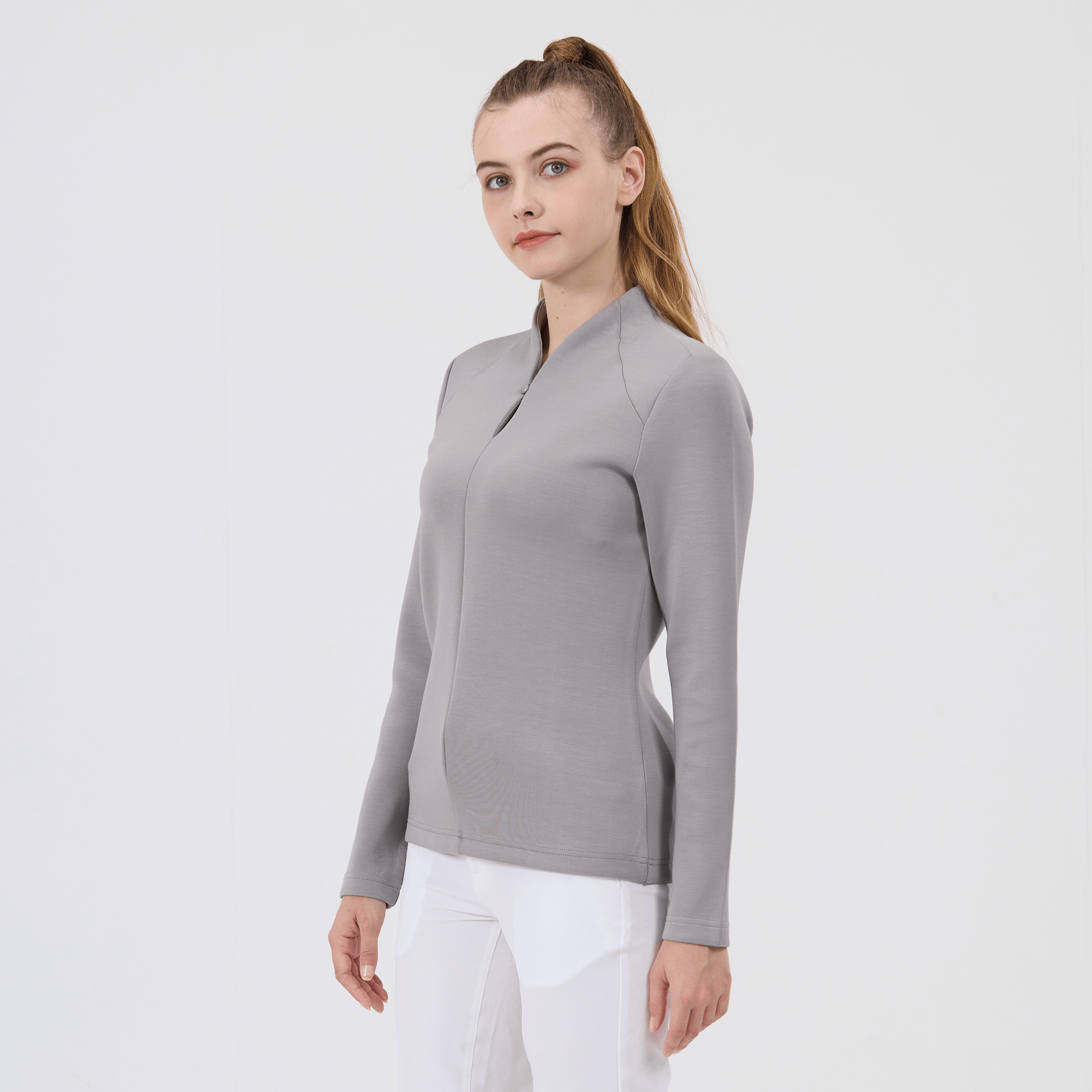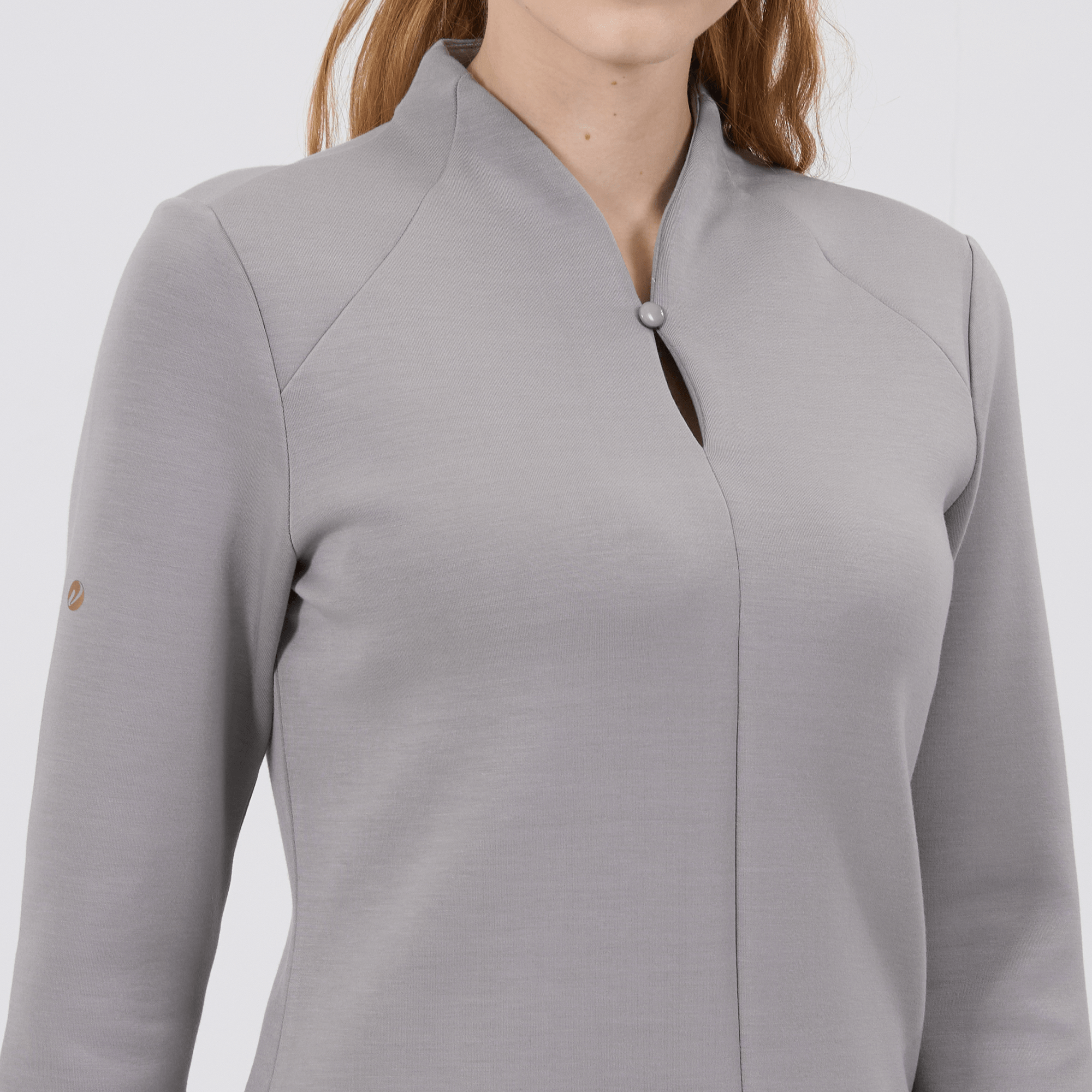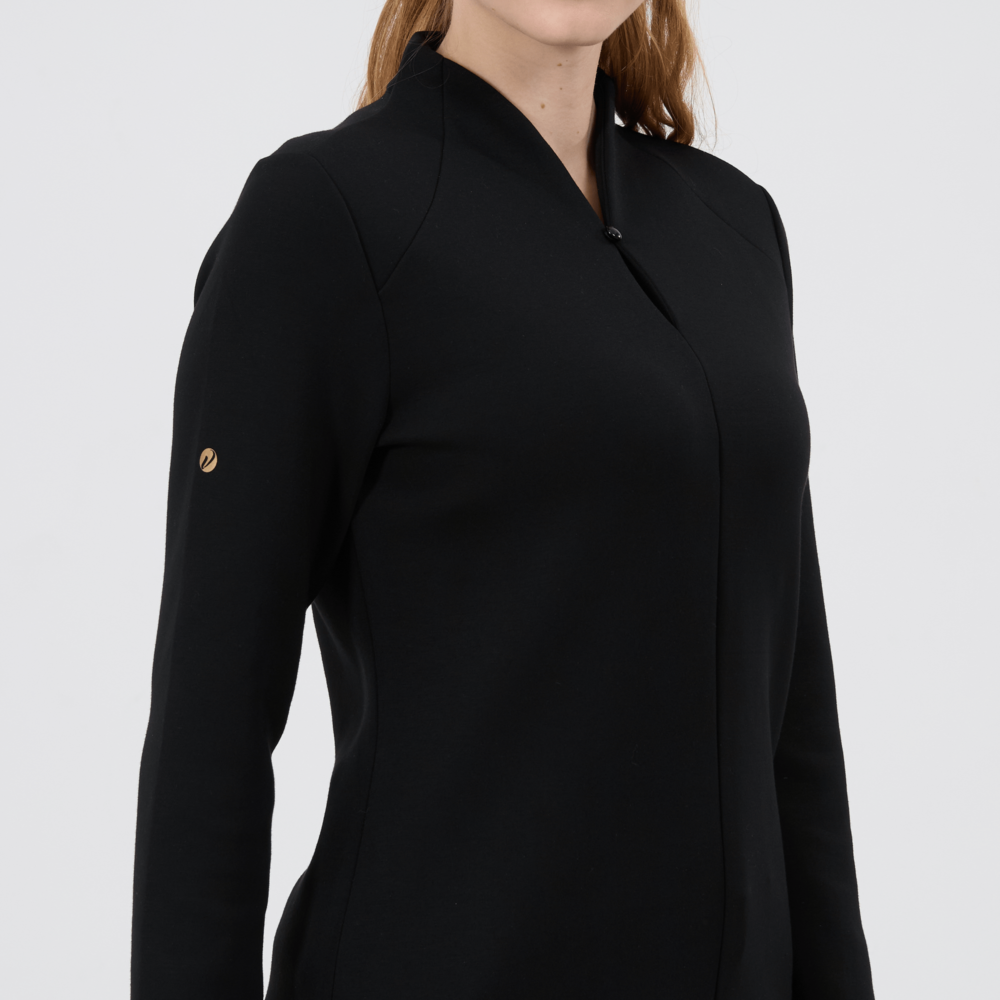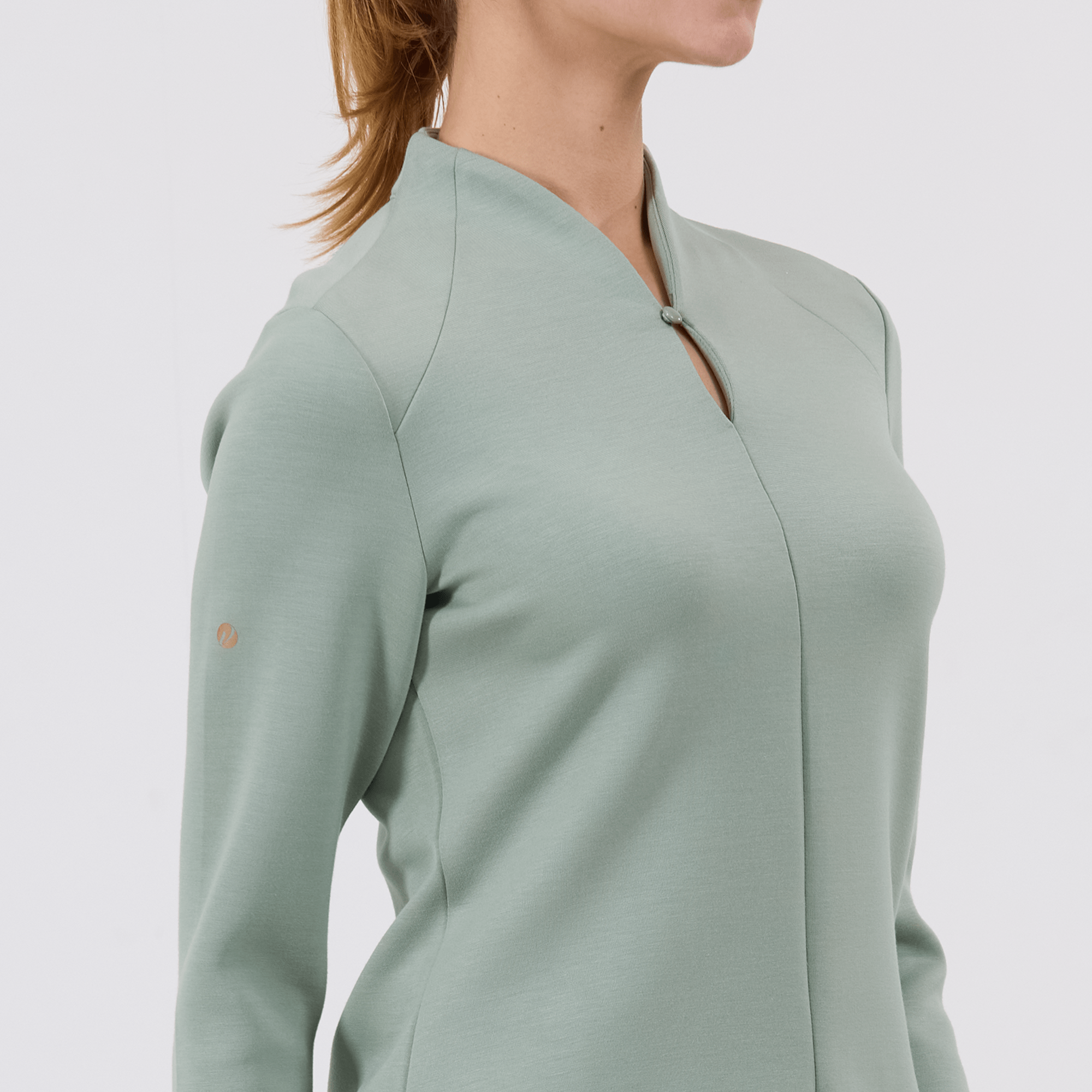 The Flaire is a stylish and environmentally conscious choice, crafted from a blend of 50% recycled polyester, 43% viscose, and 7% spandex. This unique midlayer is designed with attention to detail, featuring stylized shoulder seams that sweep elegantly from front to back, enhancing its sophisticated profile. The beautifully shaped mandarin collar with a button provides a refined and modern touch. A slight high-low hem adds a contemporary flair, offering a subtle variation in length that complements the sleek design.