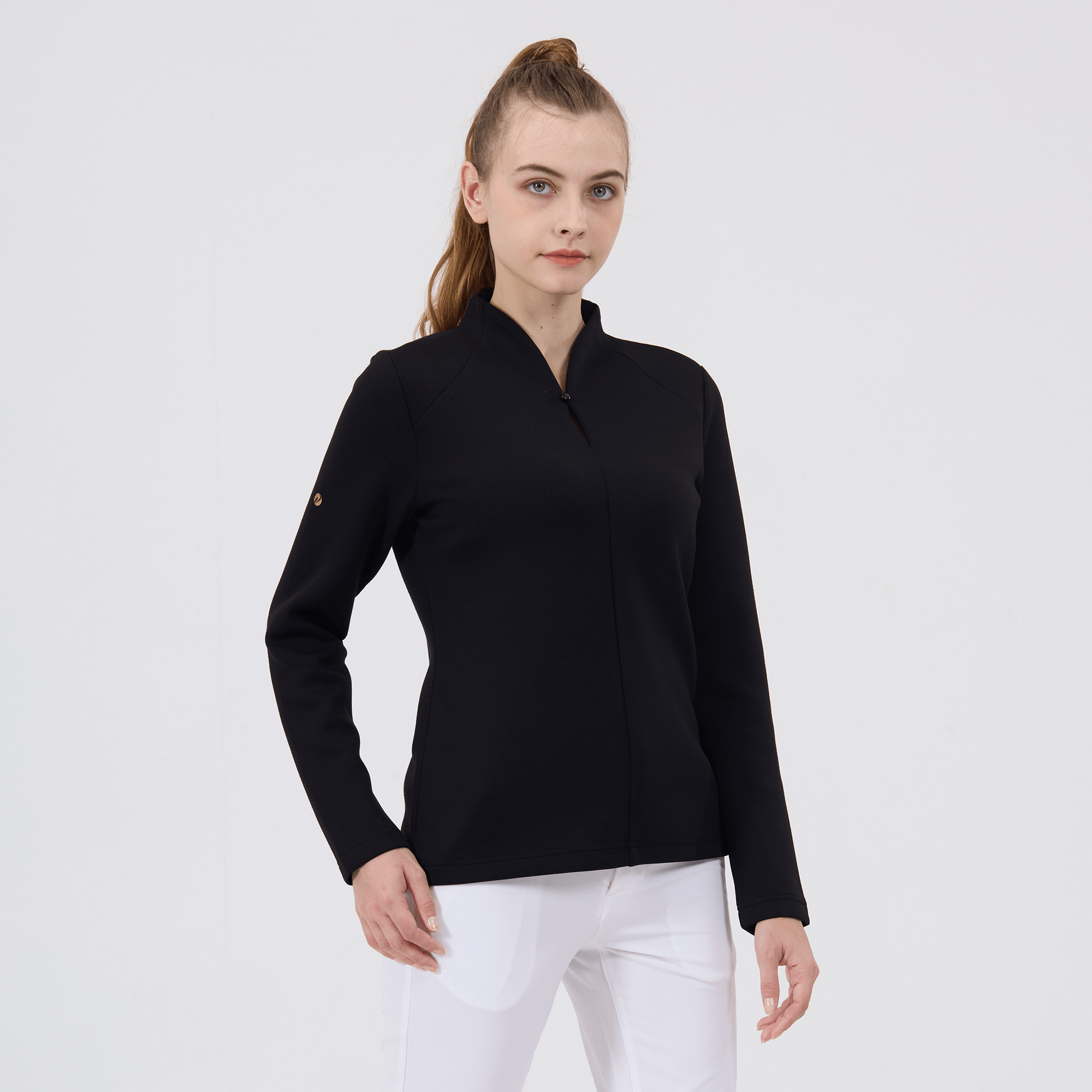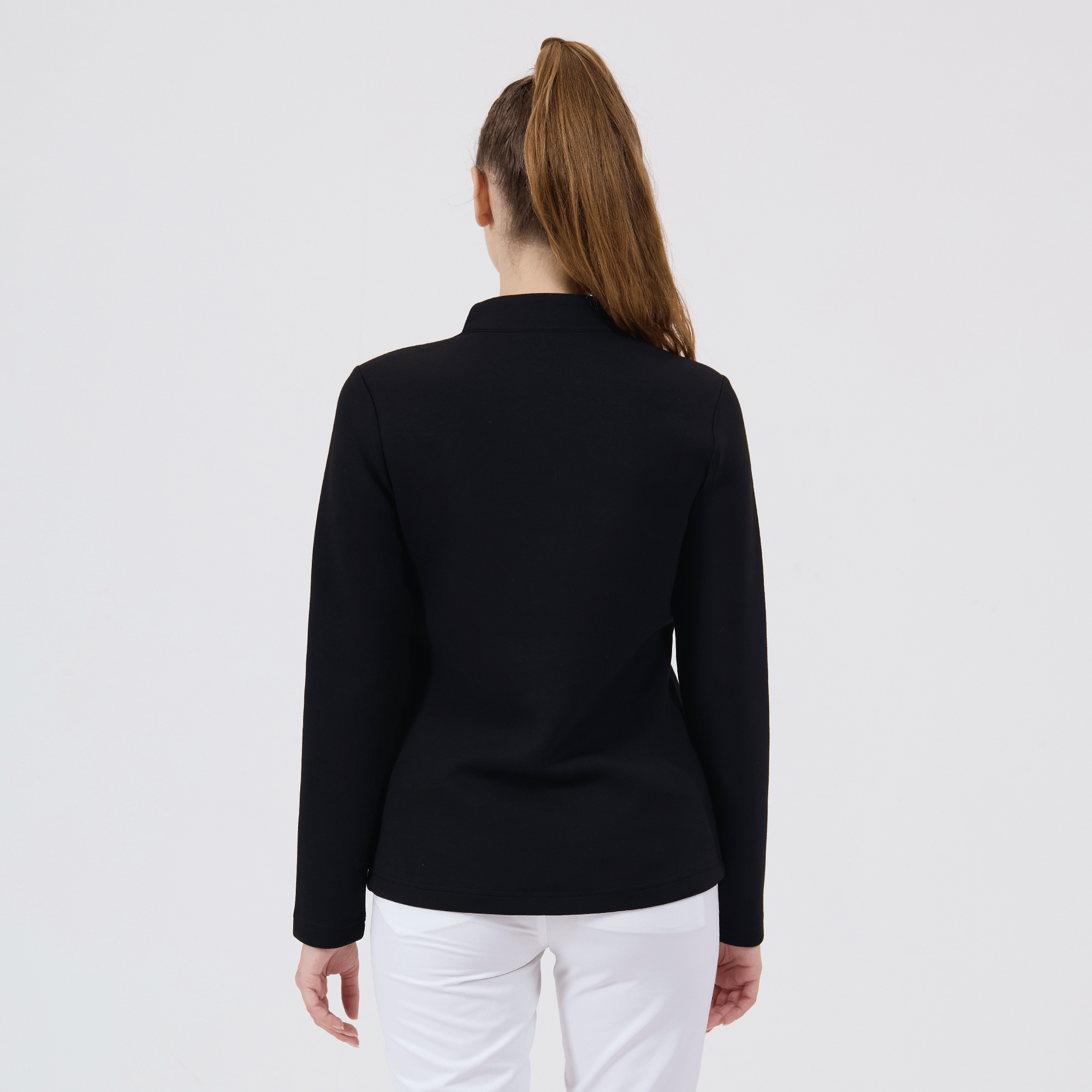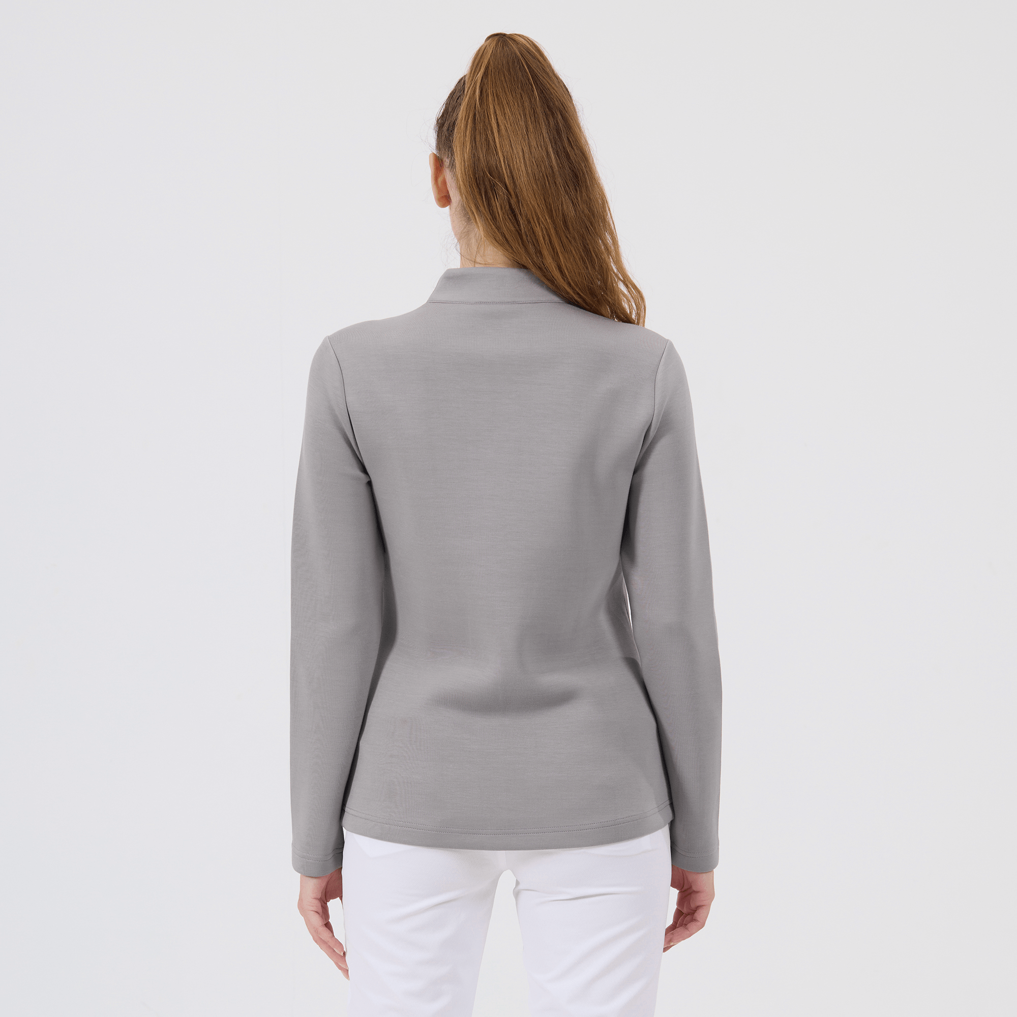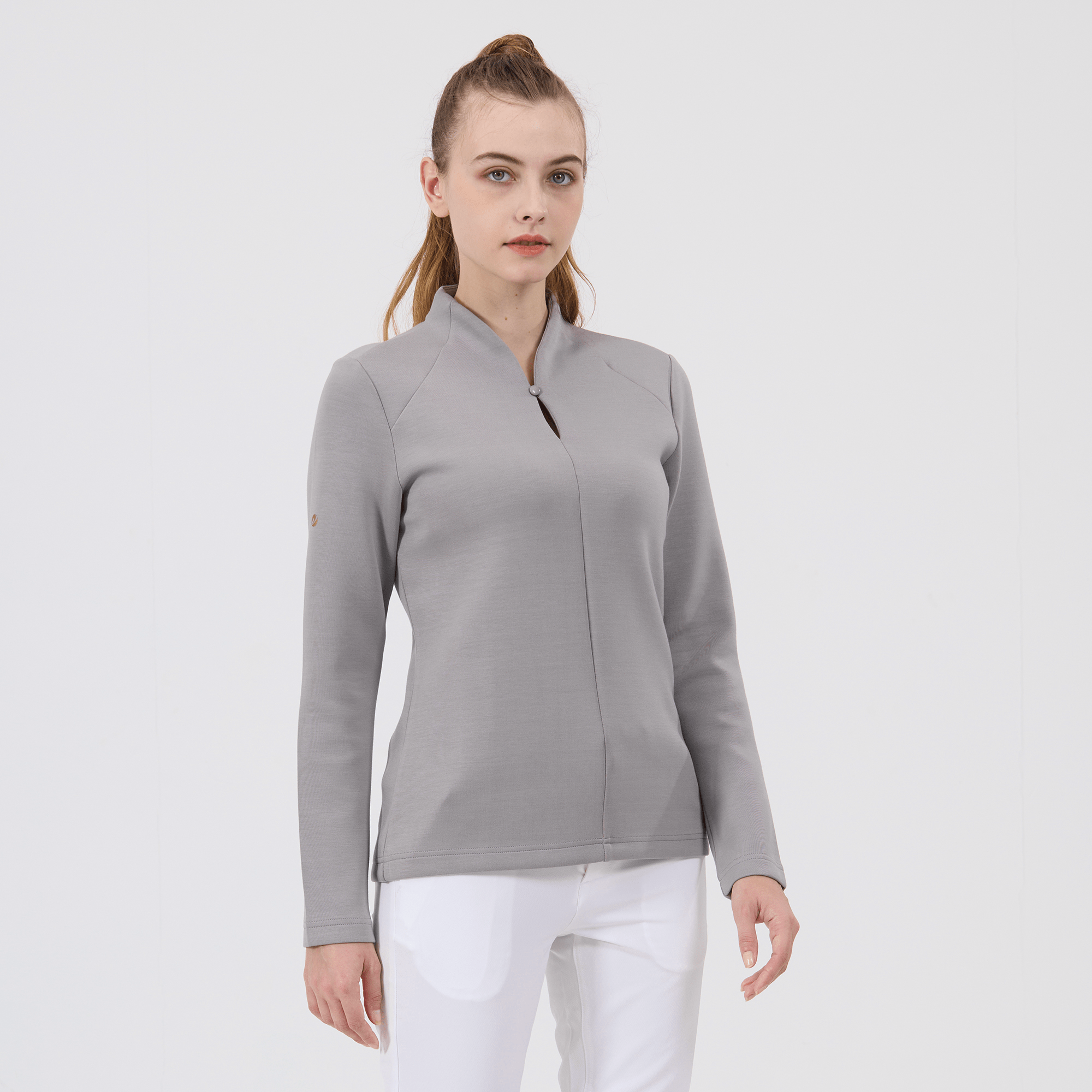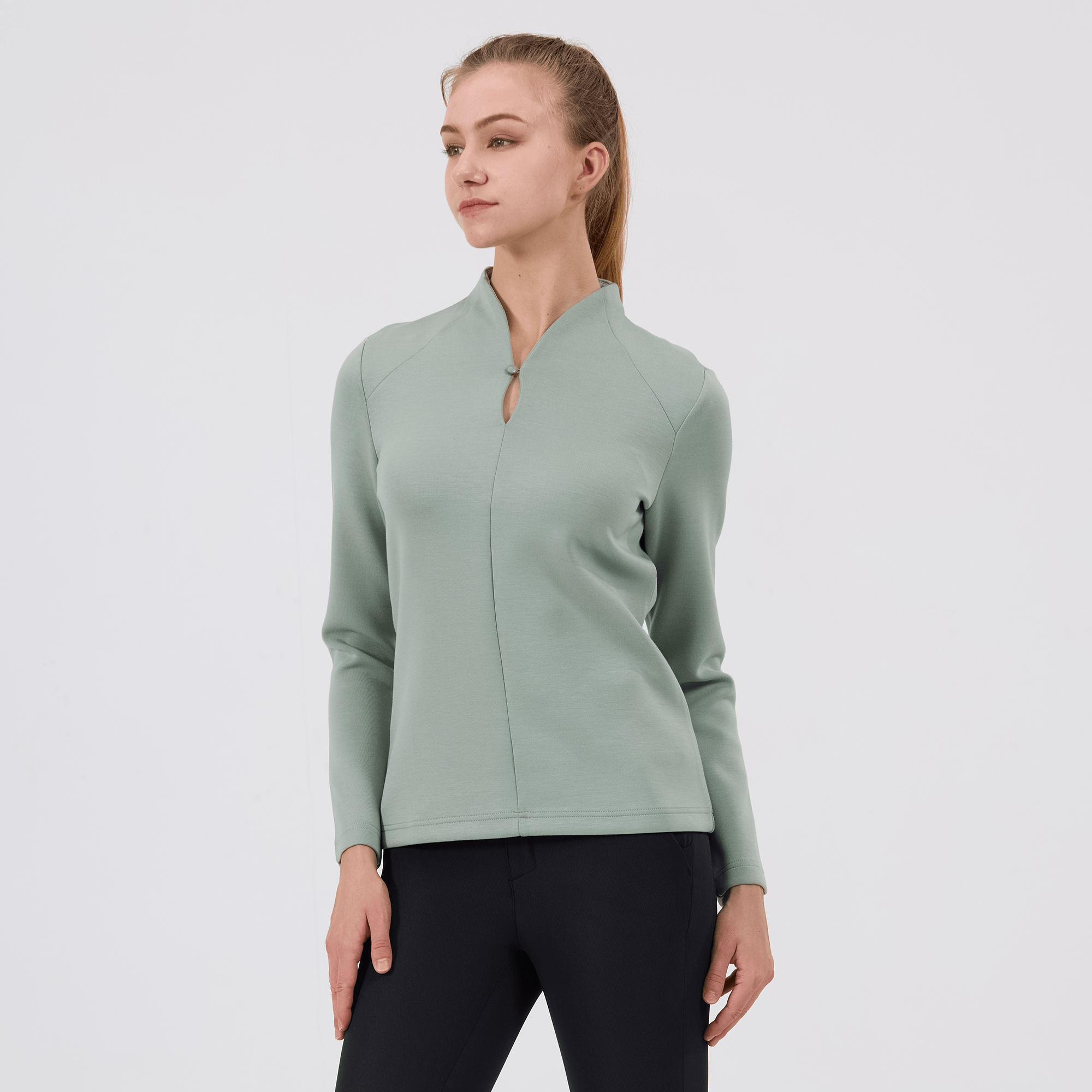 The Flaire is a stylish and environmentally conscious choice, crafted from a blend of 50% recycled polyester, 43% viscose, and 7% spandex. This unique midlayer is designed with attention to detail, featuring stylized shoulder seams that sweep elegantly from front to back, enhancing its sophisticated profile. The beautifully shaped mandarin collar with a button provides a refined and modern touch. A slight high-low hem adds a contemporary flair, offering a subtle variation in length that complements the sleek design.