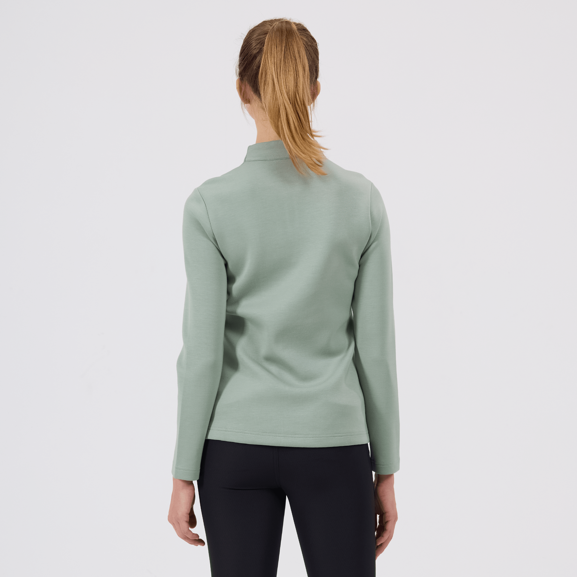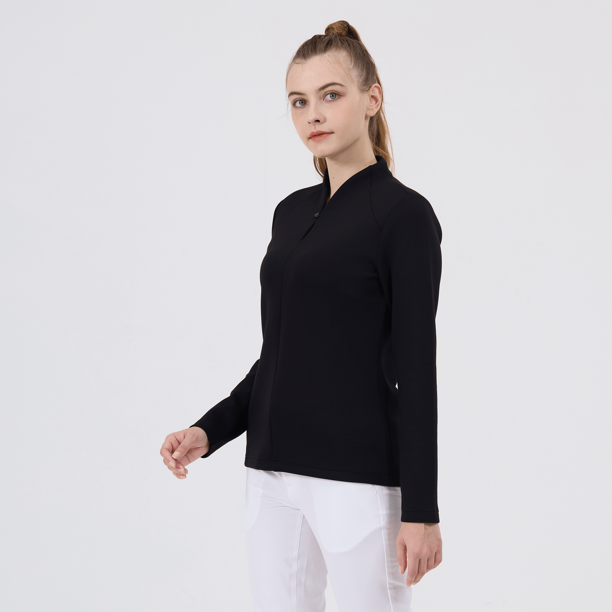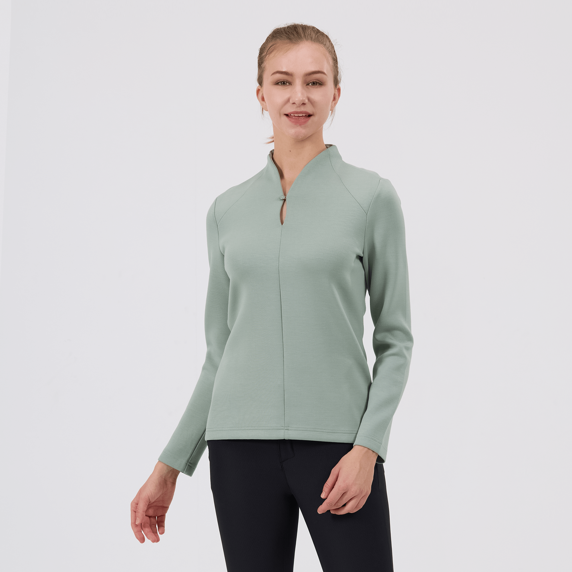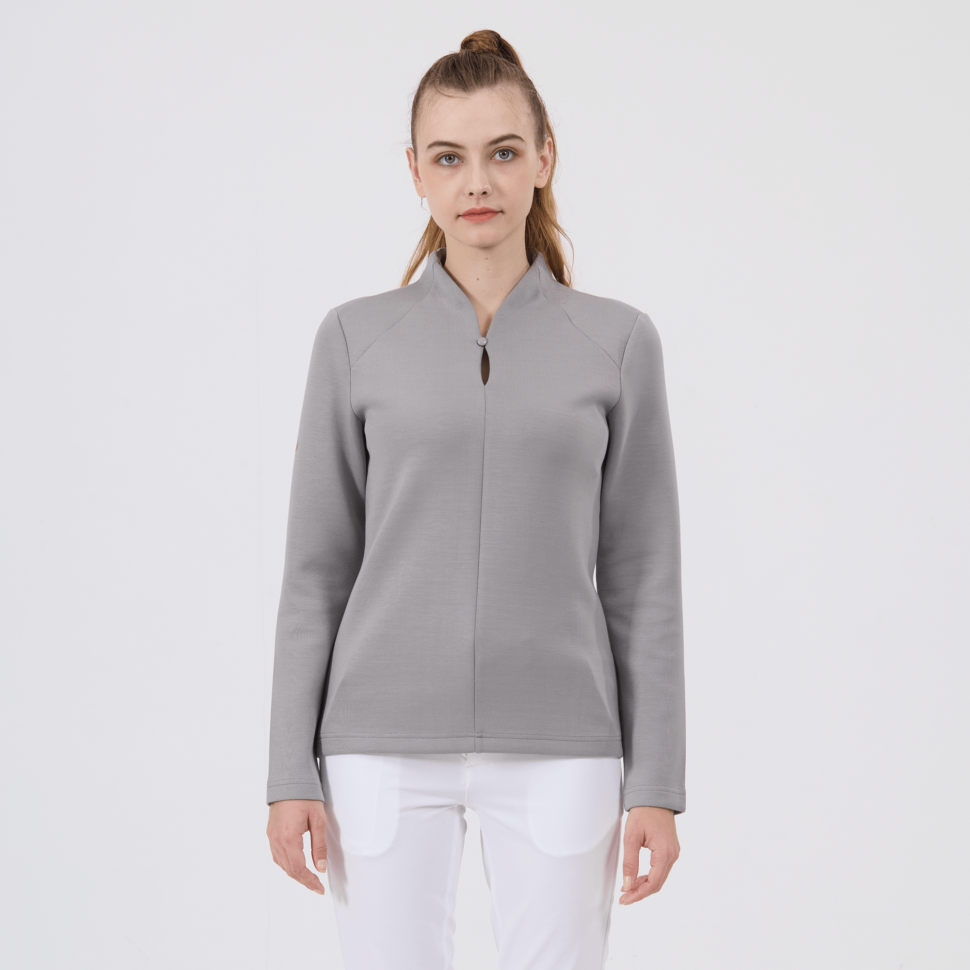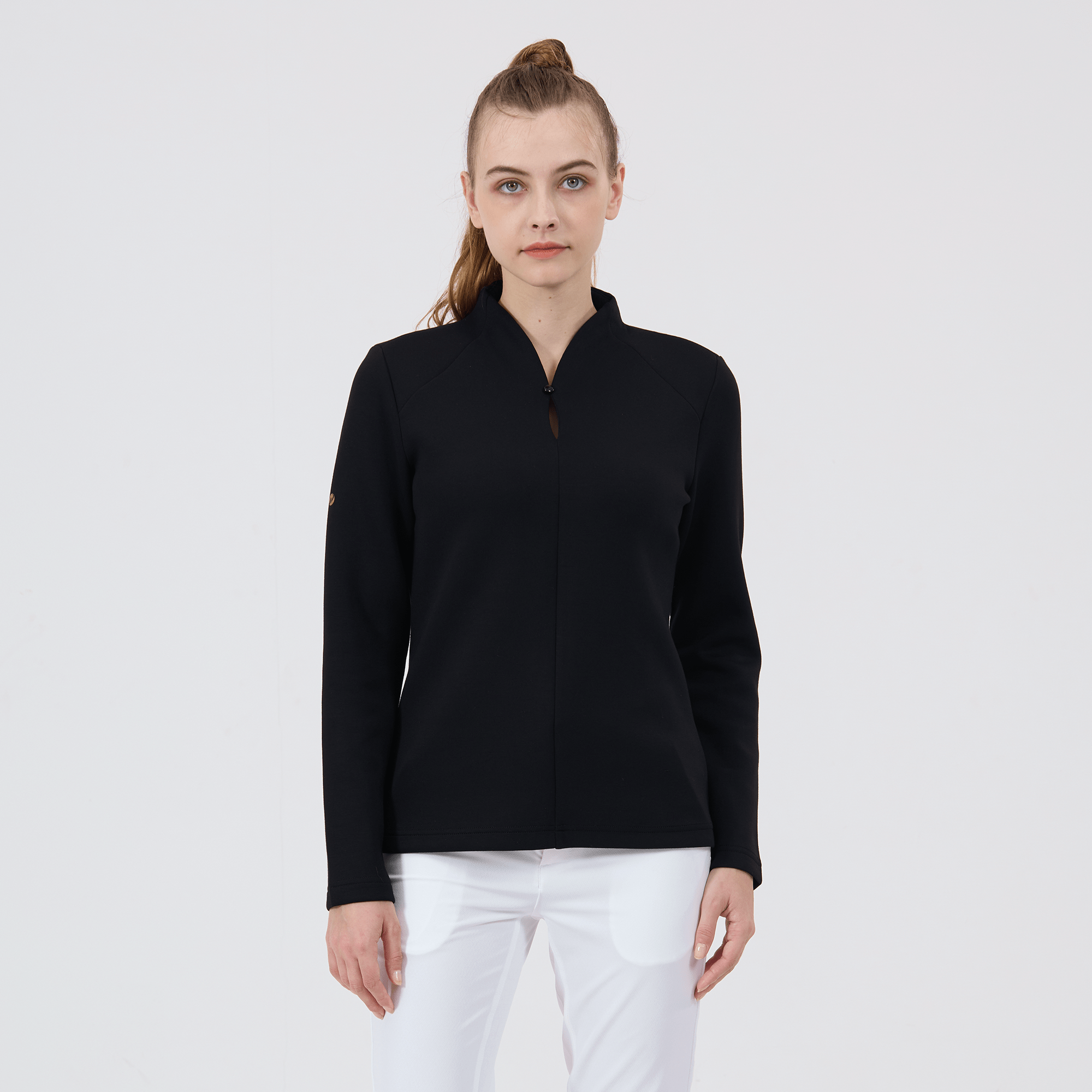The Flaire is a stylish and environmentally conscious choice, crafted from a blend of 50% recycled polyester, 43% viscose, and 7% spandex. This unique midlayer is designed with attention to detail, featuring stylized shoulder seams that sweep elegantly from front to back, enhancing its sophisticated profile. The beautifully shaped mandarin collar with a button provides a refined and modern touch. A slight high-low hem adds a contemporary flair, offering a subtle variation in length that complements the sleek design.