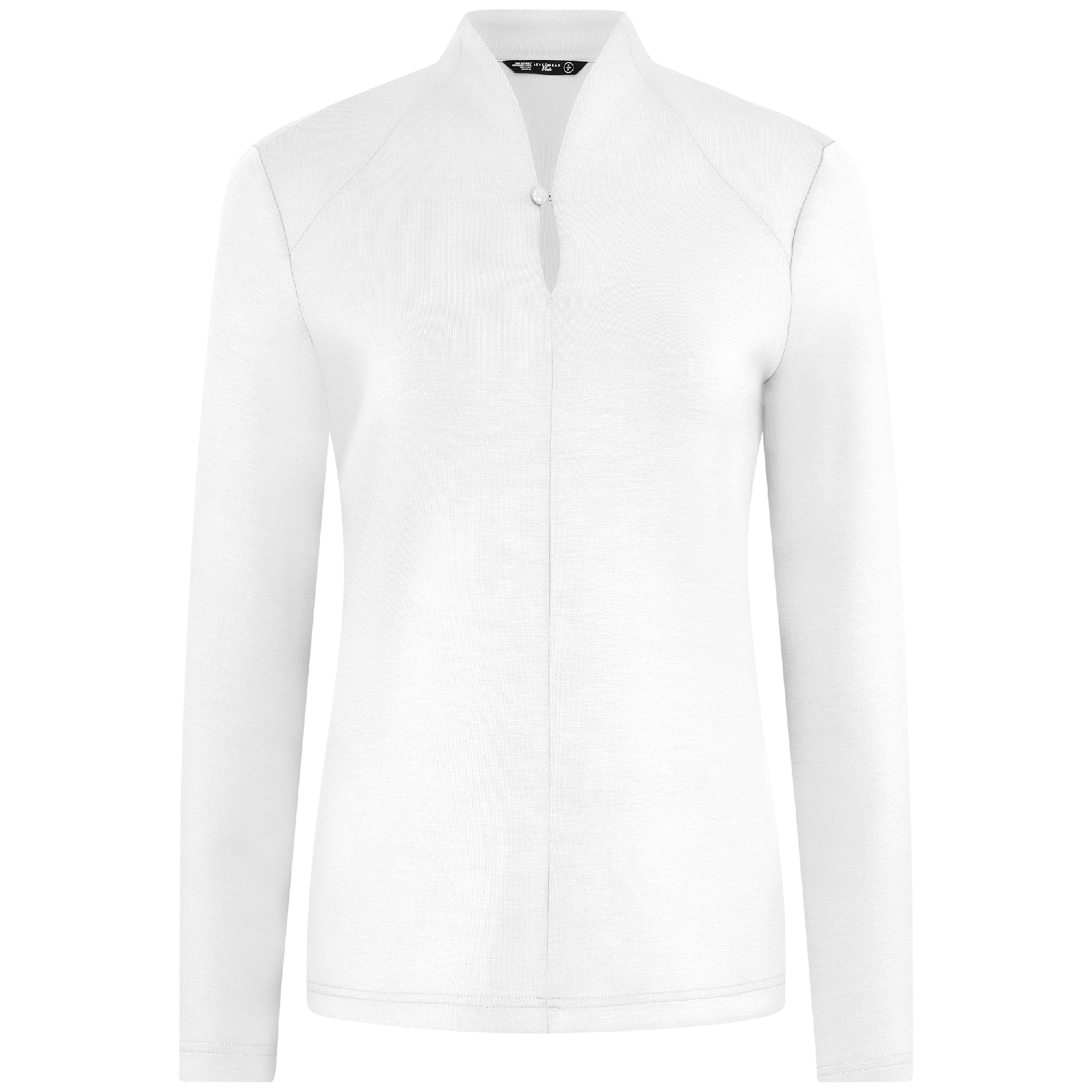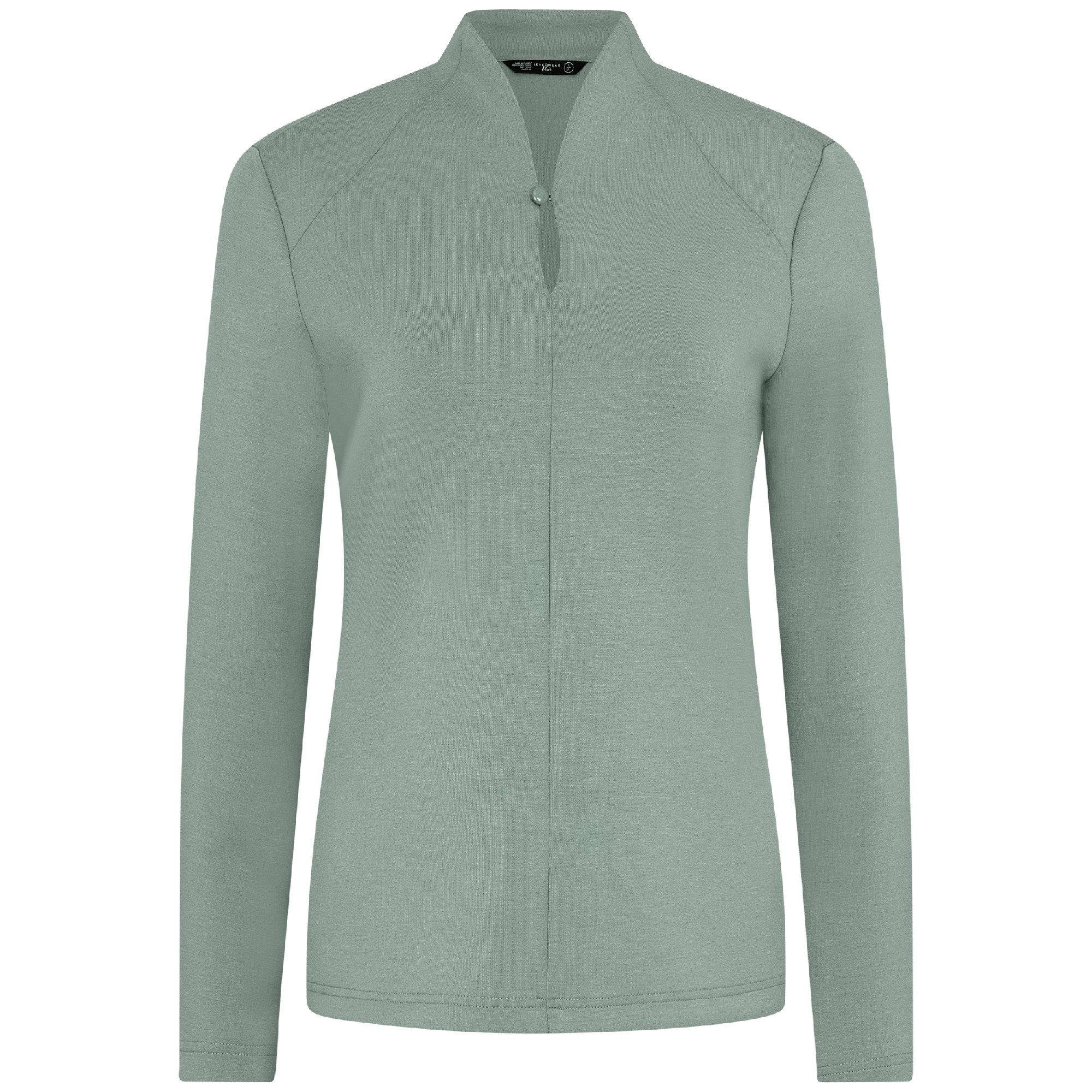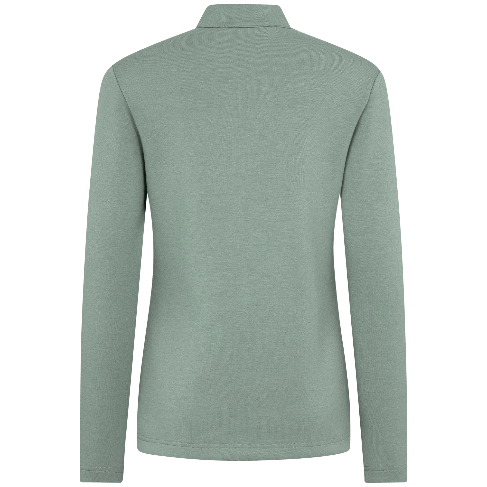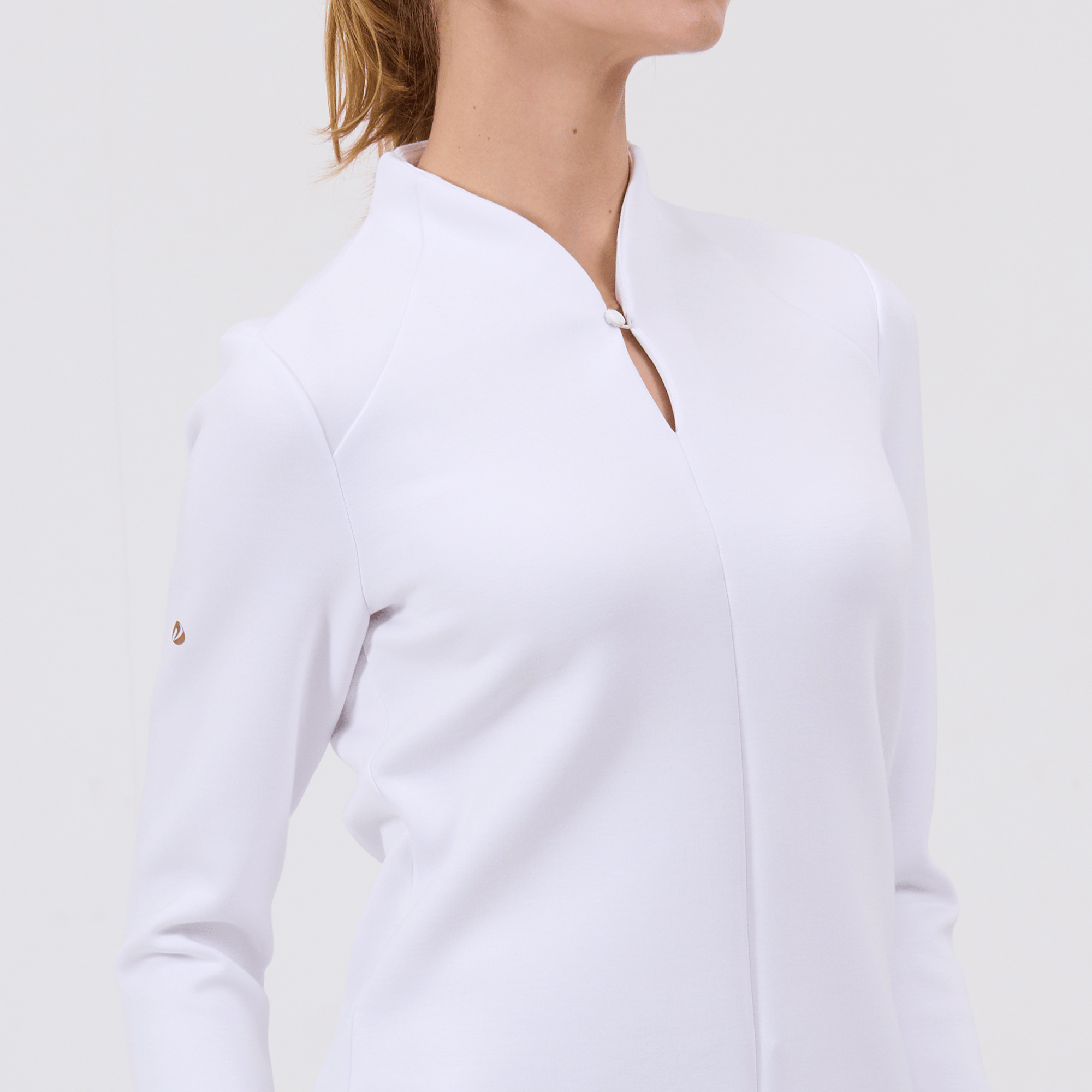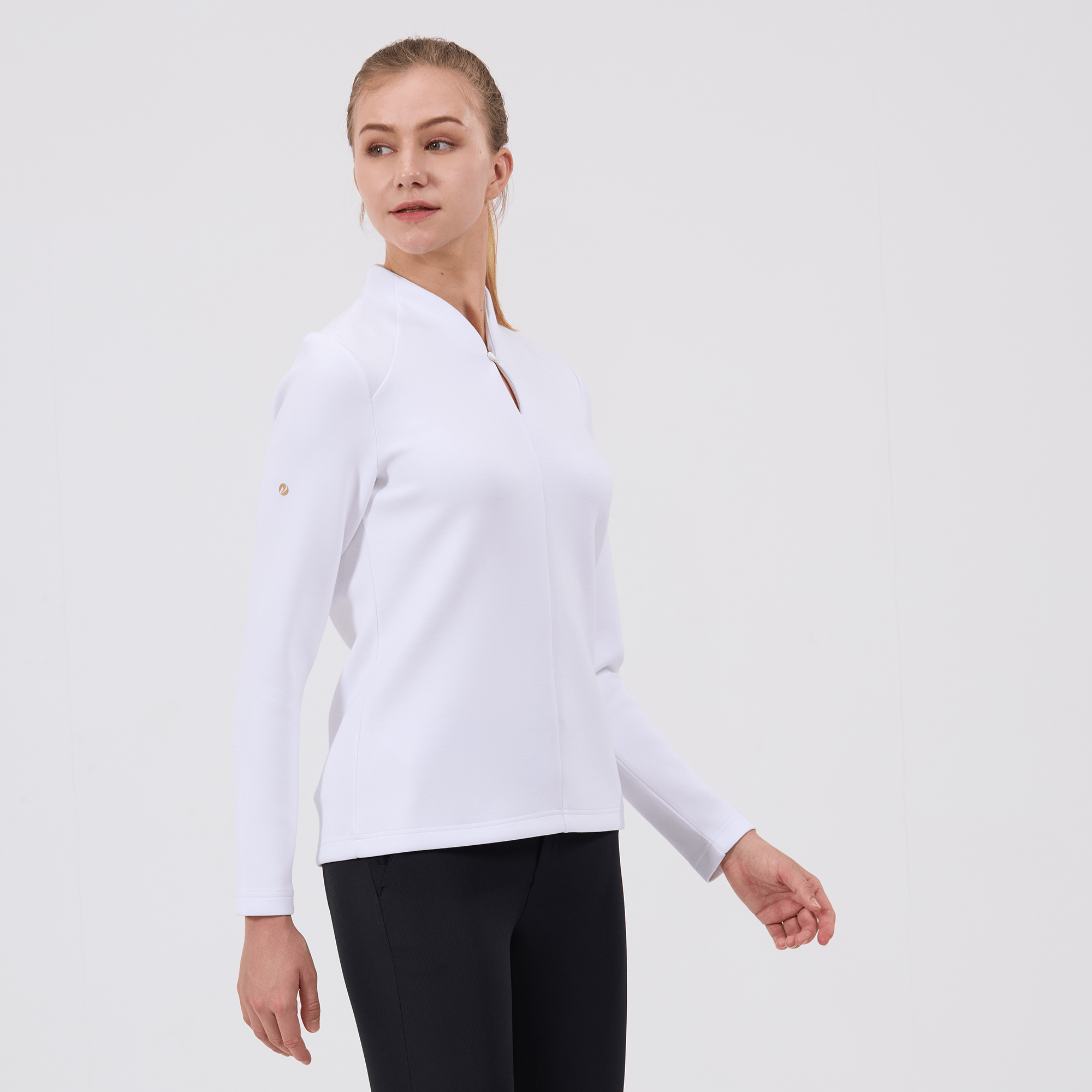 The Flaire is a stylish and environmentally conscious choice, crafted from a blend of 50% recycled polyester, 43% viscose, and 7% spandex. This unique midlayer is designed with attention to detail, featuring stylized shoulder seams that sweep elegantly from front to back, enhancing its sophisticated profile. The beautifully shaped mandarin collar with a button provides a refined and modern touch. A slight high-low hem adds a contemporary flair, offering a subtle variation in length that complements the sleek design.