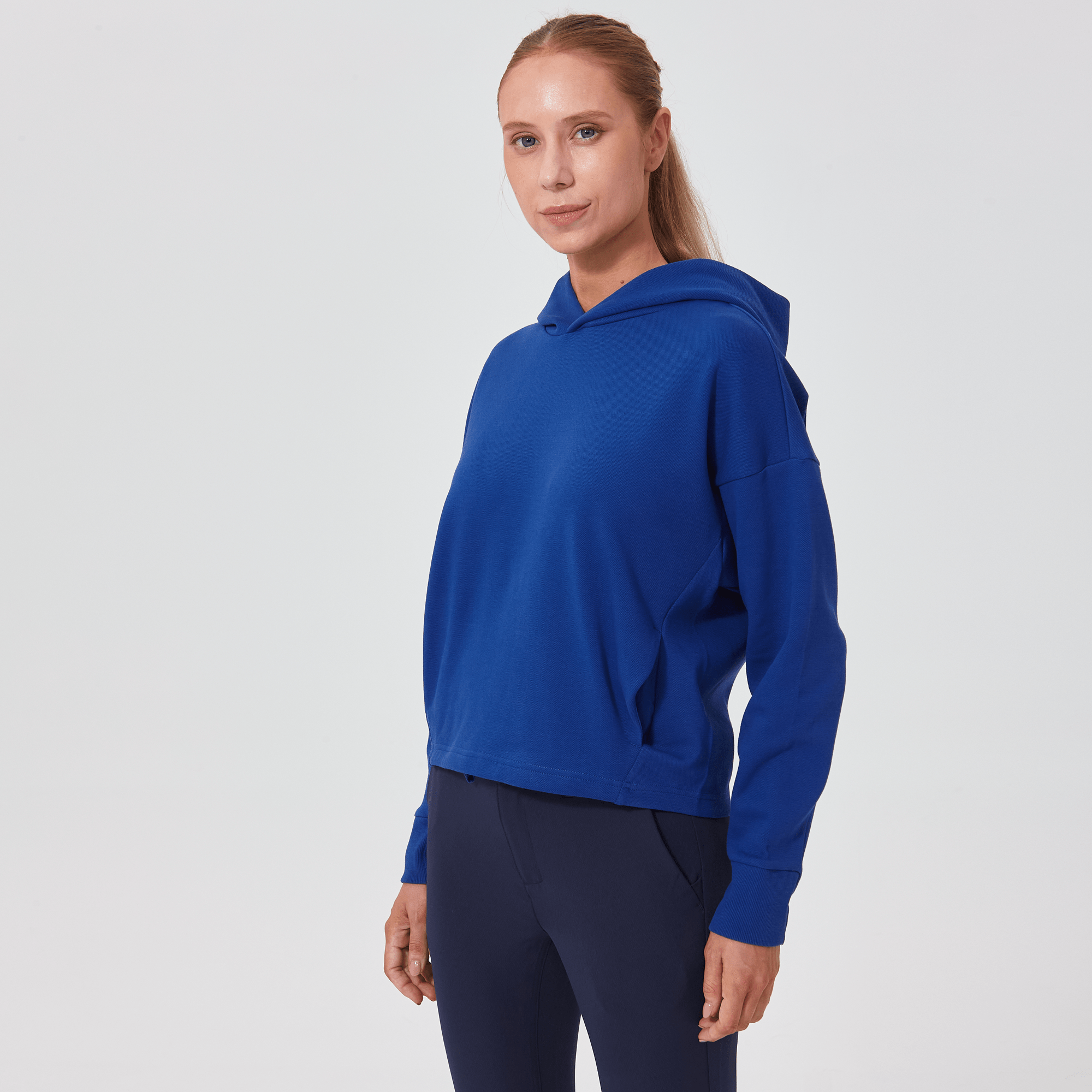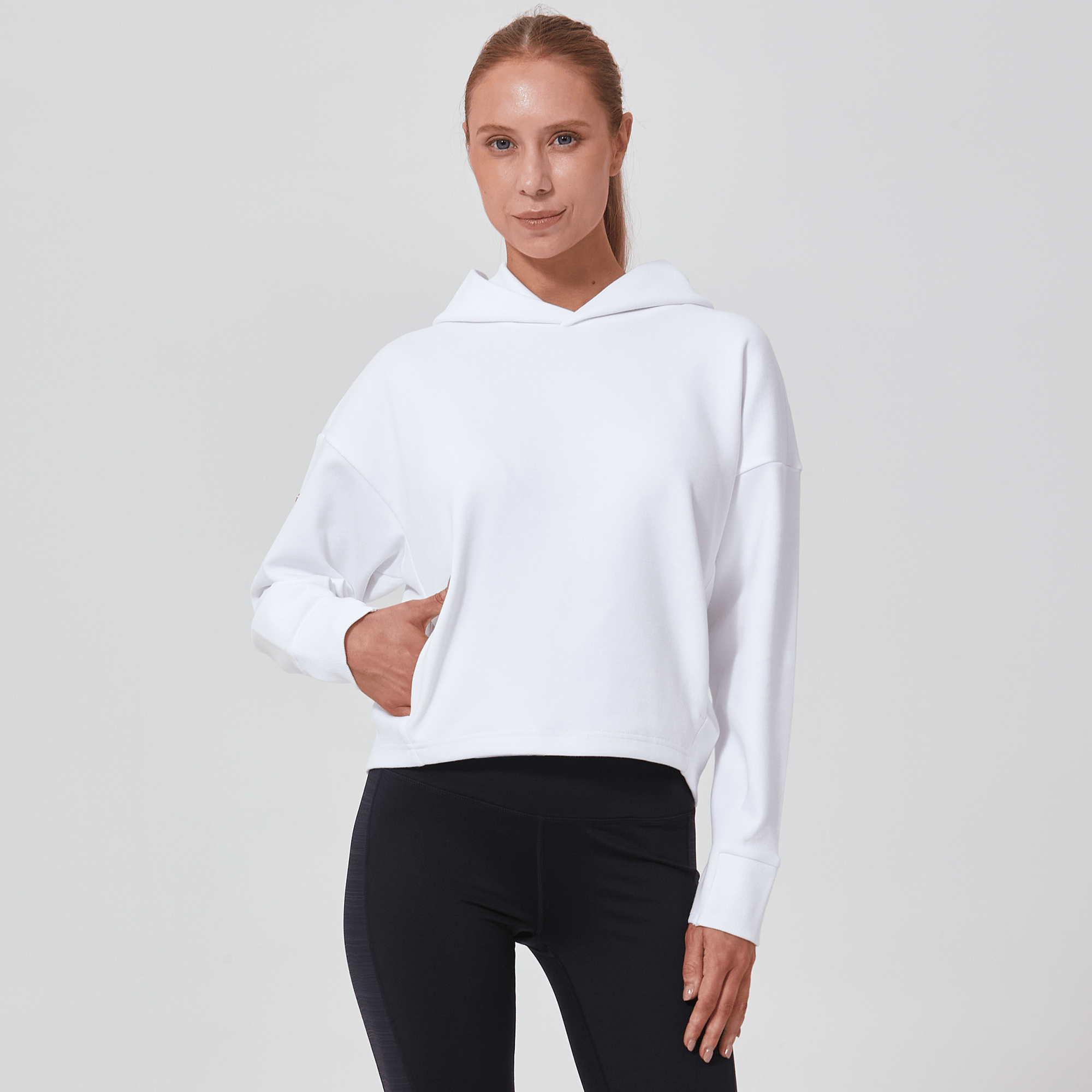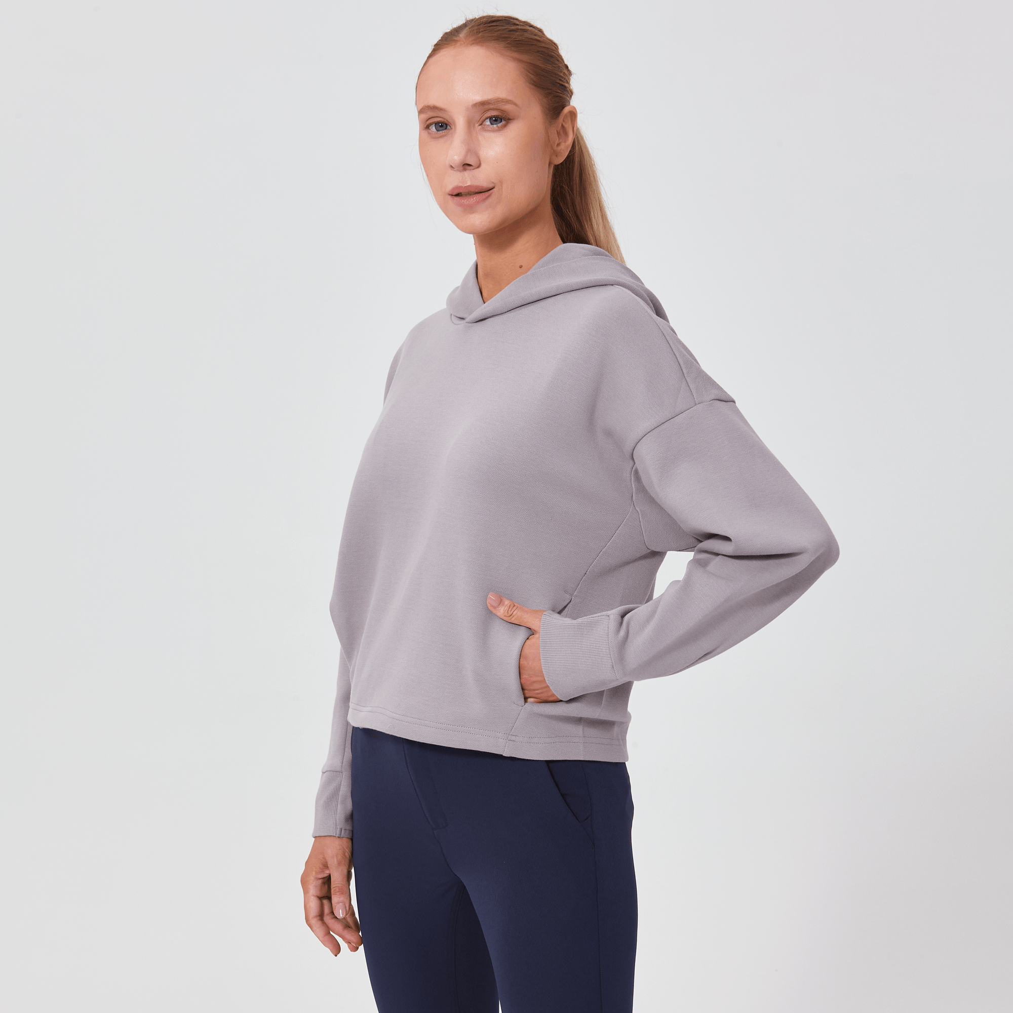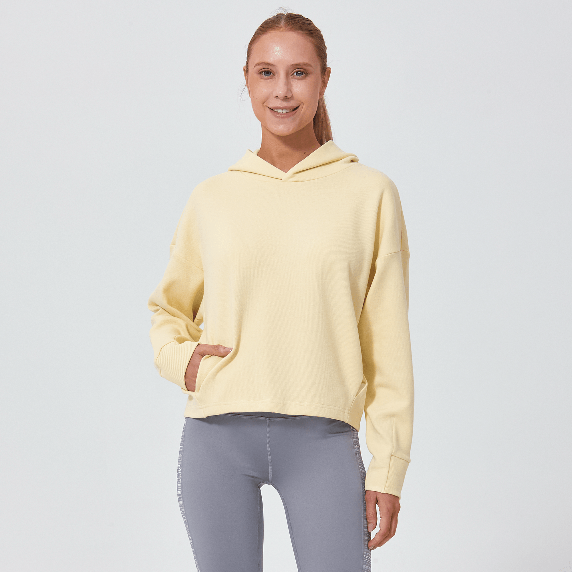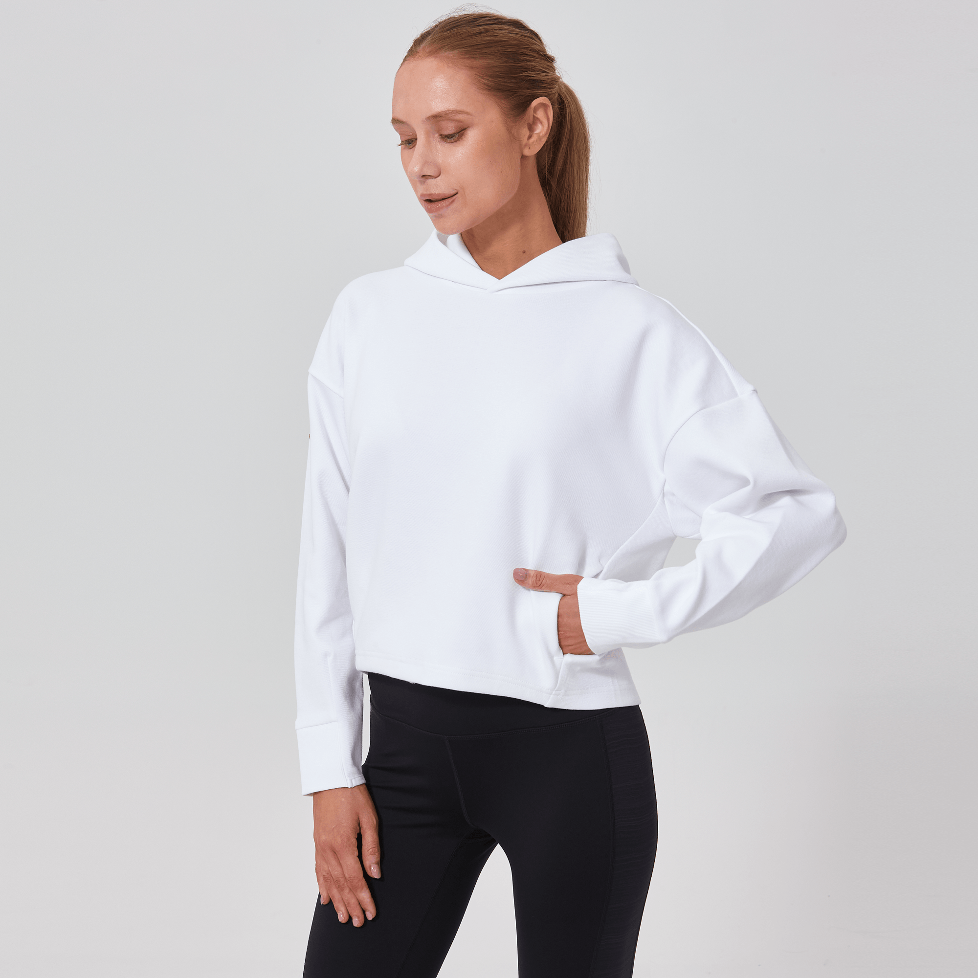 Introducing a piece that combines modern style with ultimate comfort: the latest addition to our collection features a drop shoulder and cropped body silhouette for a contemporary, relaxed look. The design includes a single panel double-layered hood that adds a sleek, cozy touch, perfect for cooler days. Enhanced with forward shoulder and side seams, this top offers a flattering fit while incorporating inseam pockets for functionality without compromising style. The sleeves are thoughtfully designed with ribbed trims, elastic binding, and darted seams, ensuring a snug fit that moves with you. Crafted from a soft blend of 79% cotton, 17% polyester, and 4% spandex, this garment provides stretch, comfort, and durability, making it a versatile staple for any casual wardrobe.