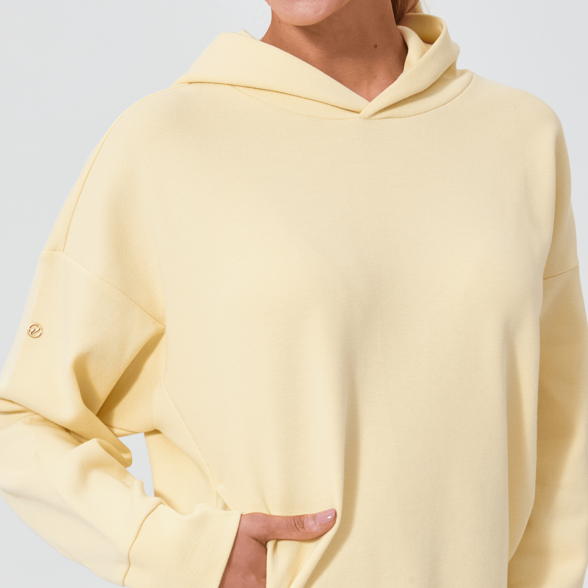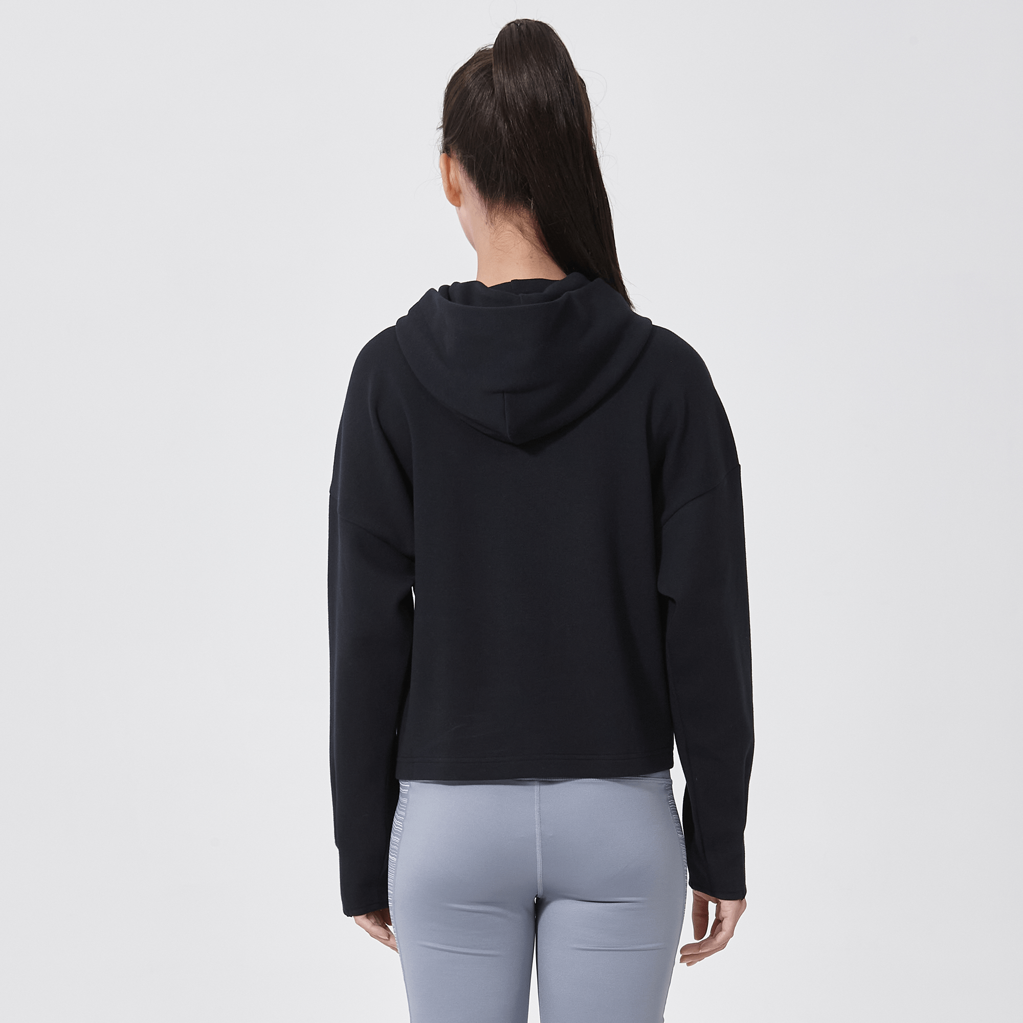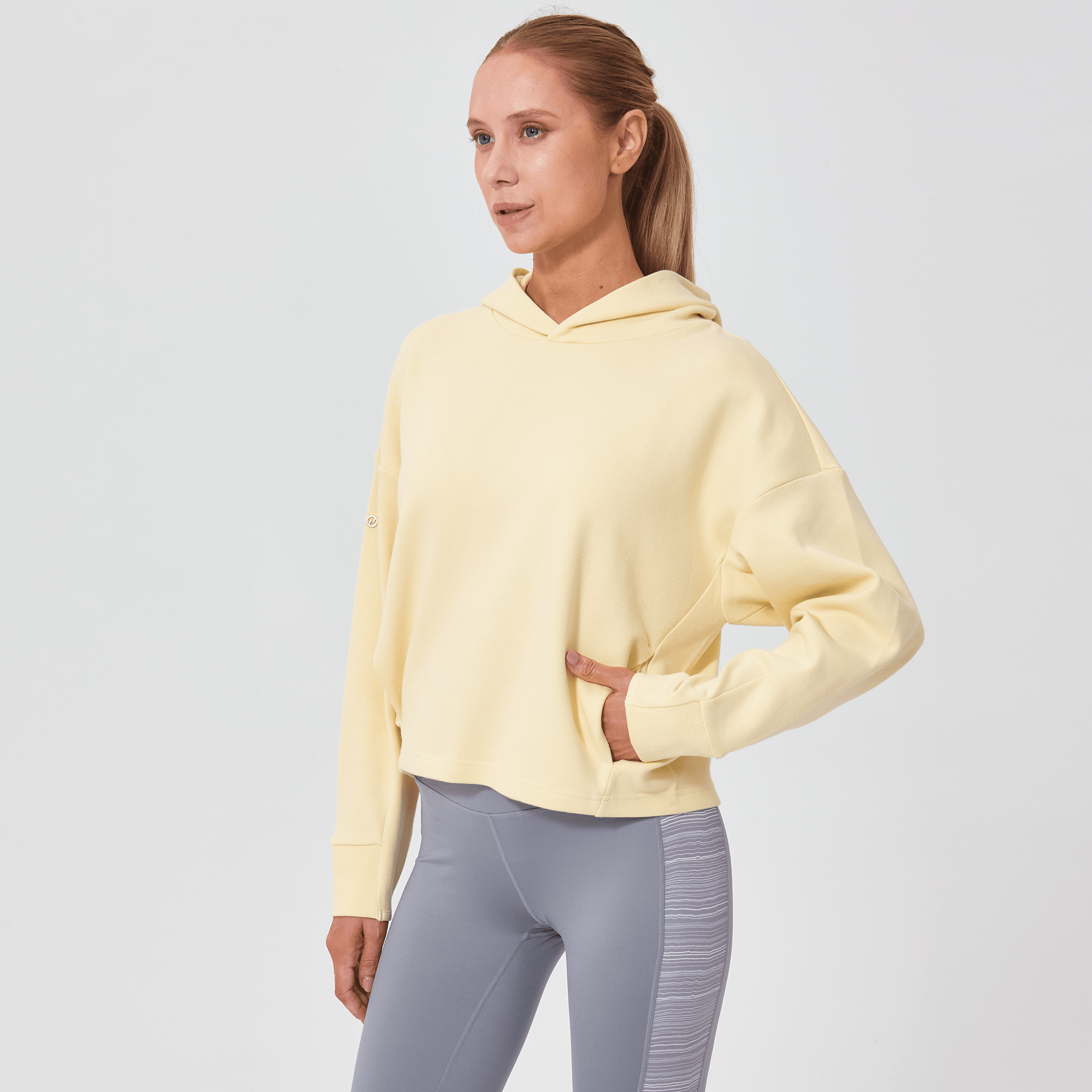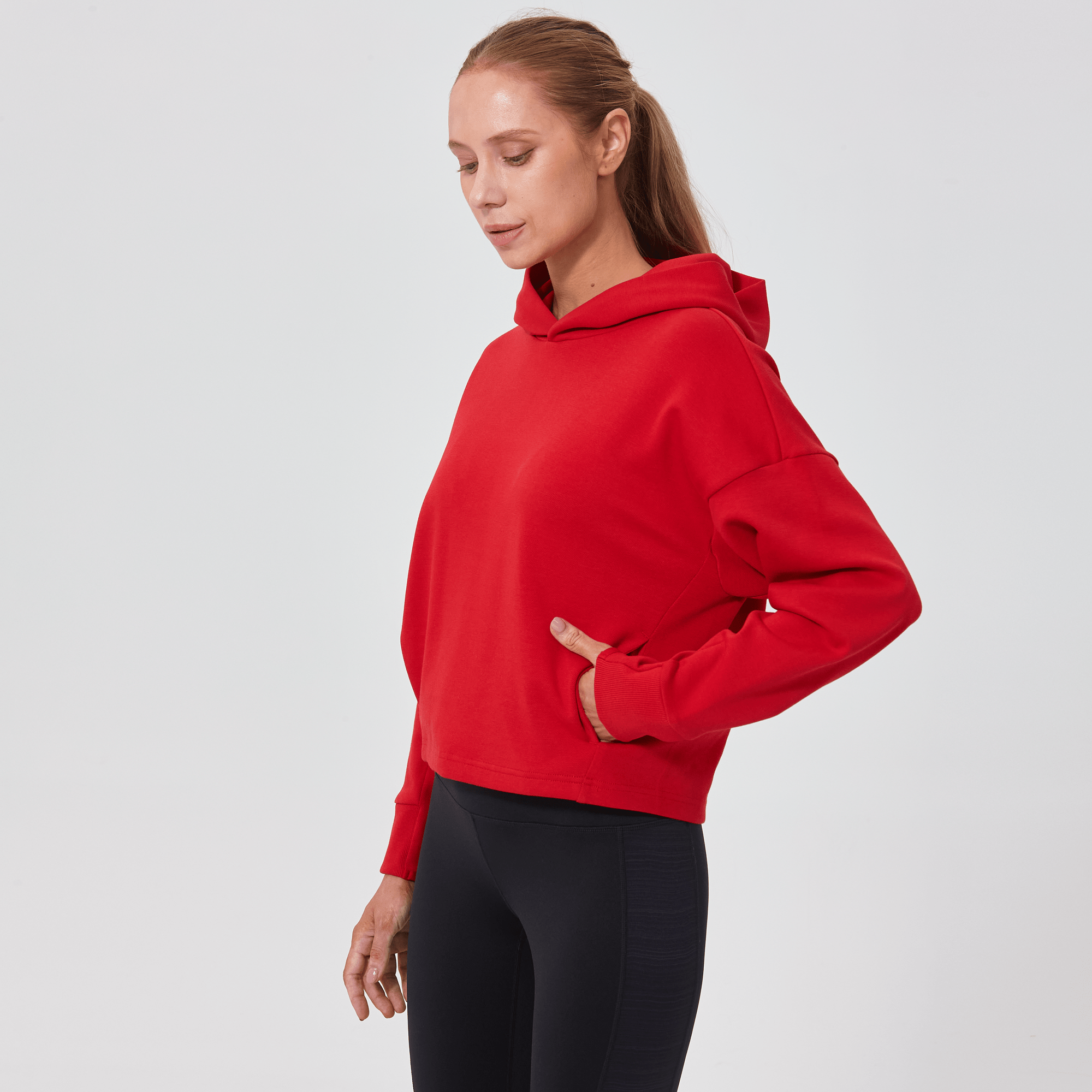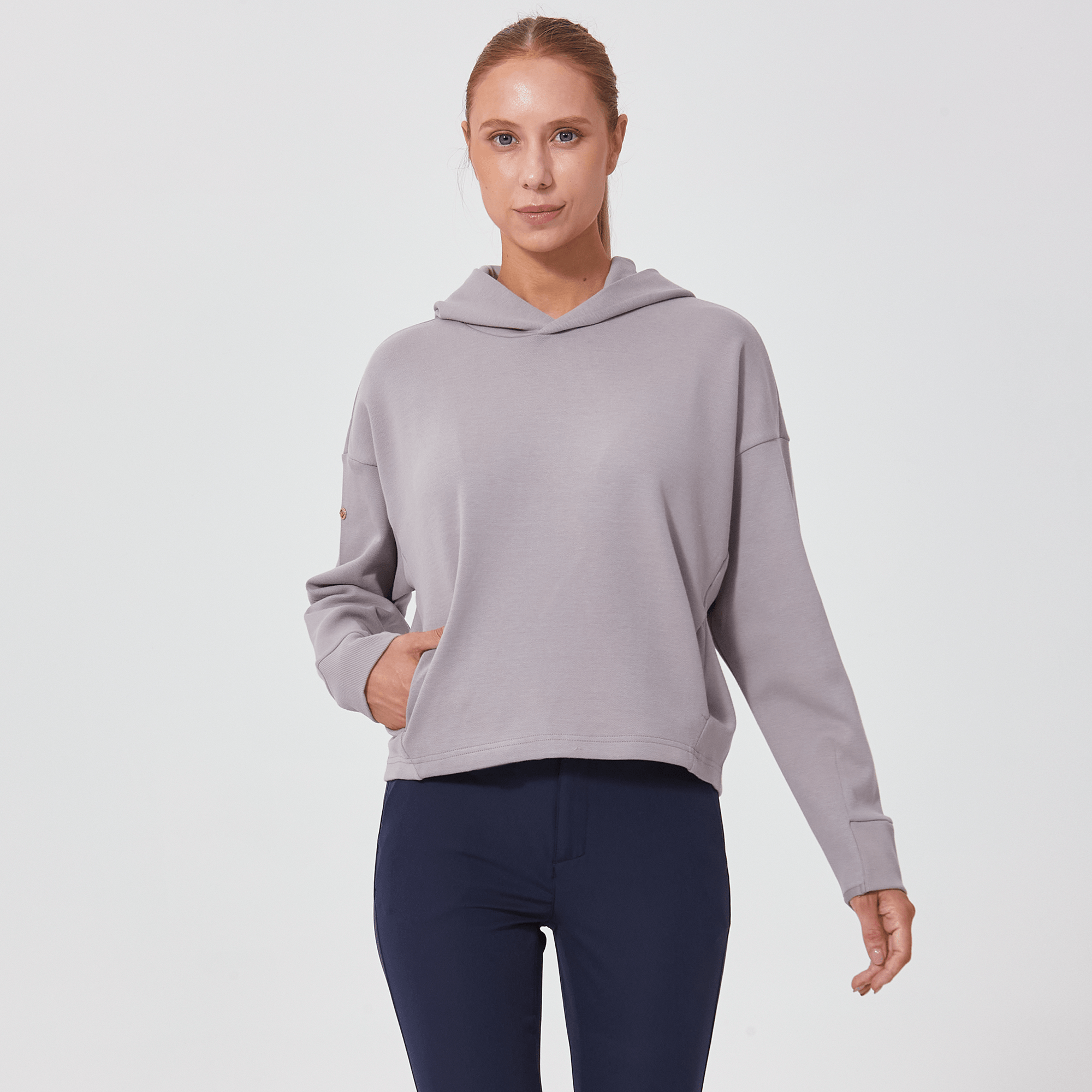 Introducing a piece that combines modern style with ultimate comfort: the latest addition to our collection features a drop shoulder and cropped body silhouette for a contemporary, relaxed look. The design includes a single panel double-layered hood that adds a sleek, cozy touch, perfect for cooler days. Enhanced with forward shoulder and side seams, this top offers a flattering fit while incorporating inseam pockets for functionality without compromising style. The sleeves are thoughtfully designed with ribbed trims, elastic binding, and darted seams, ensuring a snug fit that moves with you. Crafted from a soft blend of 79% cotton, 17% polyester, and 4% spandex, this garment provides stretch, comfort, and durability, making it a versatile staple for any casual wardrobe.