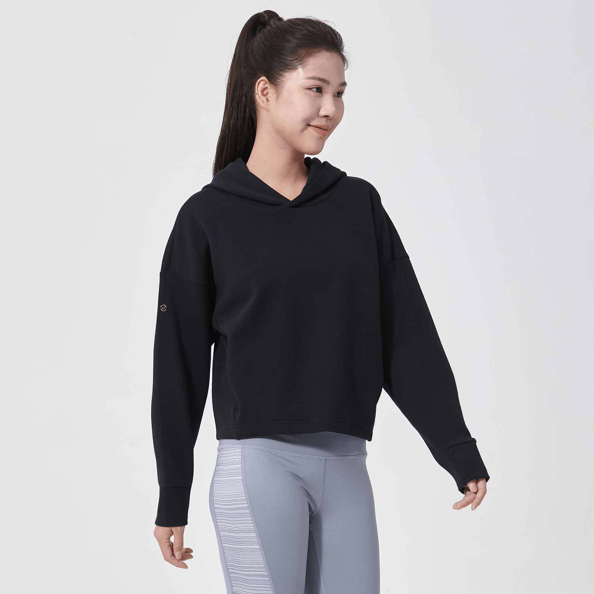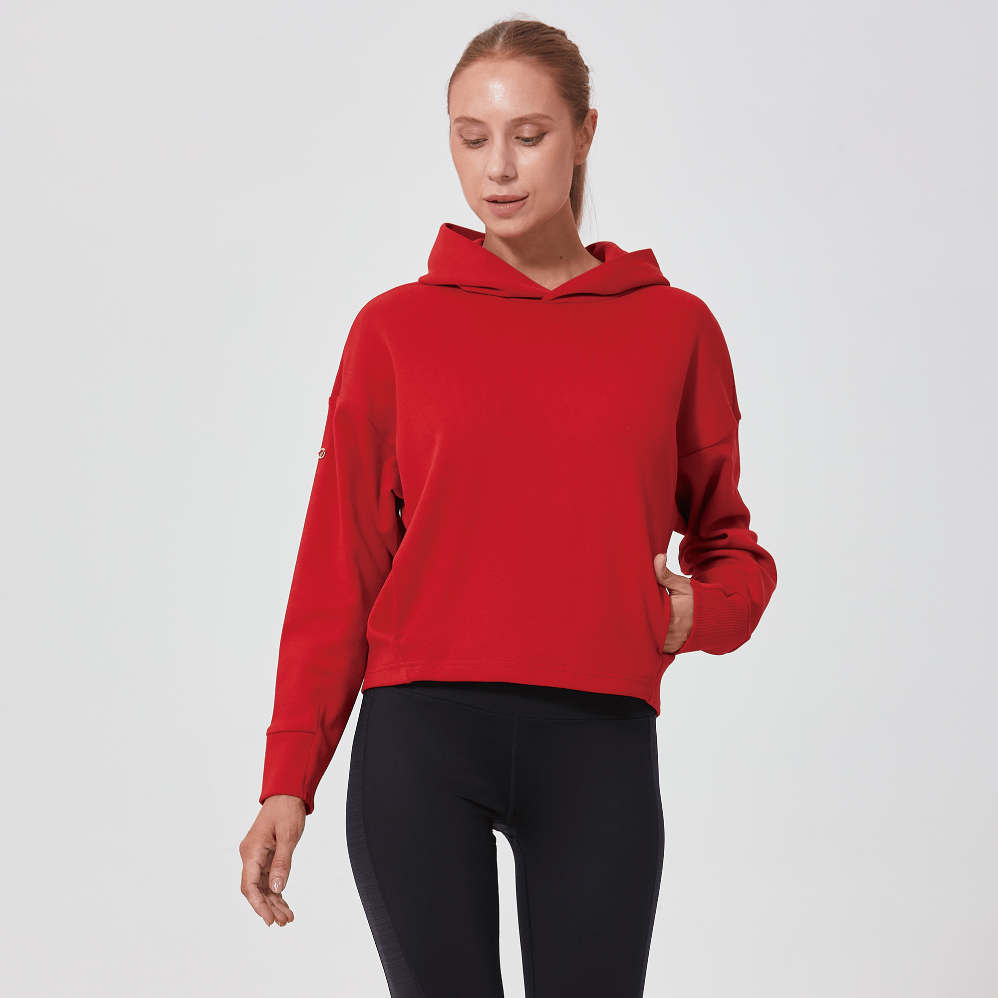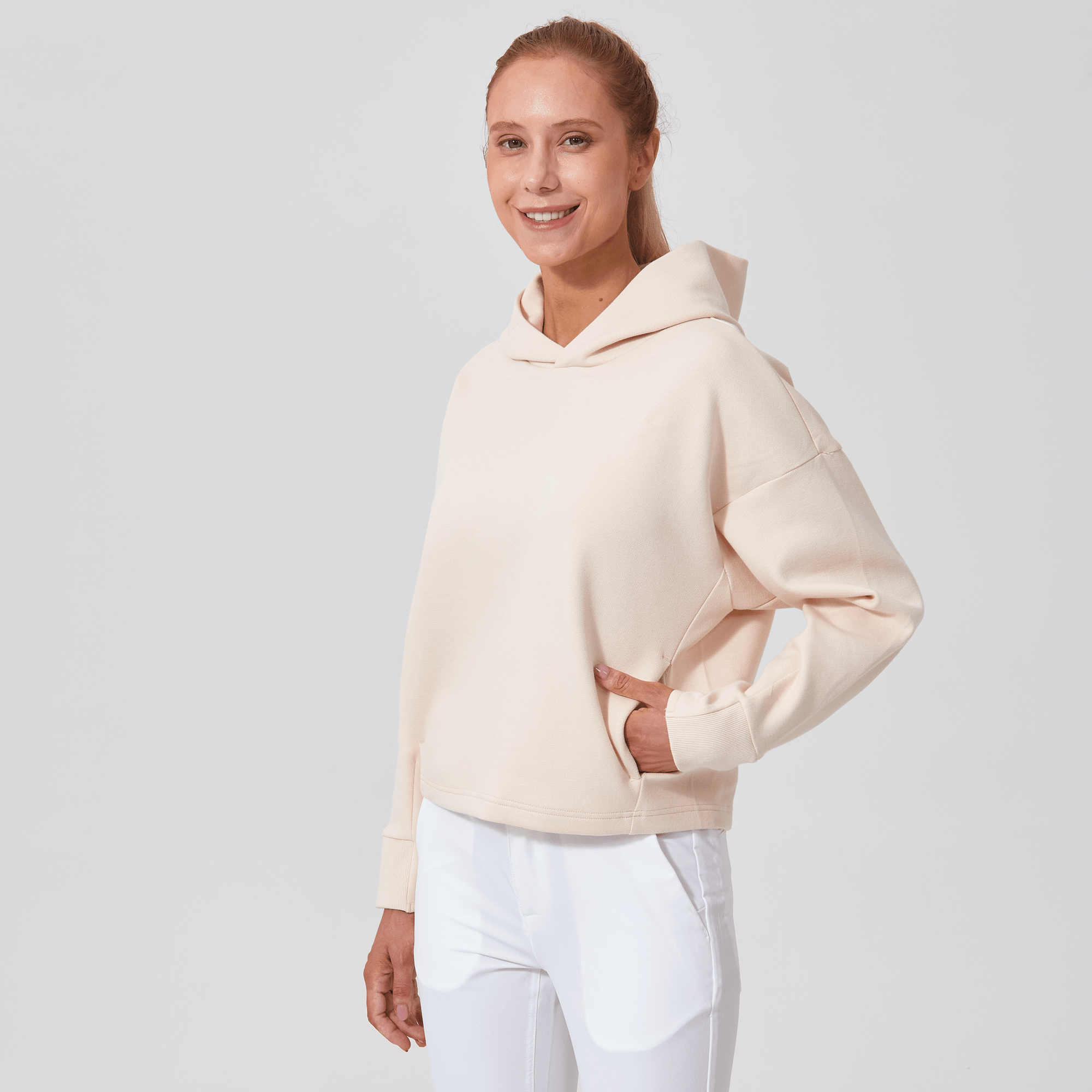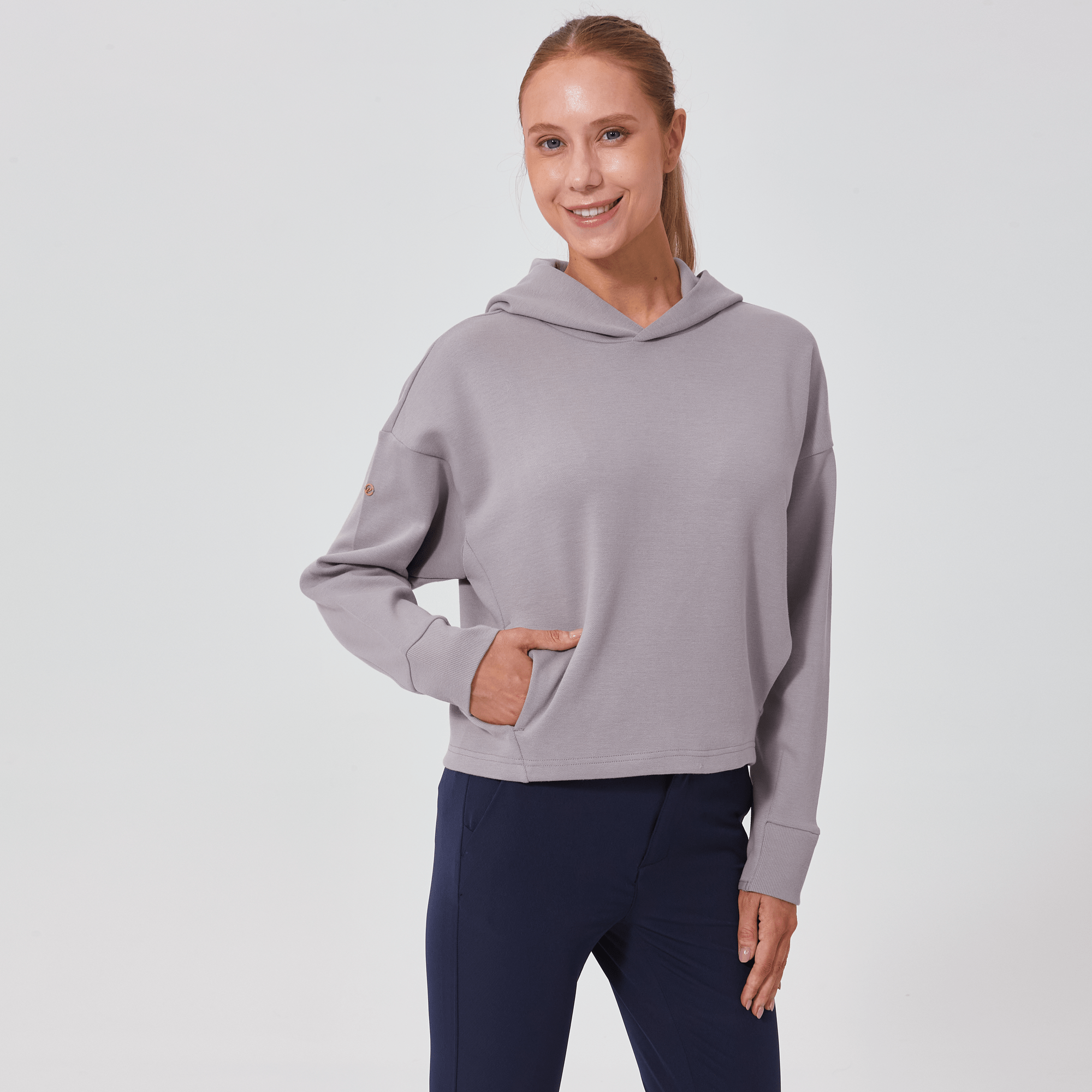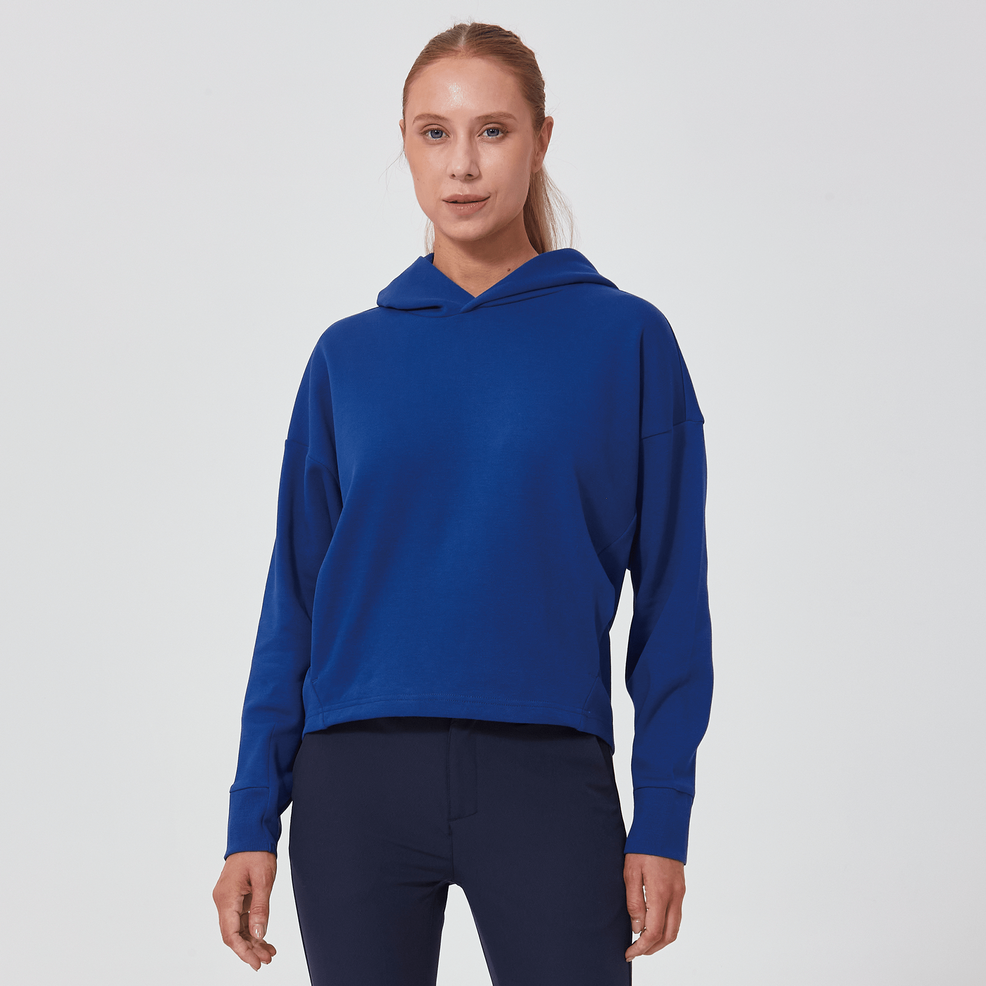 Introducing a piece that combines modern style with ultimate comfort: the latest addition to our collection features a drop shoulder and cropped body silhouette for a contemporary, relaxed look. The design includes a single panel double-layered hood that adds a sleek, cozy touch, perfect for cooler days. Enhanced with forward shoulder and side seams, this top offers a flattering fit while incorporating inseam pockets for functionality without compromising style. The sleeves are thoughtfully designed with ribbed trims, elastic binding, and darted seams, ensuring a snug fit that moves with you. Crafted from a soft blend of 79% cotton, 17% polyester, and 4% spandex, this garment provides stretch, comfort, and durability, making it a versatile staple for any casual wardrobe.