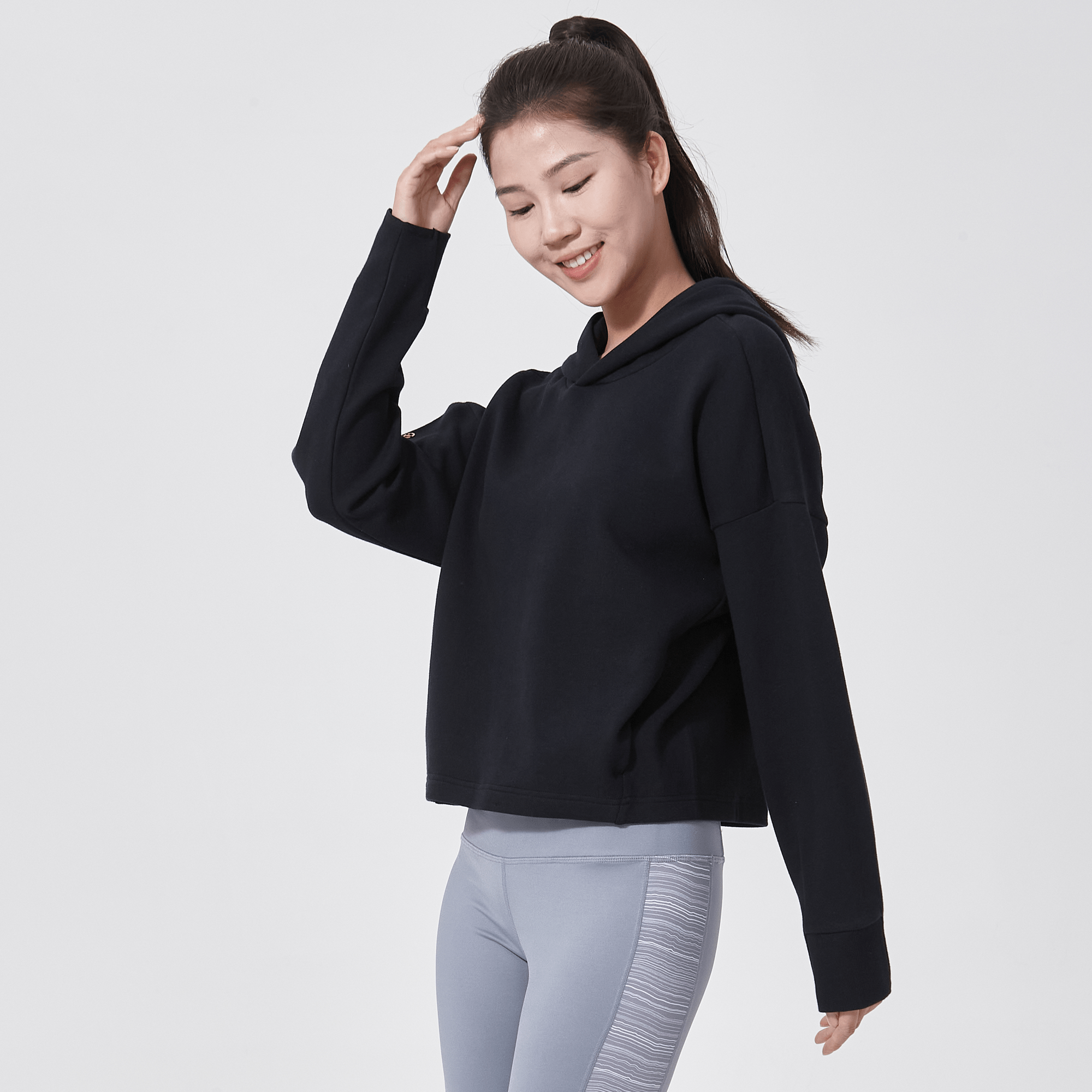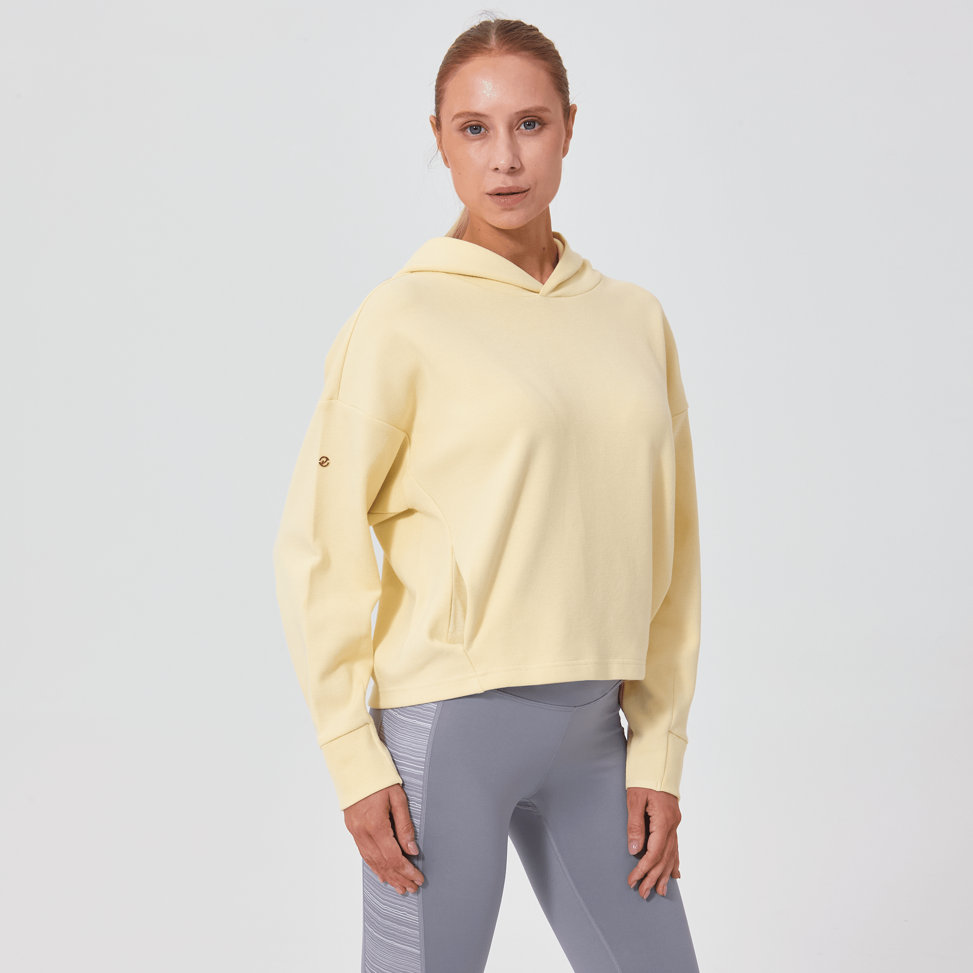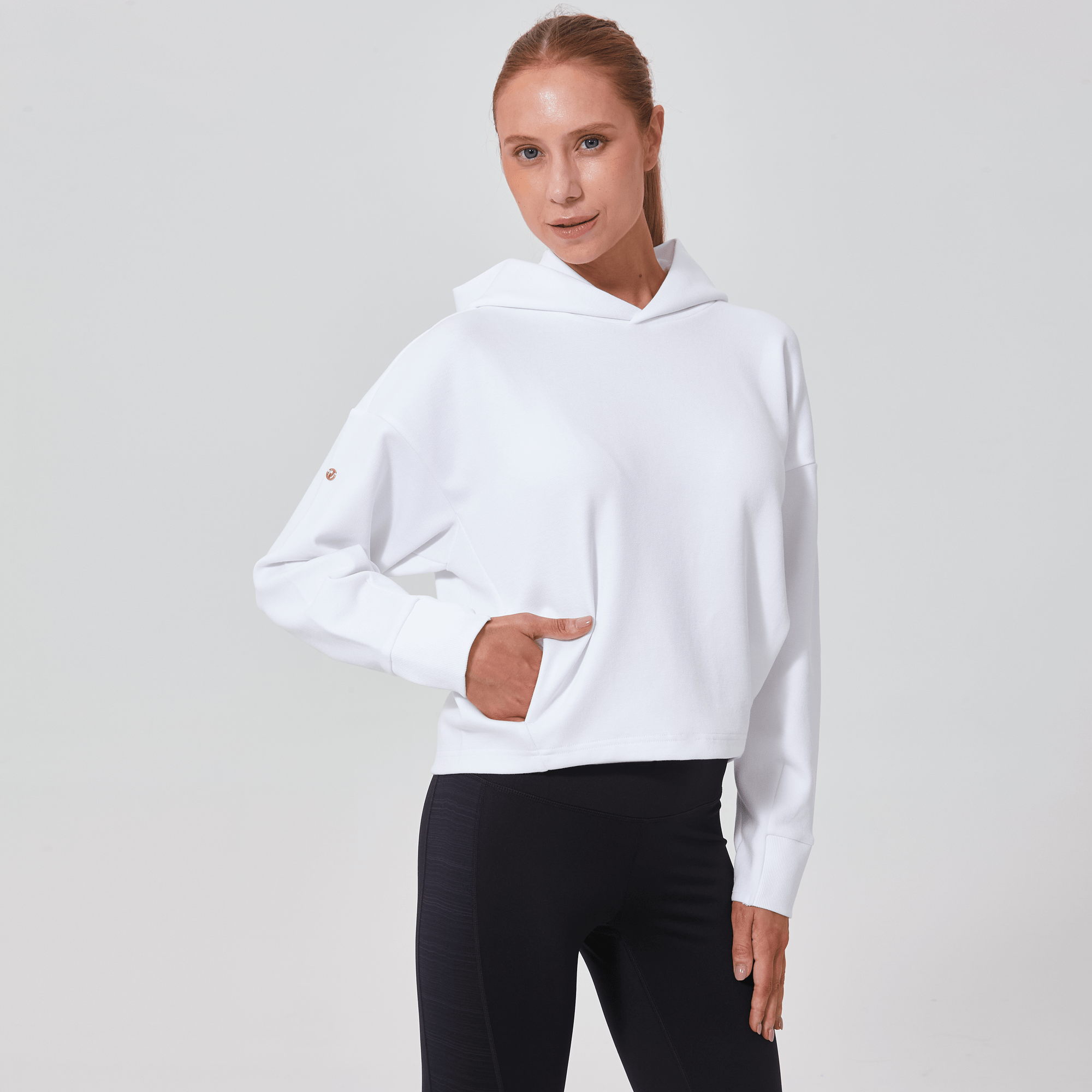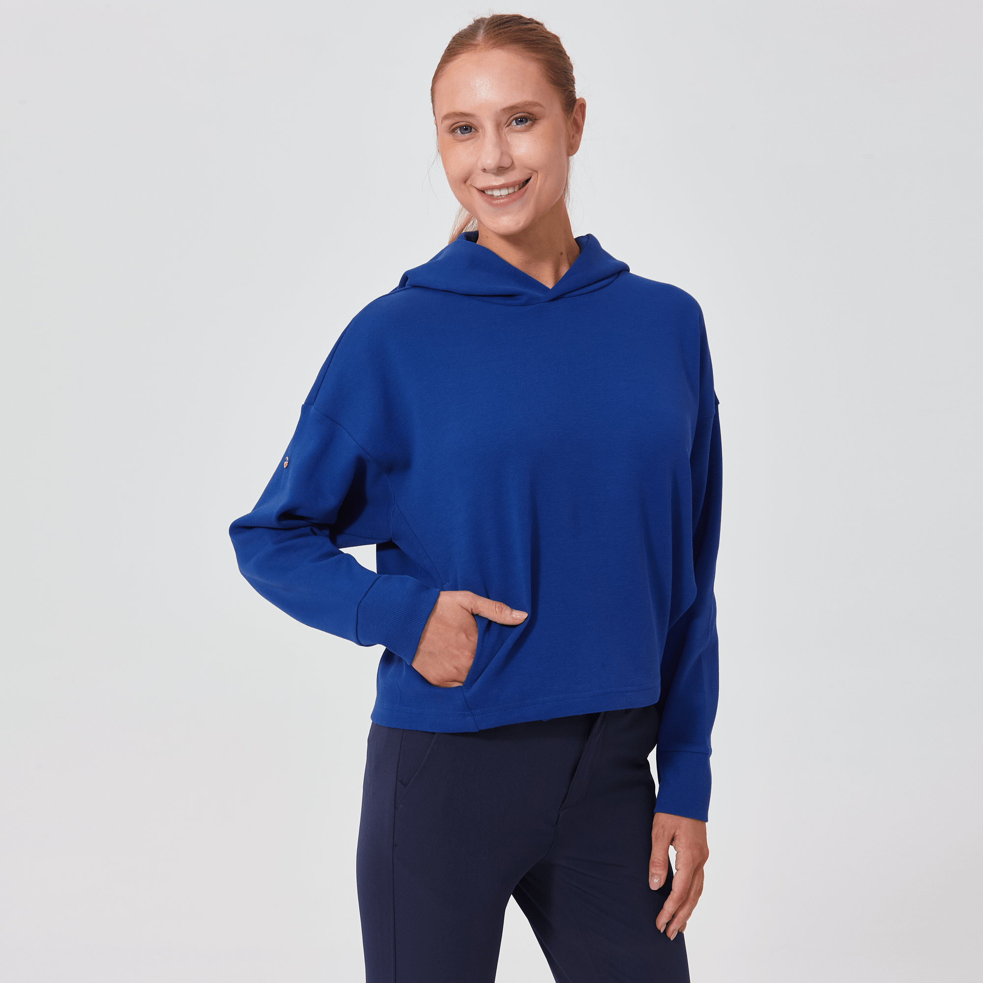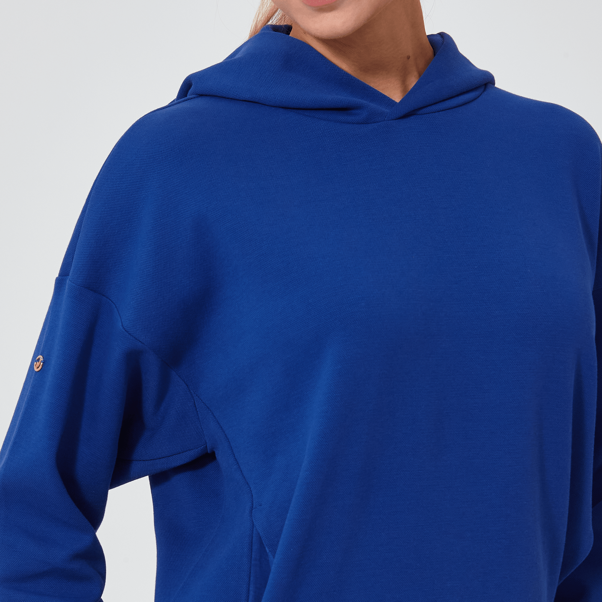 Introducing a piece that combines modern style with ultimate comfort: the latest addition to our collection features a drop shoulder and cropped body silhouette for a contemporary, relaxed look. The design includes a single panel double-layered hood that adds a sleek, cozy touch, perfect for cooler days. Enhanced with forward shoulder and side seams, this top offers a flattering fit while incorporating inseam pockets for functionality without compromising style. The sleeves are thoughtfully designed with ribbed trims, elastic binding, and darted seams, ensuring a snug fit that moves with you. Crafted from a soft blend of 79% cotton, 17% polyester, and 4% spandex, this garment provides stretch, comfort, and durability, making it a versatile staple for any casual wardrobe.