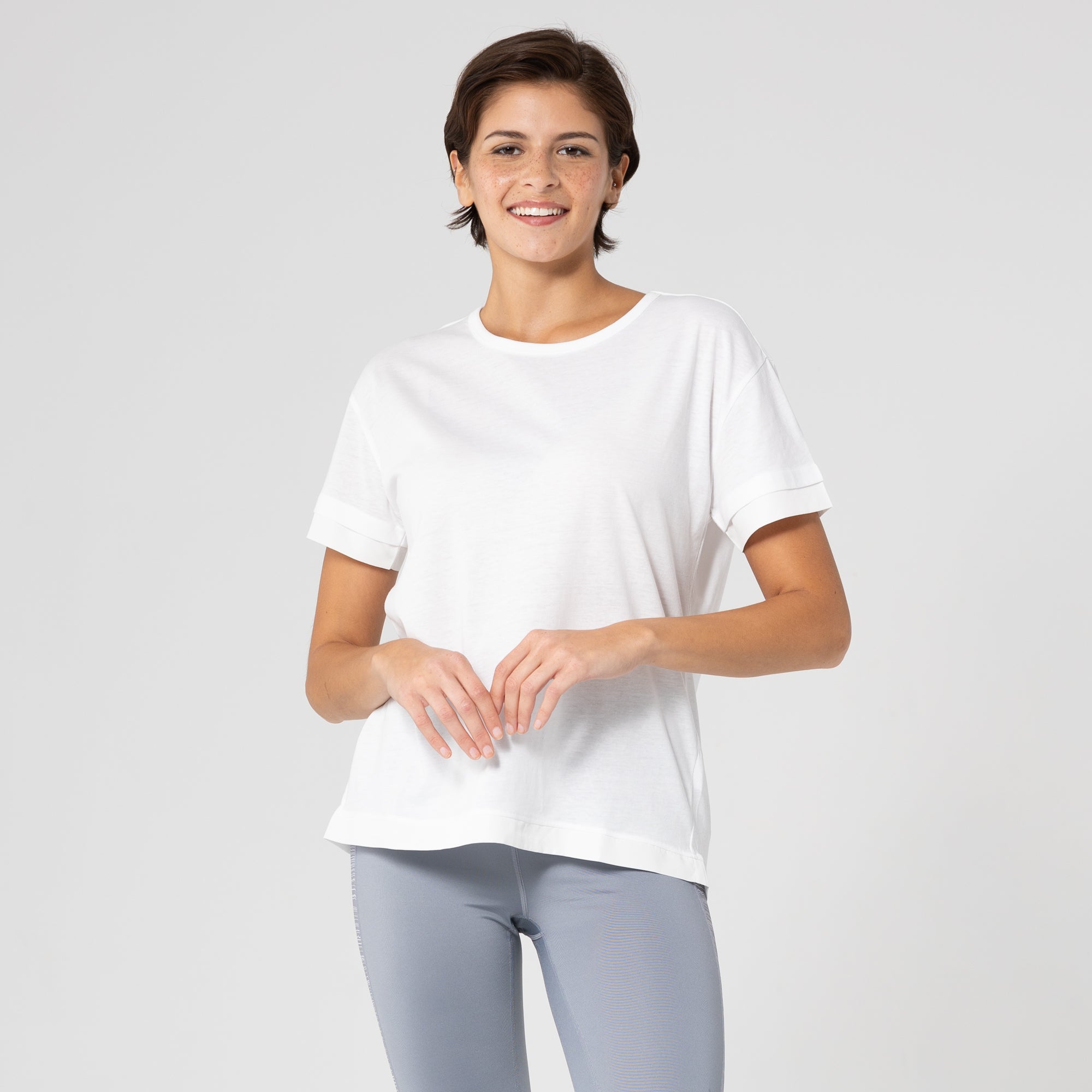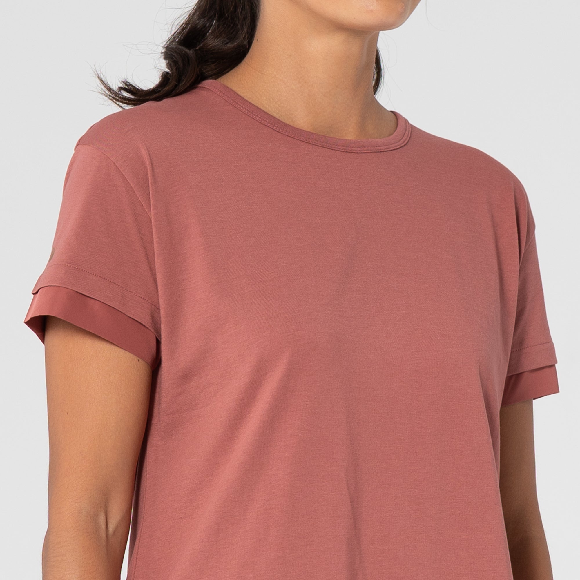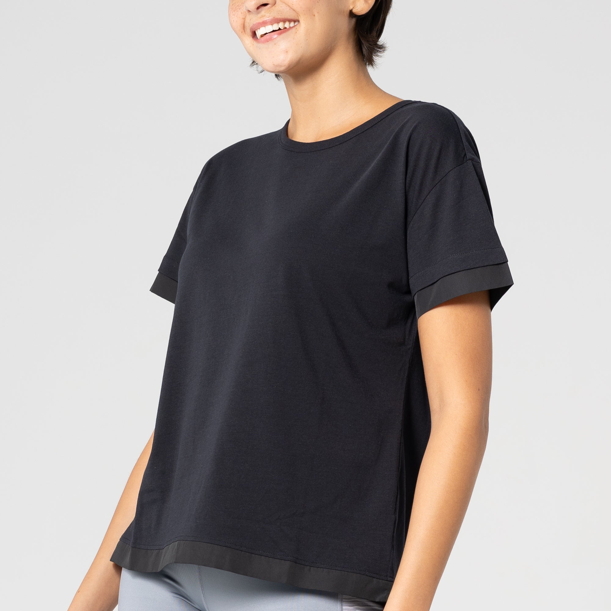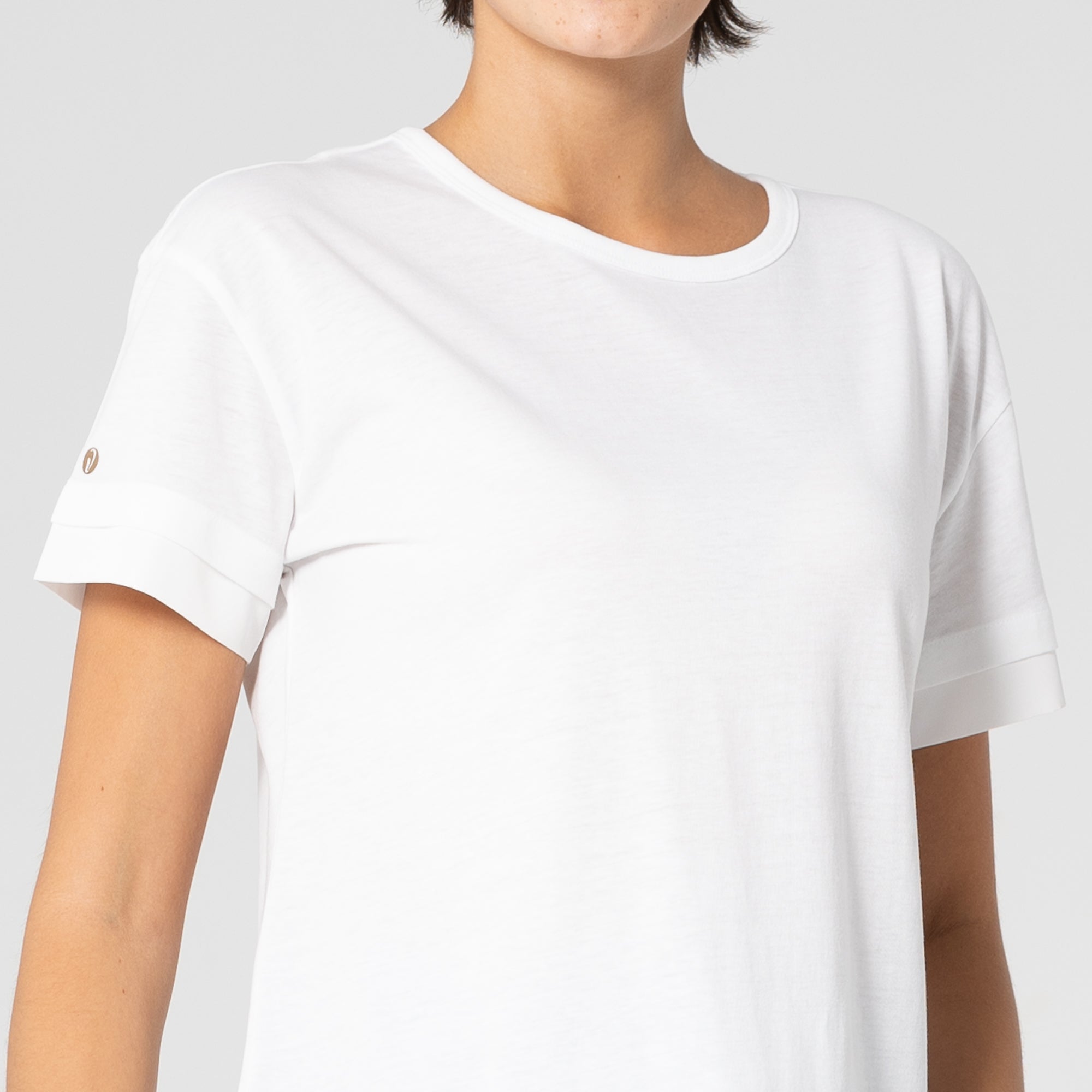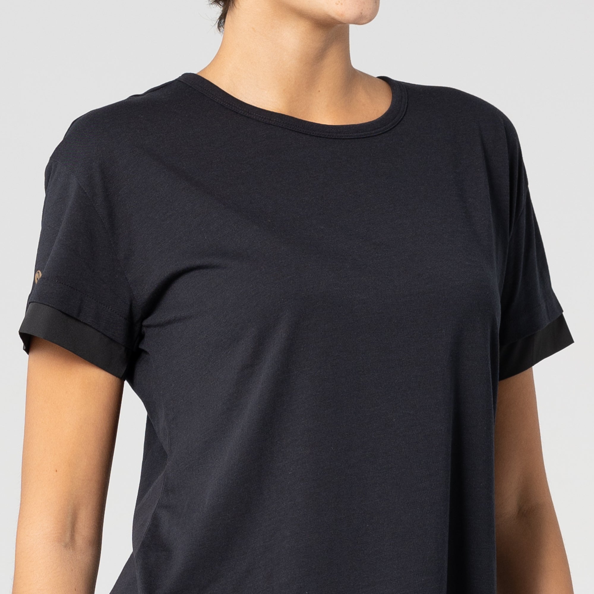 The Tulip top features a drop shoulder flowy silhouette that drapes gracefully, offering a flattering and comfortable fit for all body types. The open pleat design at the center back introduces an element of refined detail, adding visual interest and enhancing the top's airy feel. Contrasting semi-dull woven trim at the sleeve openings and body hem frames the piece with a subtle yet distinct touch, complementing the overall design. Made from a blend of 65% polyester and 35% cotton, the Tulip is soft to the touch and durable, perfect for both relaxed days and evenings out.