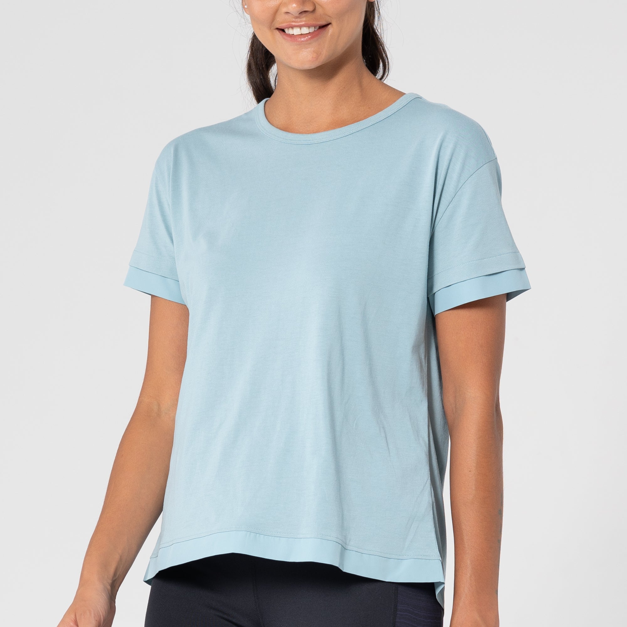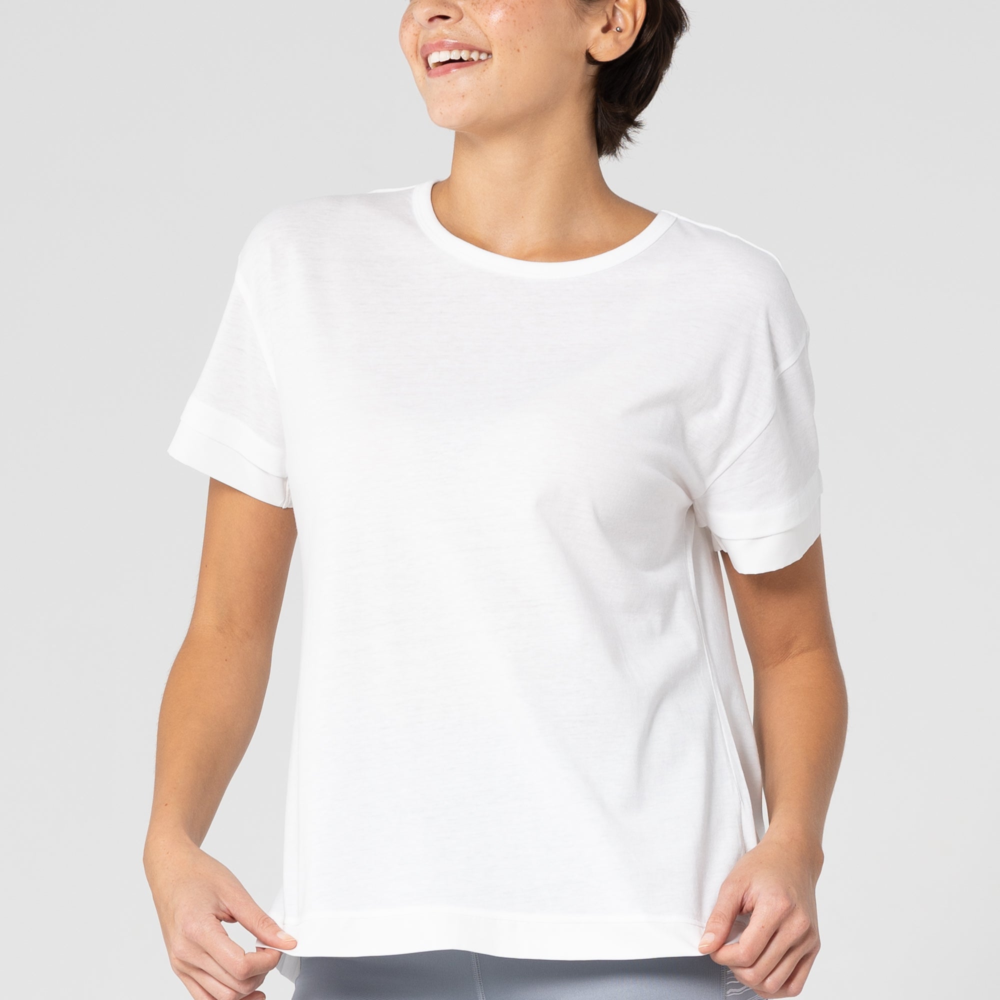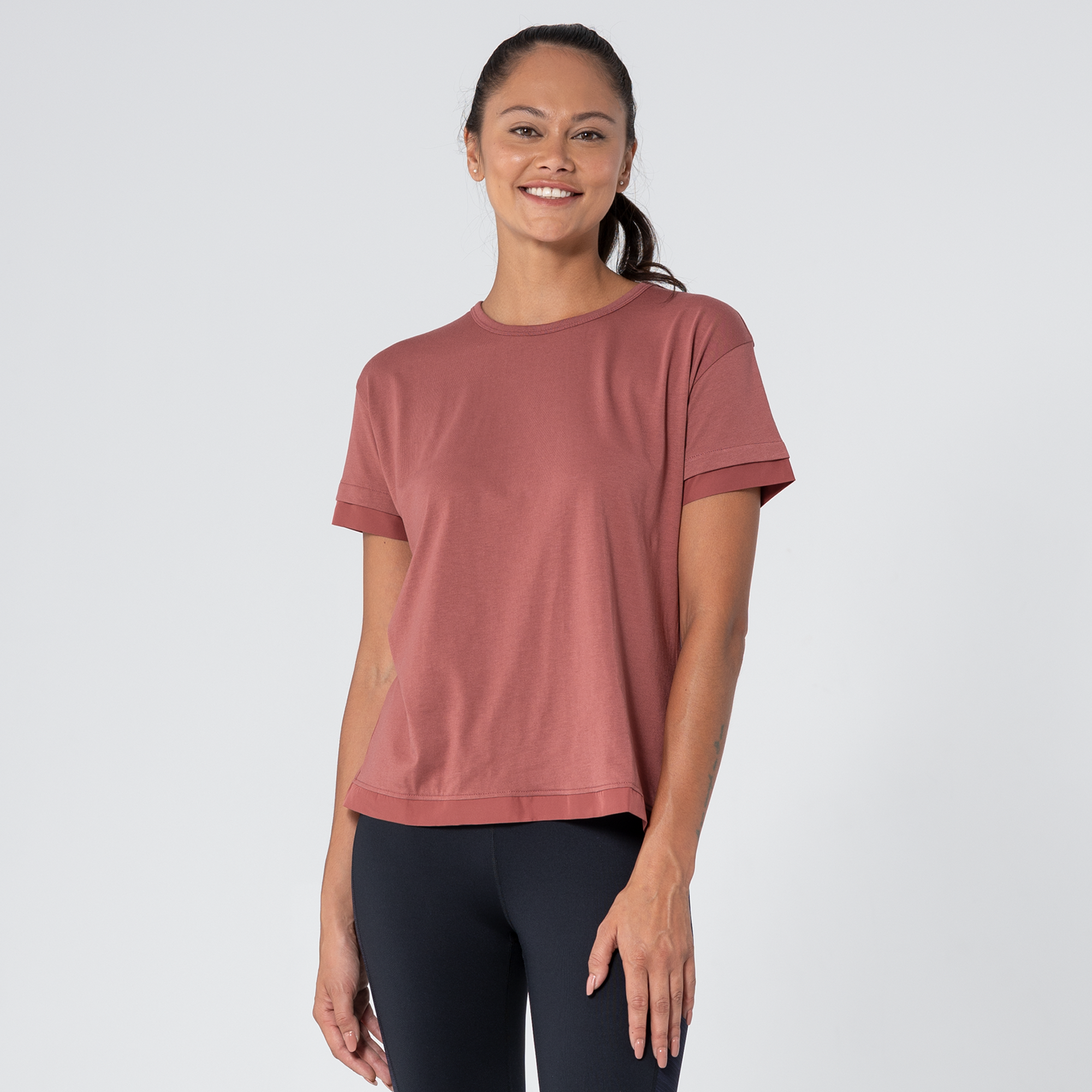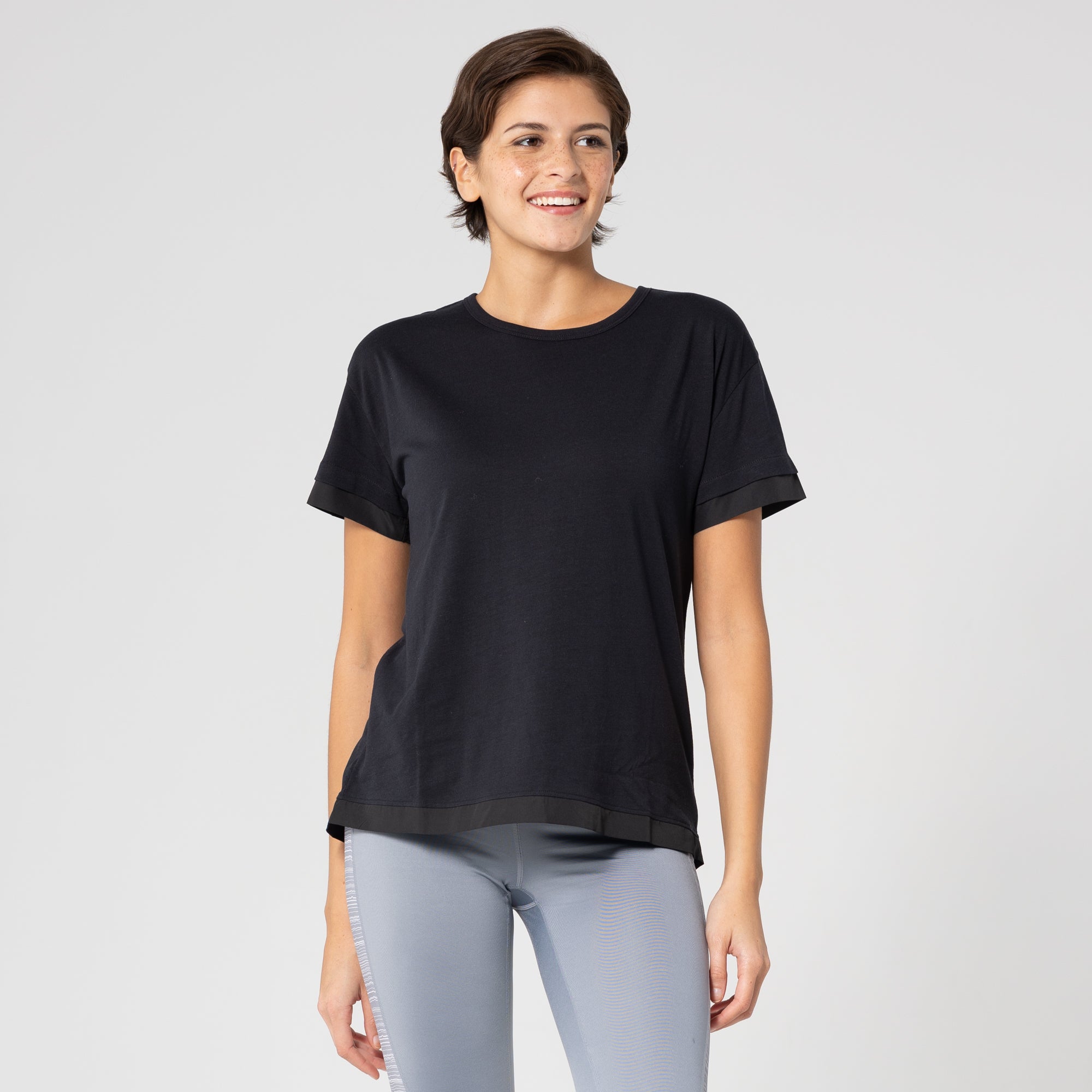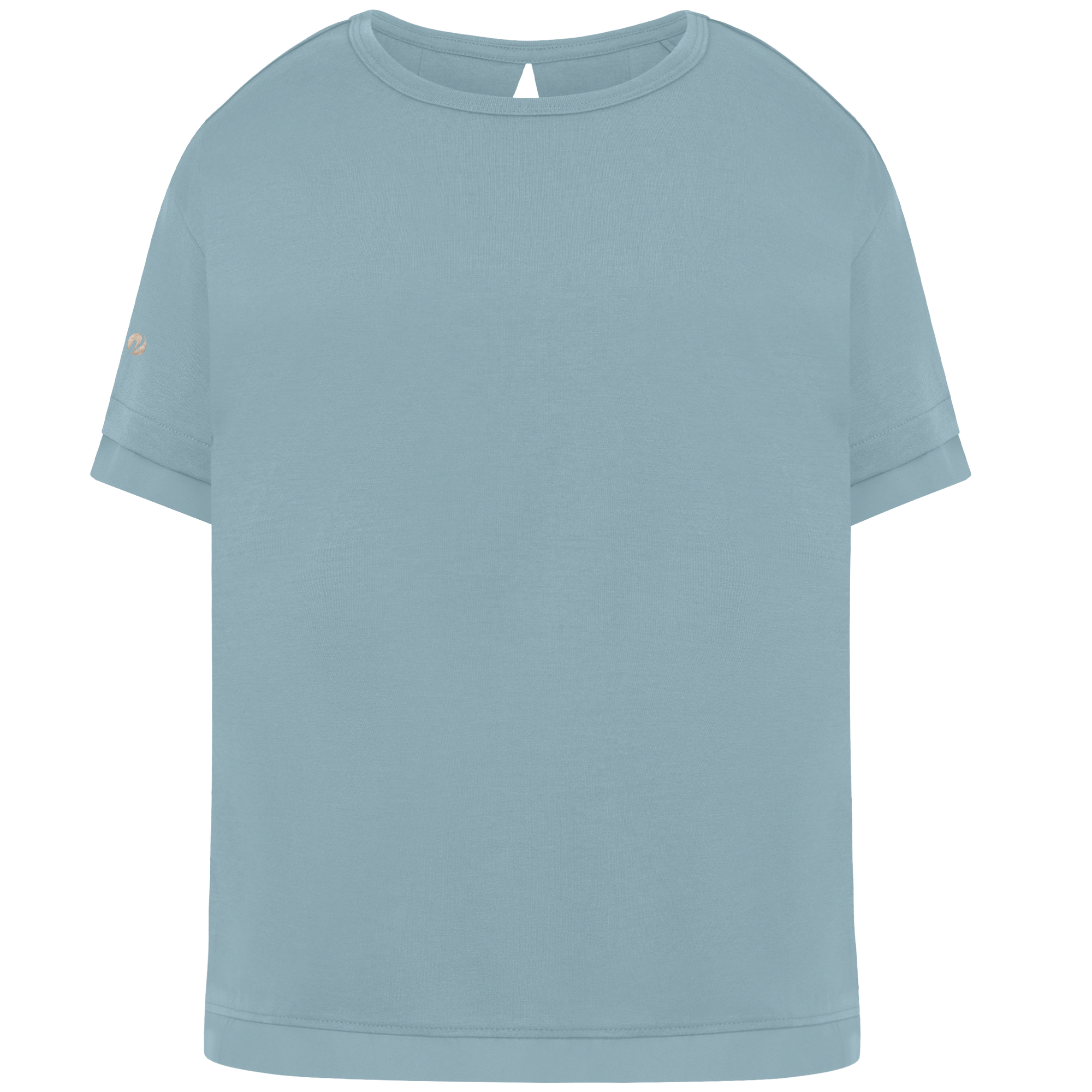 The Tulip top features a drop shoulder flowy silhouette that drapes gracefully, offering a flattering and comfortable fit for all body types. The open pleat design at the center back introduces an element of refined detail, adding visual interest and enhancing the top's airy feel. Contrasting semi-dull woven trim at the sleeve openings and body hem frames the piece with a subtle yet distinct touch, complementing the overall design. Made from a blend of 65% polyester and 35% cotton, the Tulip is soft to the touch and durable, perfect for both relaxed days and evenings out.