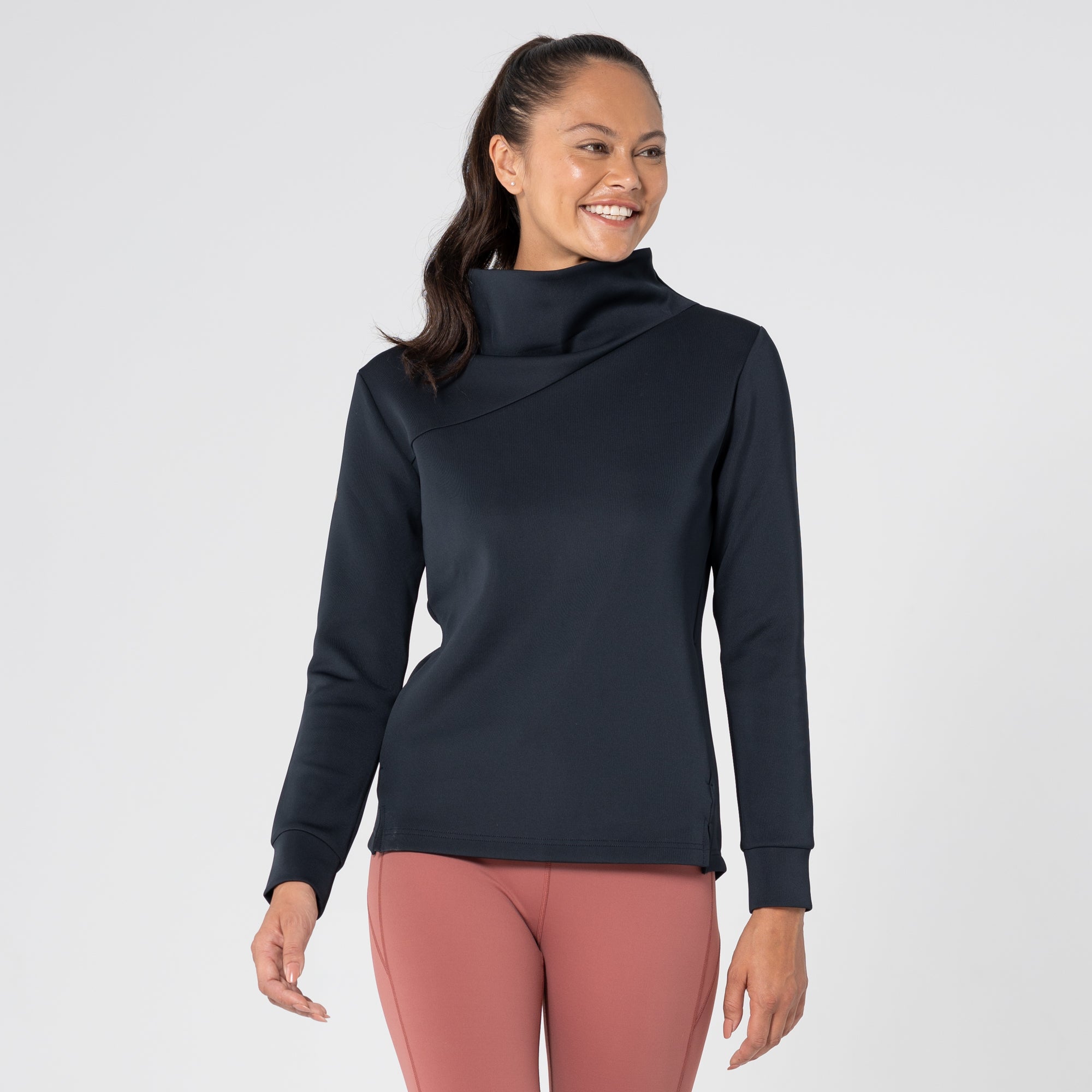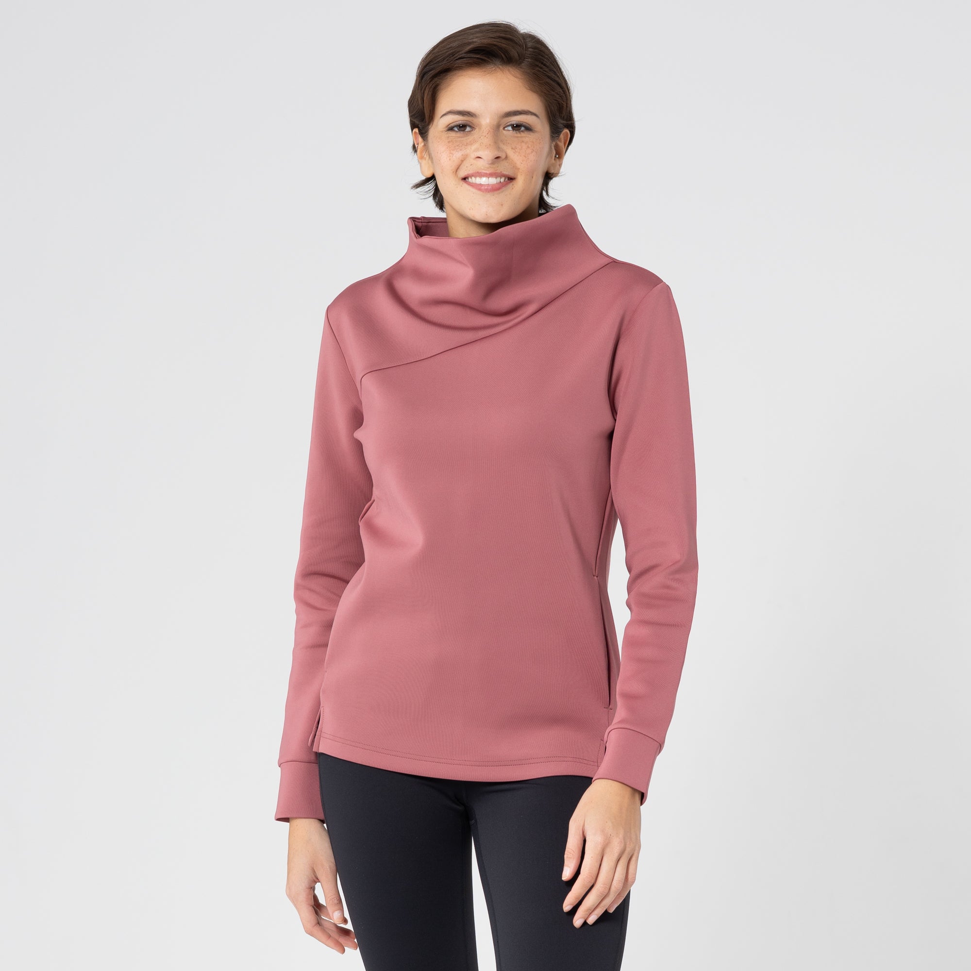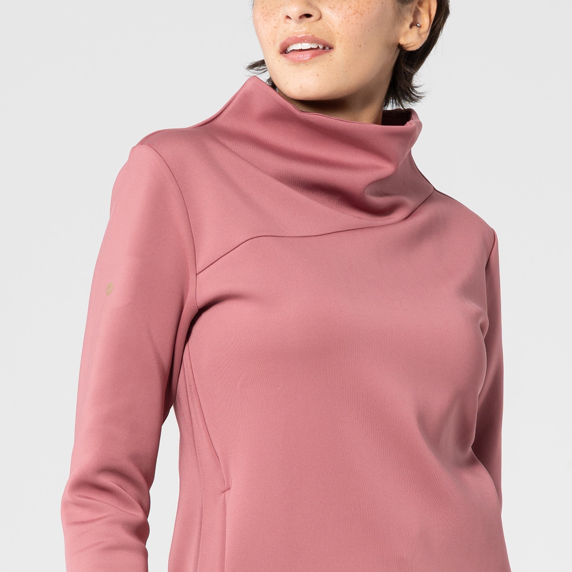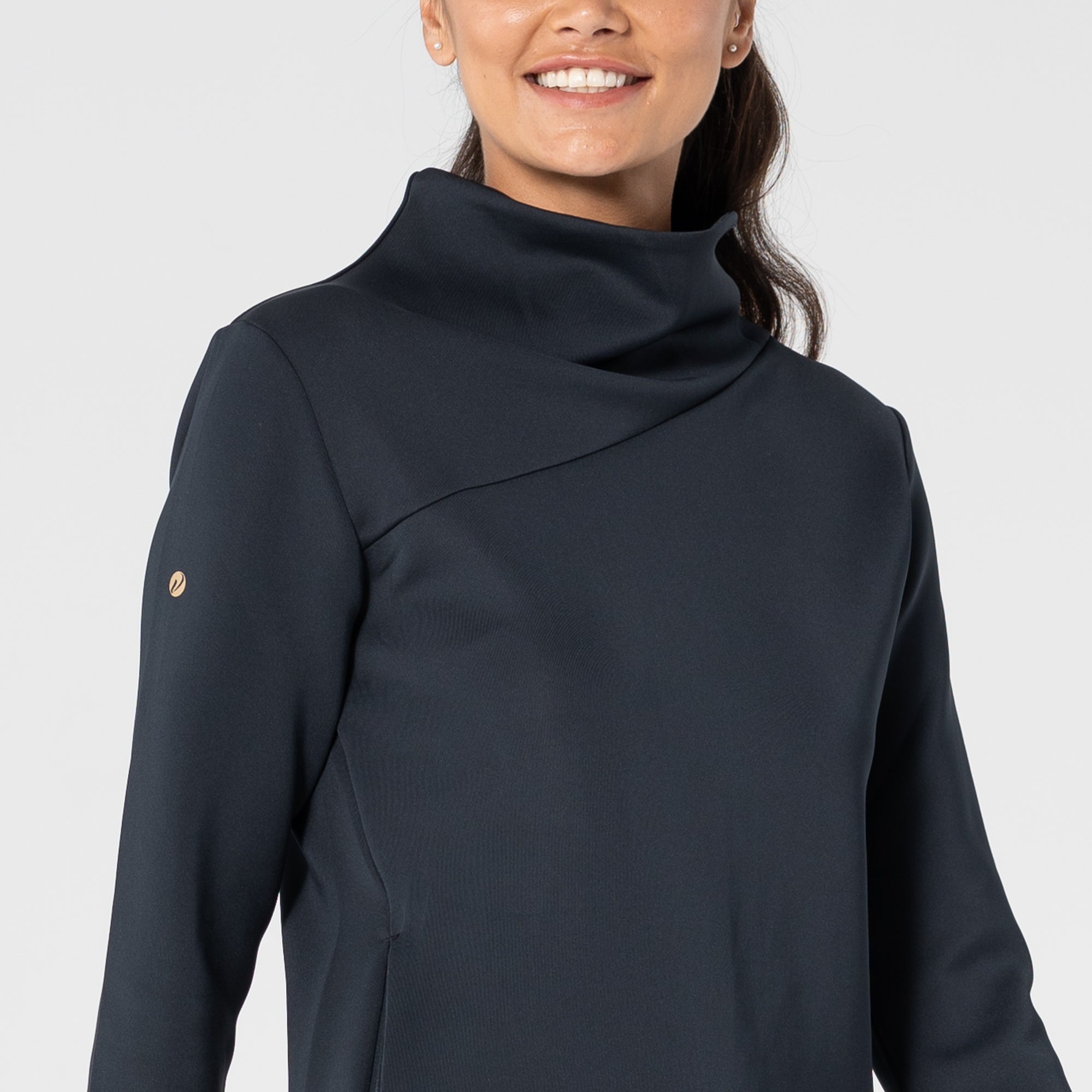 The Vinyard midlayer is designed with a high drapery collar that adds a touch of sophistication and extra warmth, this piece is perfect for layering in cooler weather. The stylized front chest seam provides a unique visual element that enhances the garment's structure and appeal. Two inseam side pockets are seamlessly integrated, offering practical storage without disrupting the sleek silhouette. Open slits at the body hem increase mobility and add an airy, flowing quality to the design. Constructed from a blend of 92% polyester and 8% spandex, the Vinyard midlayer offers stretch and comfort, making it an ideal choice for active days or relaxed evenings.