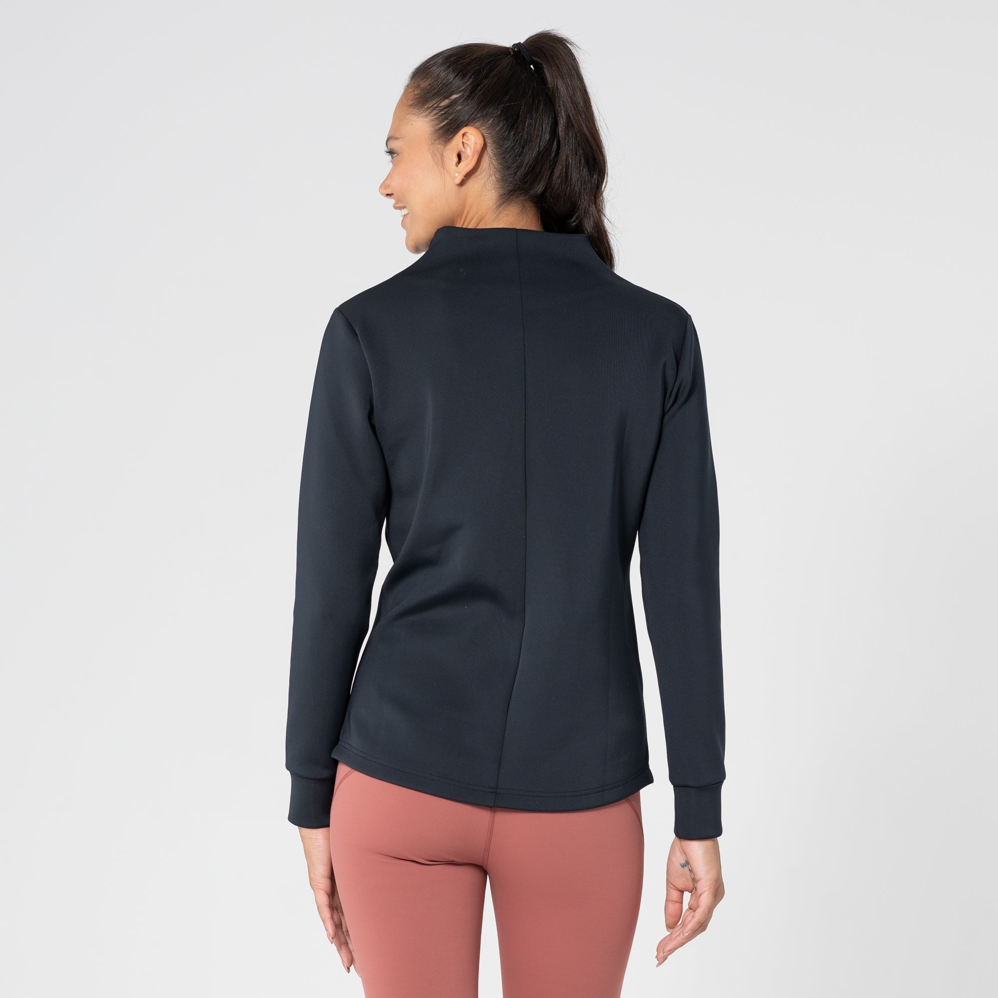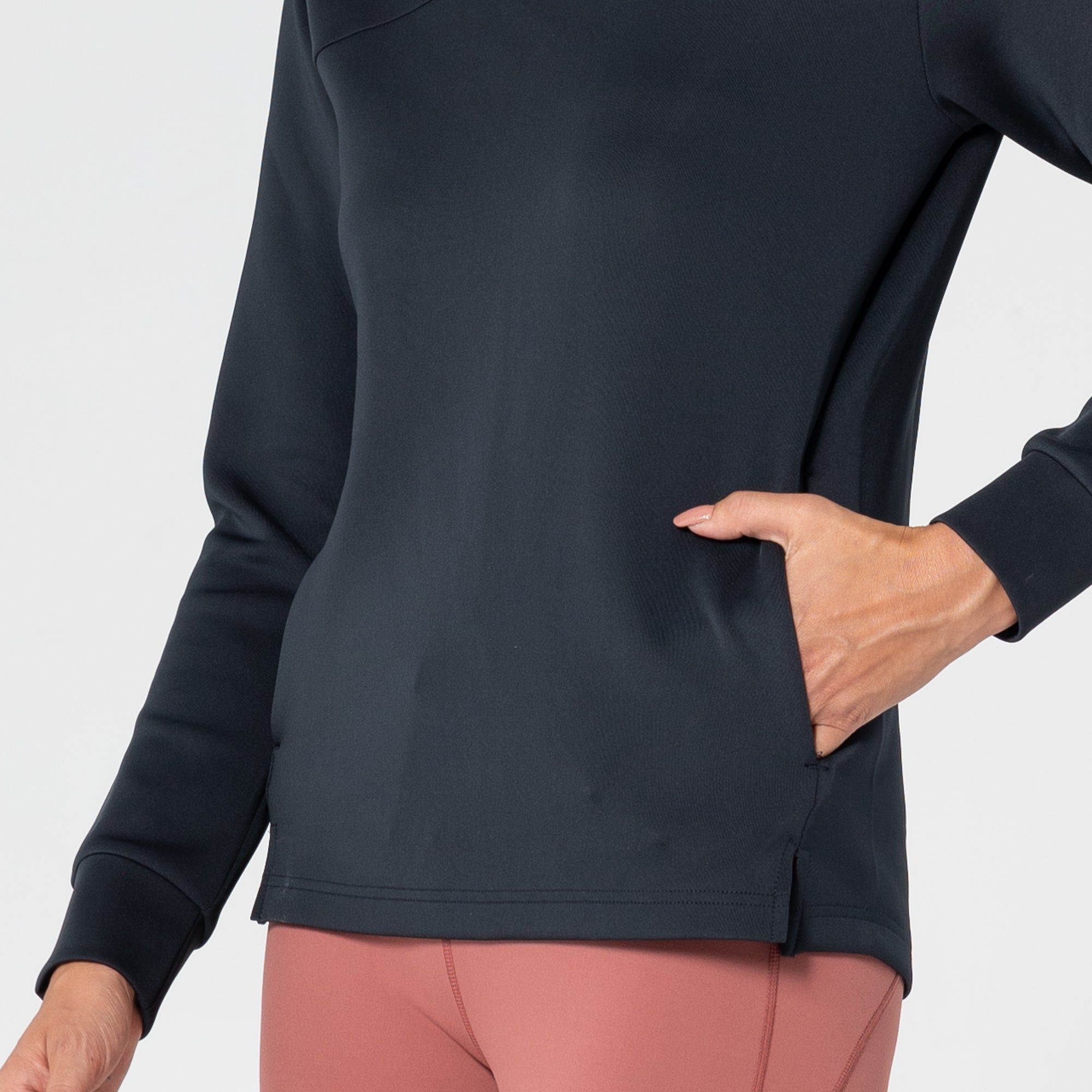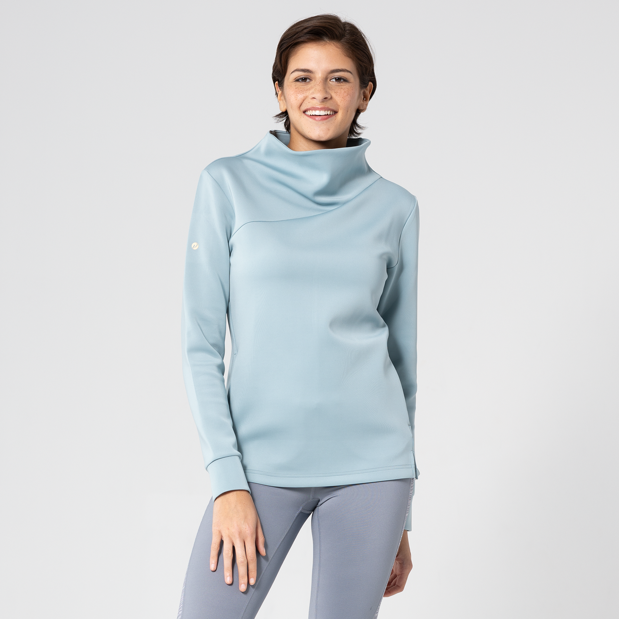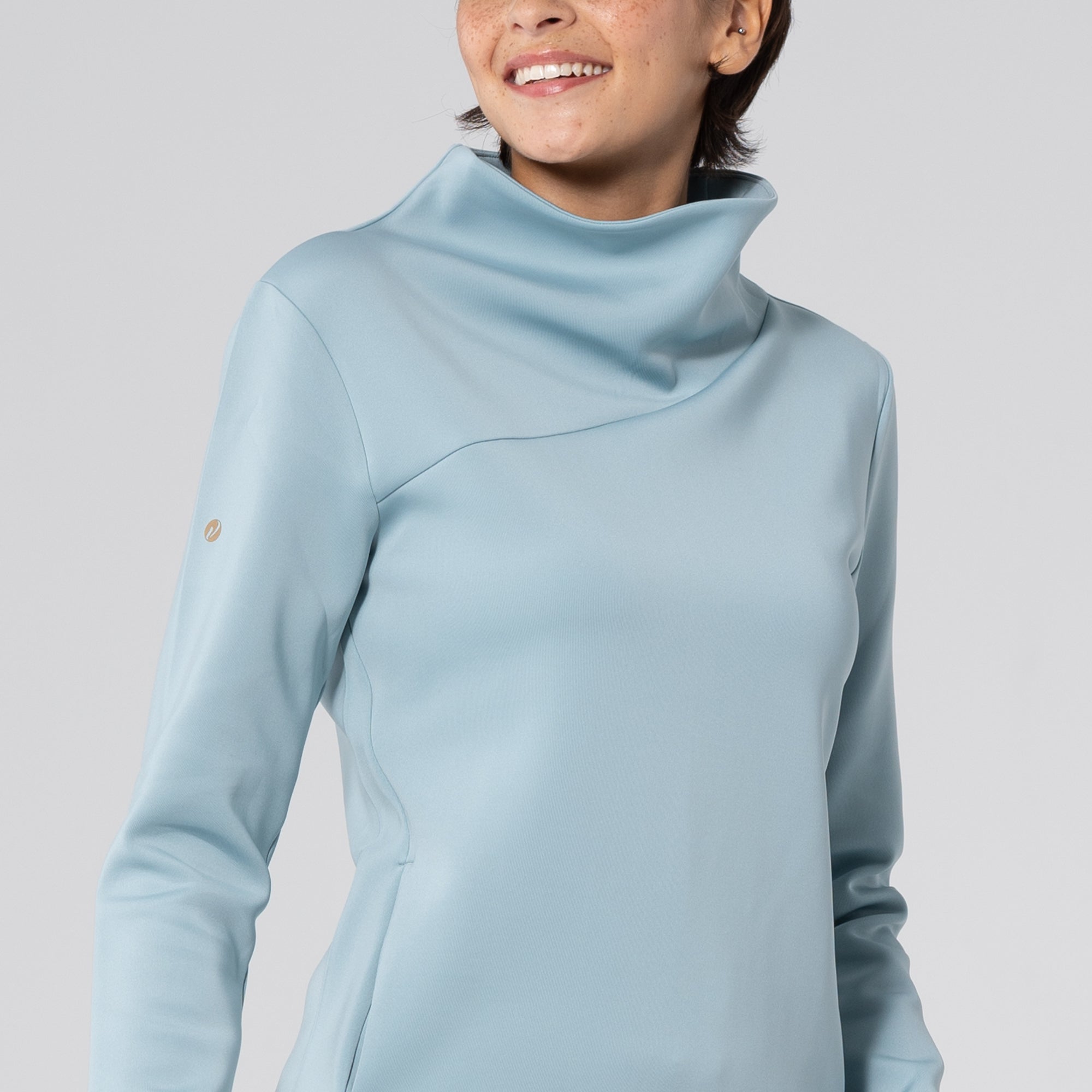 The Vinyard midlayer is designed with a high drapery collar that adds a touch of sophistication and extra warmth, this piece is perfect for layering in cooler weather. The stylized front chest seam provides a unique visual element that enhances the garment's structure and appeal. Two inseam side pockets are seamlessly integrated, offering practical storage without disrupting the sleek silhouette. Open slits at the body hem increase mobility and add an airy, flowing quality to the design. Constructed from a blend of 92% polyester and 8% spandex, the Vinyard midlayer offers stretch and comfort, making it an ideal choice for active days or relaxed evenings.