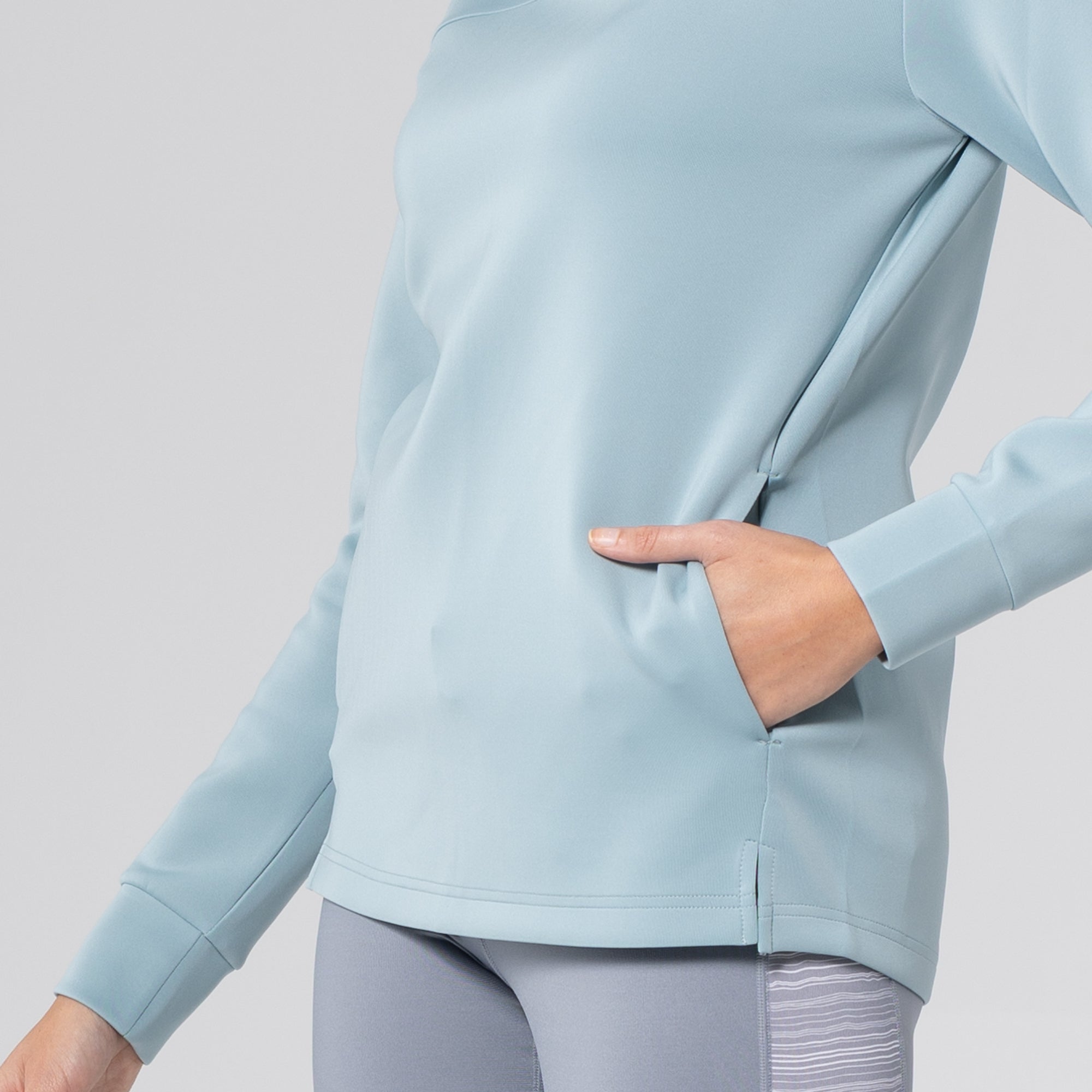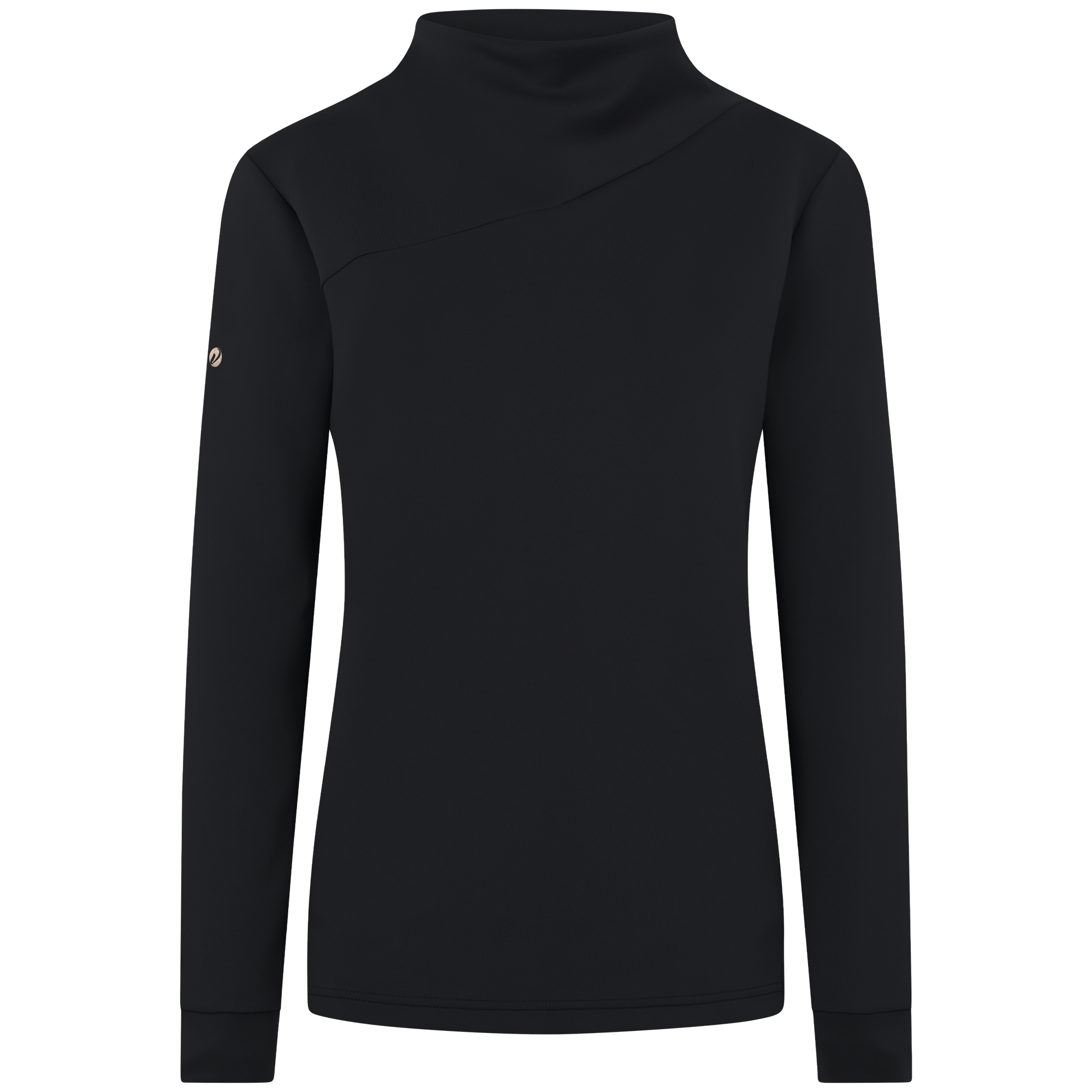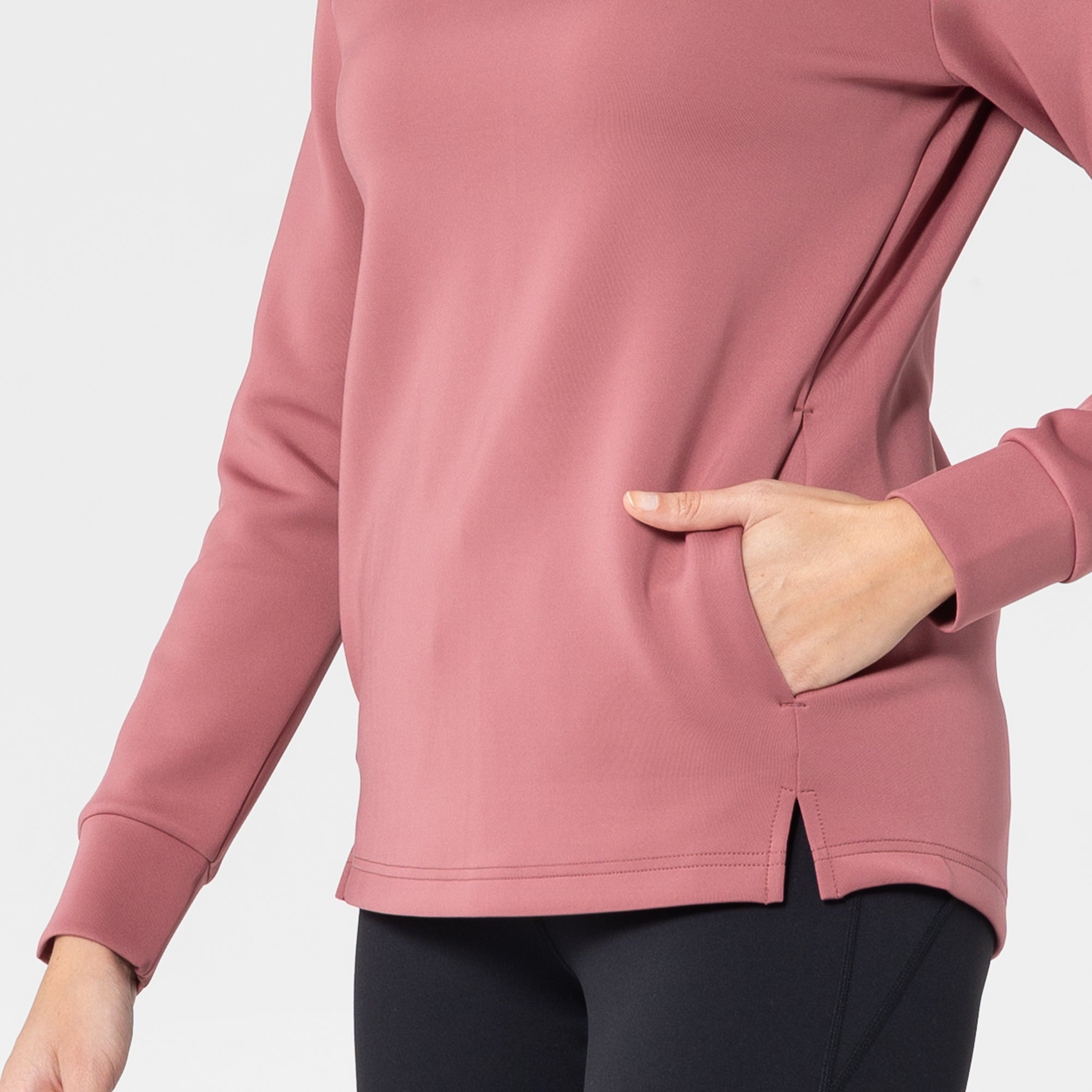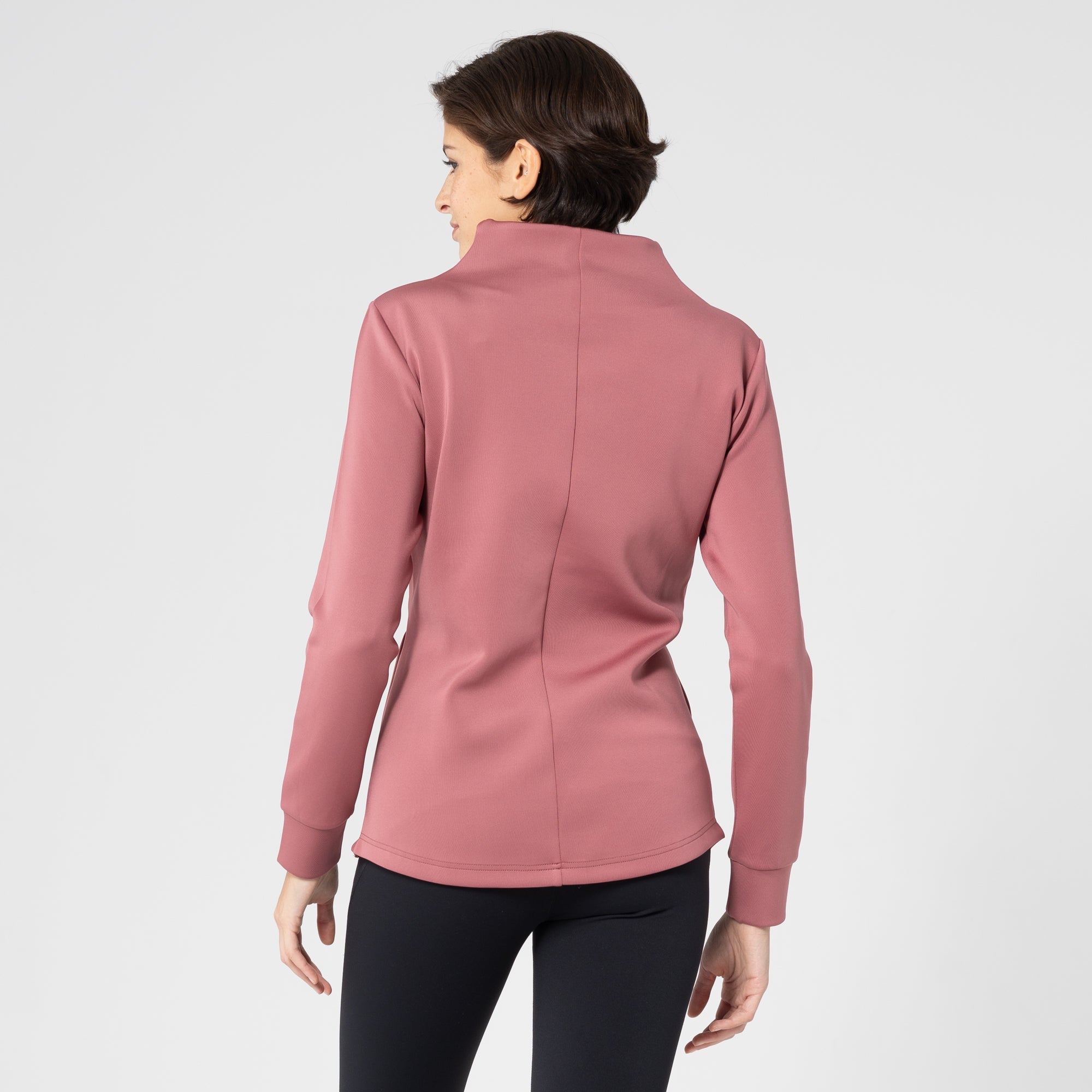 The Vinyard midlayer is designed with a high drapery collar that adds a touch of sophistication and extra warmth, this piece is perfect for layering in cooler weather. The stylized front chest seam provides a unique visual element that enhances the garment's structure and appeal. Two inseam side pockets are seamlessly integrated, offering practical storage without disrupting the sleek silhouette. Open slits at the body hem increase mobility and add an airy, flowing quality to the design. Constructed from a blend of 92% polyester and 8% spandex, the Vinyard midlayer offers stretch and comfort, making it an ideal choice for active days or relaxed evenings.